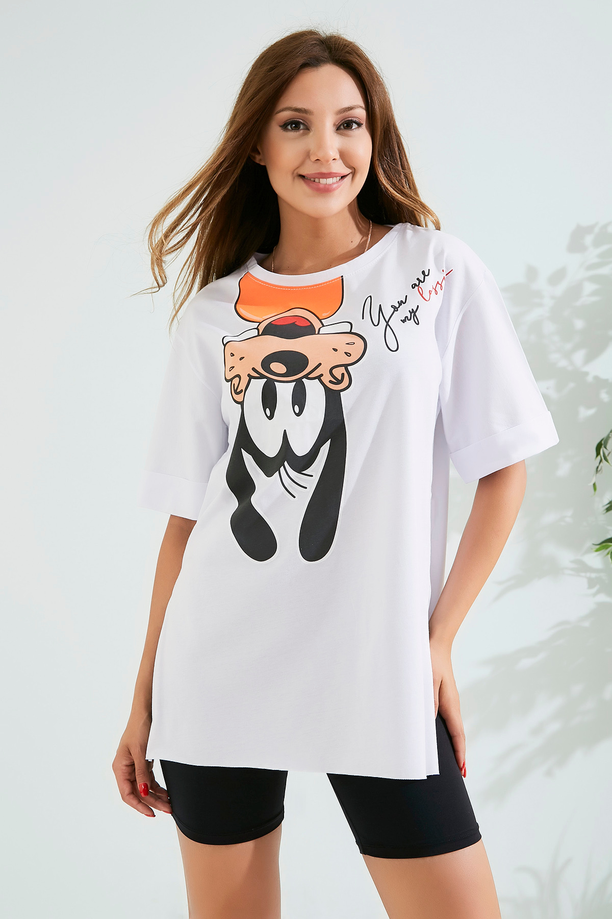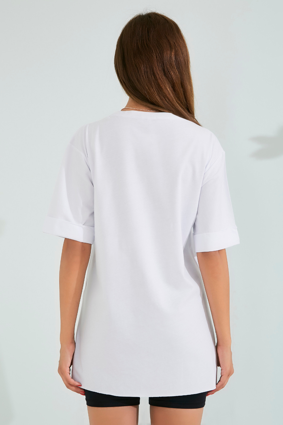 Bisiklet yaka, katlı geniş kol, yanlar yırtmaçlı, ön baskılı, uzun tshirt.PamukBoy Uzunluğu: 73 cmModelin Üzerindeki Ürün 36/S Bedendir Modelin Ölçüleri : Boy:1,74, Göğüs:89, Bel:59, Kalça:93