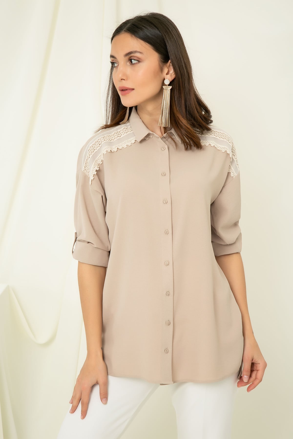 'Tasarımı ve Rahat kalıbı ile dikkat çeken Gömlek Saten.com' un kendi tesislerinde üretilmiş olup %100 Müşteri Memnuniyeti Garantisi altındadır.%100 Viskon*Ön Düğmeli*Düğmeli Katlanabilir Kol *Yanlar Mini Yırtmaçlı*Omuzları Dantel Detaylı*Arkası Uzun*Geniş Kalıp *Boy Uzunluğu:Ön:75 cm Arka:81 cmNumune Bedeni: 36/S/1Modelin Ölçüleri : Boy:1,74, Göğüs:88, Bel:64, Kalça:94
