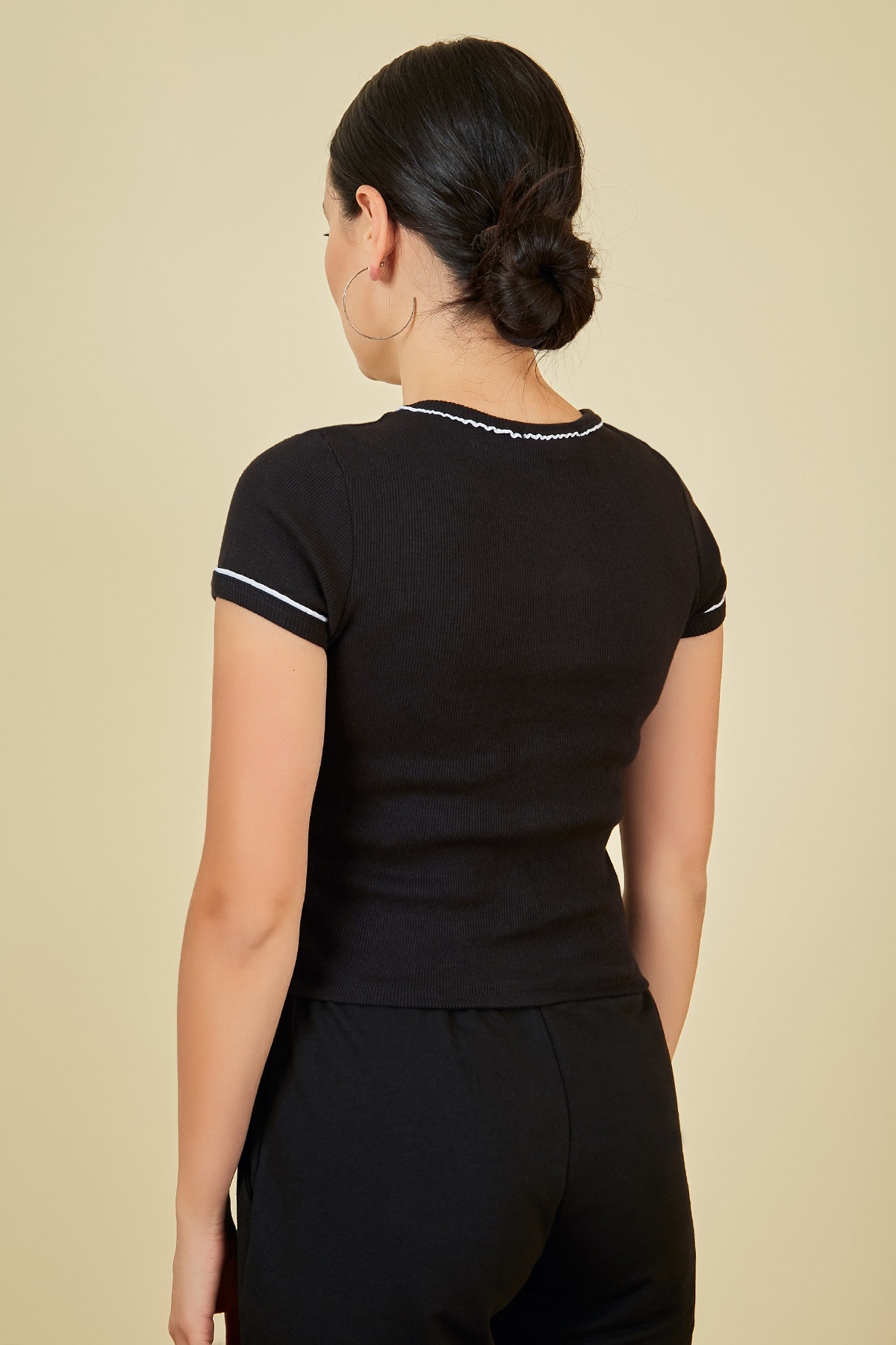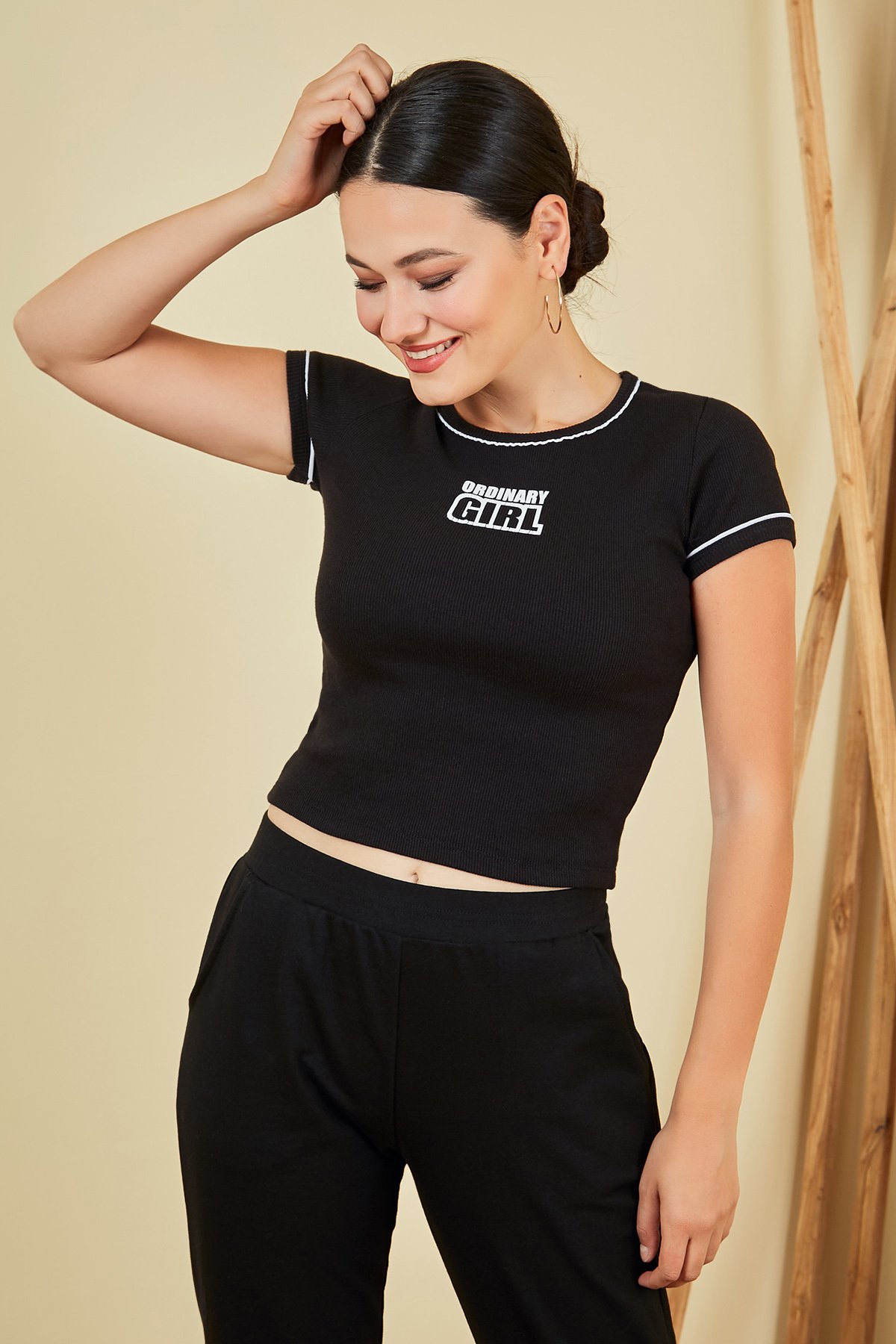Bisiklet yaka, kısa kol, yazı baskılı, esnek, kısa tshirt.PamukBoy Uzunluğu: 45 cmModelin Üzerindeki Ürün S/MModelin Ölçüleri:Boy:1,73, Göğüs:89, Bel:64, Kalça:92