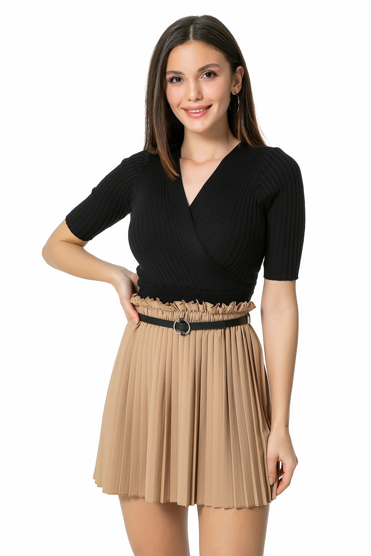 %92 Polyester %8 Likra *Bel Lastikli *Kemerli *Piliseli *Mini Boy *Rahat Kalıp *Boy Uzunluğu:44 cm Numune Bedeni: 36/S/1Modelin Ölçüleri : Boy:1,74, Göğüs:88, Bel:64, Kalça:94