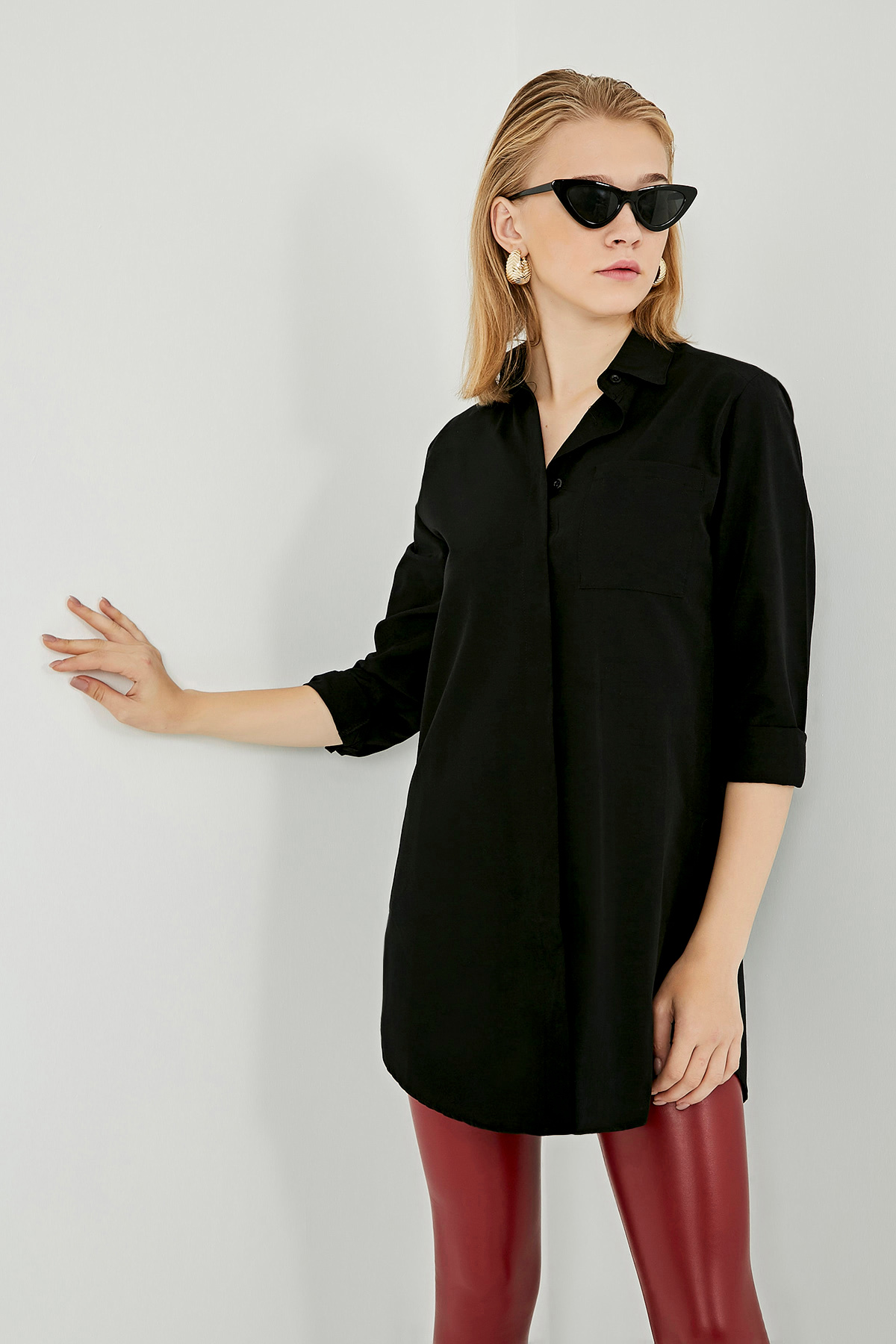 Klasik yaka, gizli düğme kapama, yanları yırtmaç detaylı, kol manşetleri düğme detaylı, rahat kalıp gömlek.Boy Uzunluğu:85 cmModelin Üzerindeki Ürün 36/S Bedendir.Modelin Ölçüleri:Boy:1,73, Göğüs:89, Bel:64, Kalça:92