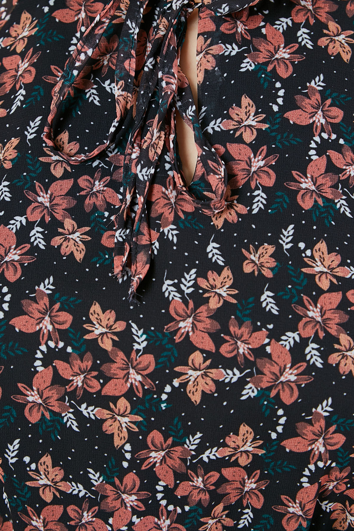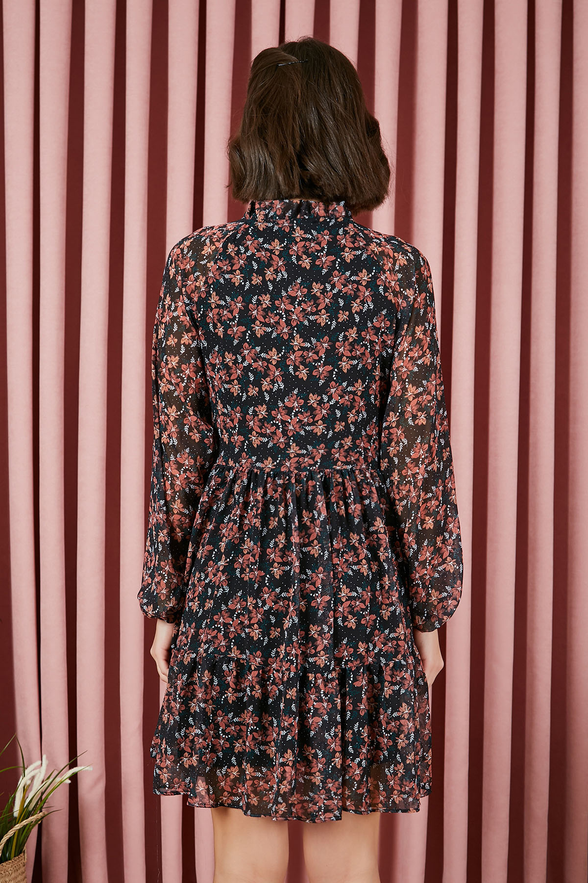 Fırfır detaylı ip bağlamalı yaka, kol manşetleri lastikli, etek ucu volanlı, astarlı, rahat kalıp şifon elbise. Şifon Boy Uzunluğu: 96 cm Astar Boy Uzunluğu:81 cm Numune Bedeni: 36/S/1 Modelin Ölçüleri:Boy:1,74, Göğüs:88, Bel:64, Kalça:94 Not:Kemer Ürüne Ait Değildir.