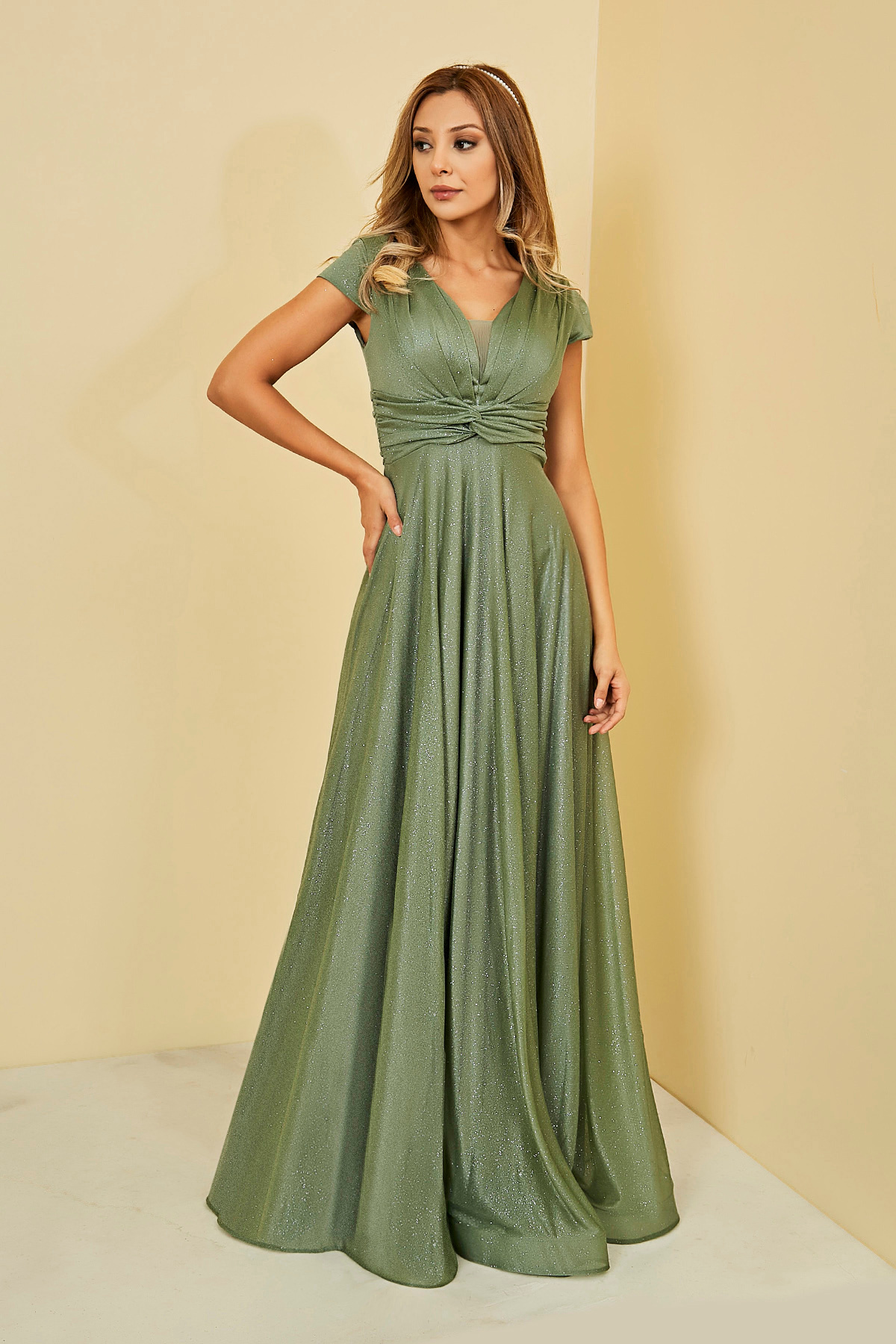Derin tül-v yaka, kısa kol, arka fermuarlı, astarlı, göğüs kaplı, tam kalıp, drapeli uzun abiye elbise.Simli KumaşBoy Uzunluğu: 161 cm Modelin Üzerindeki Ürün 38/M Bedendir.Modelin Ölçüleri : Boy:1,74, Göğüs:89, Bel:59, Kalça:93