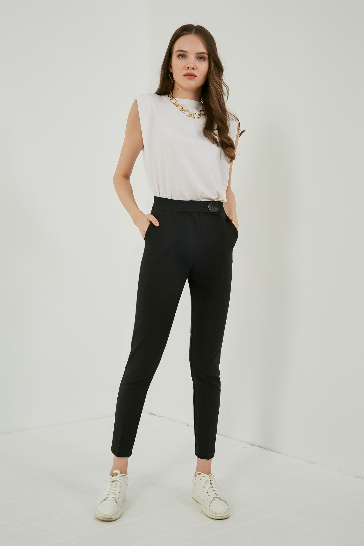 Yüksek bel, düğme iliklemeli, fermuar kapama, büyük düğme detaylı, cepli, boru paça, tam kalıp pantolon. %80 Pamuk %20 Polyester. Boy Uzunluğu: 97 cm Modelin Üzerindeki Ürün 36/S Bedendir. Modelin Ölçüleri:Boy:1,74, Göğüs:89, Bel:59, Kalça:93