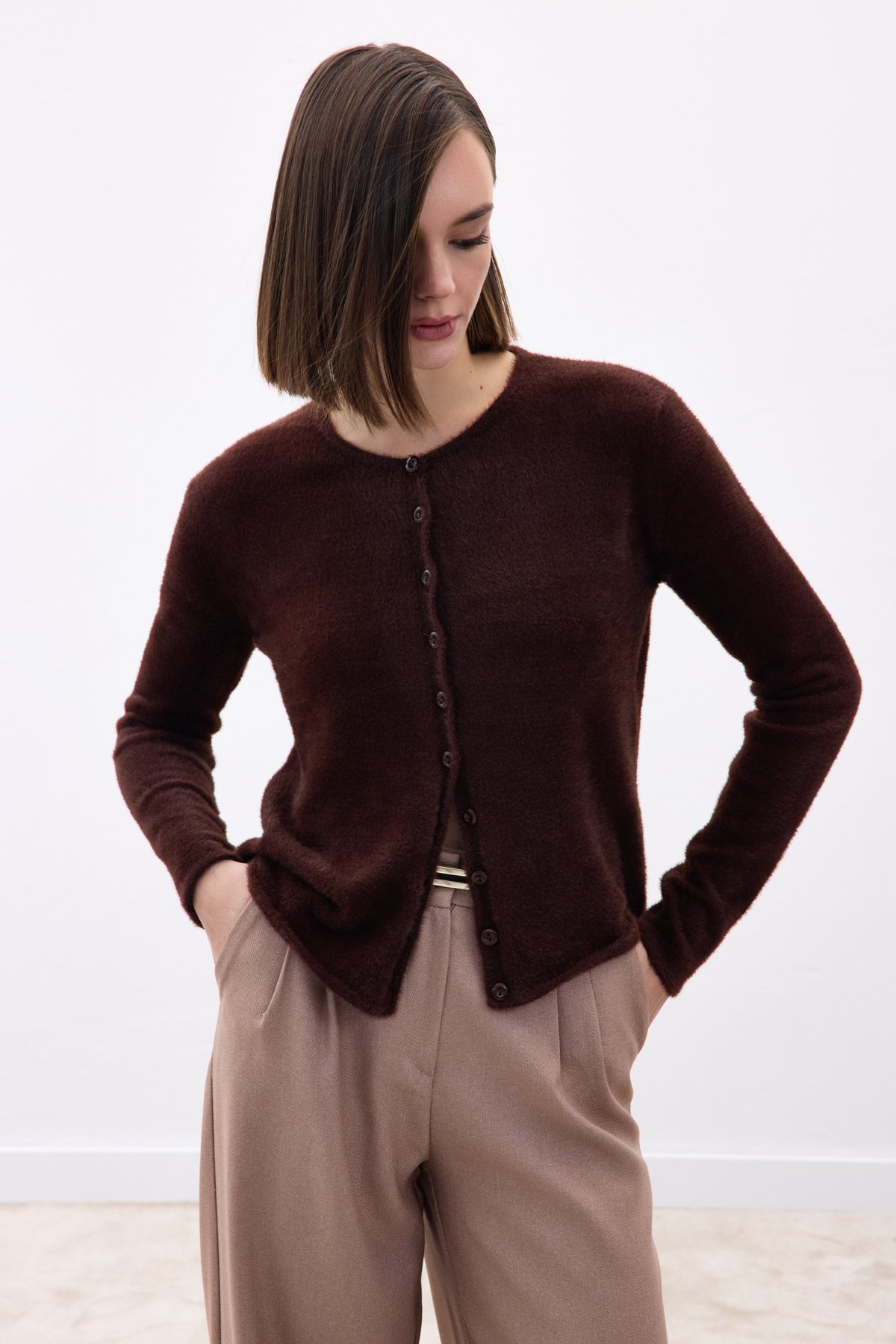 Düğmeli Sakallı Hırka - Kahve