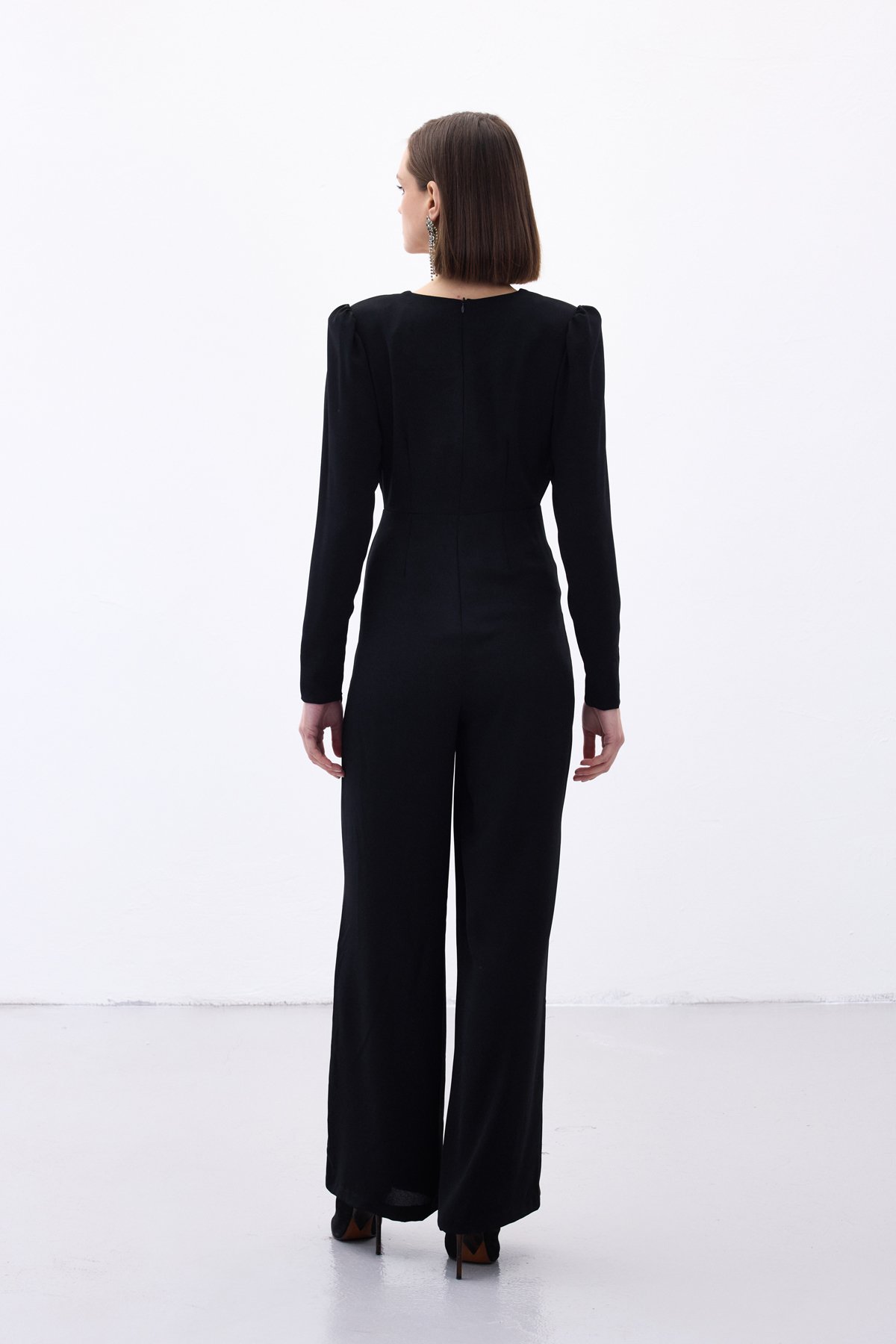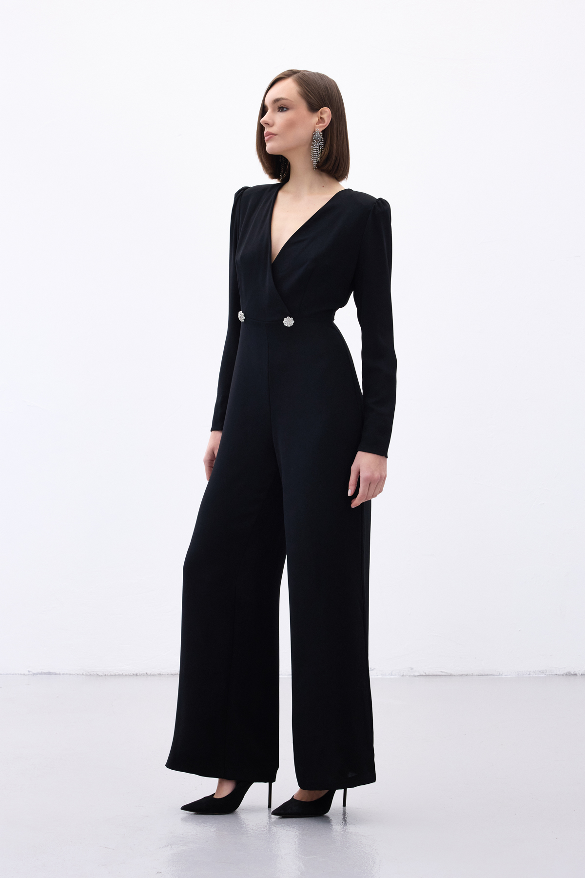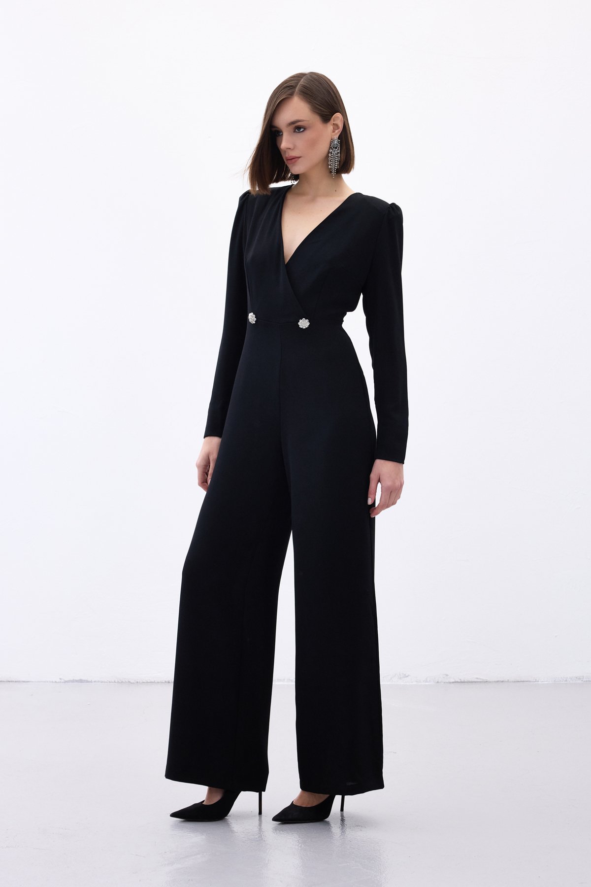 Double Breasted Crepe Jumpsuit with Ornamental Stones - Black