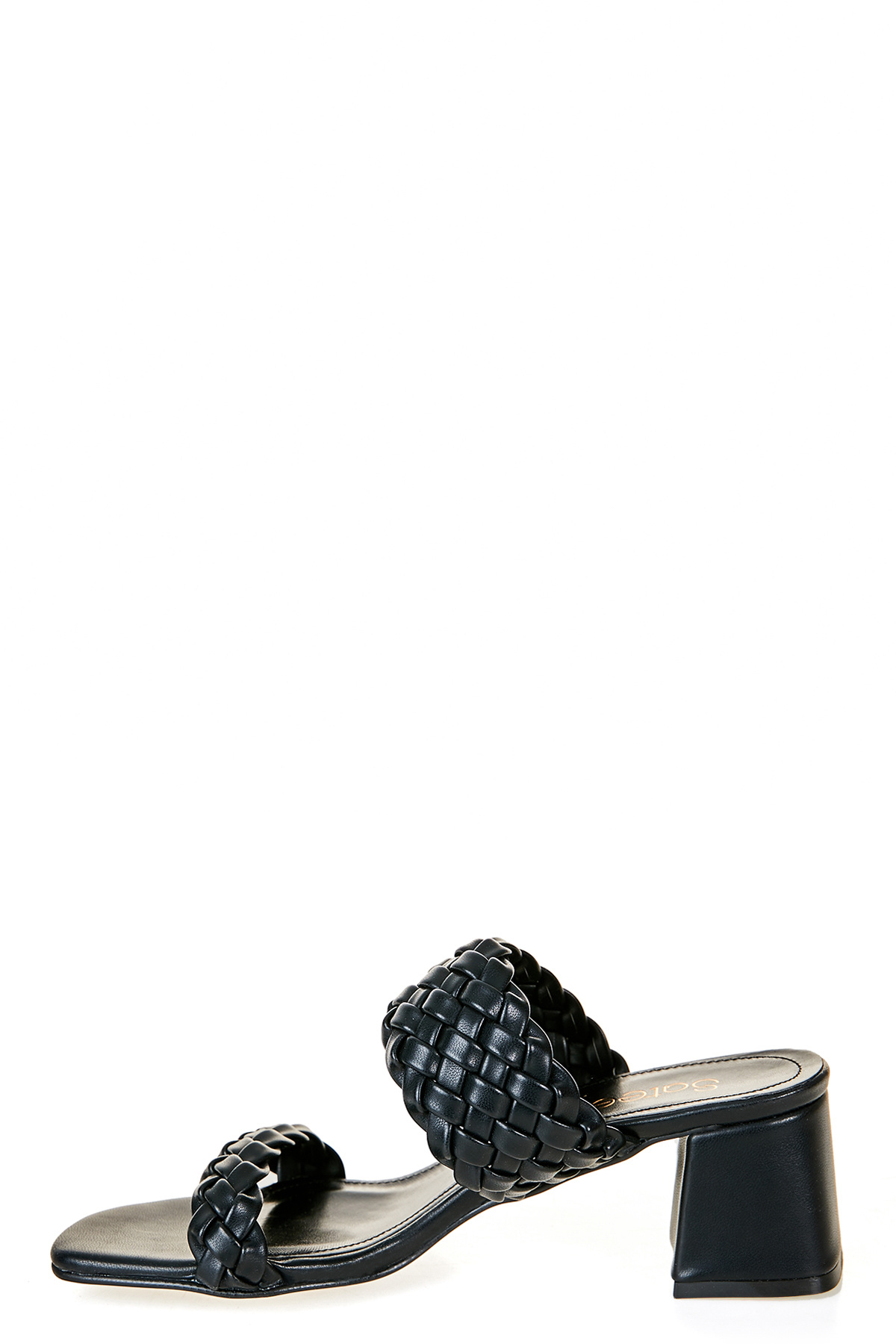 Faux leather, mesh detail, heeled slippers.