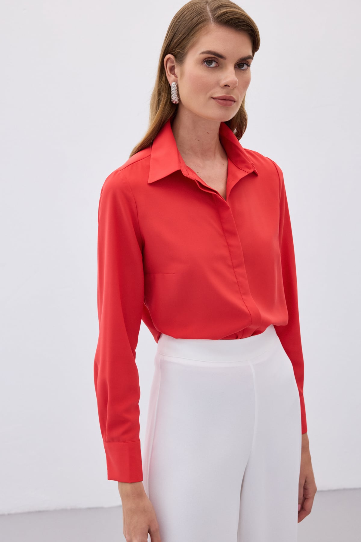 * Classic Collar Shirt * Hidden Button Button * Long Arm * Full Mold Chiffon Length: 65 cm Sample Size: 36 / S / 1 Dimensions Of Model :Height:1,74, Chest:88, Waist:64, Hip: 94