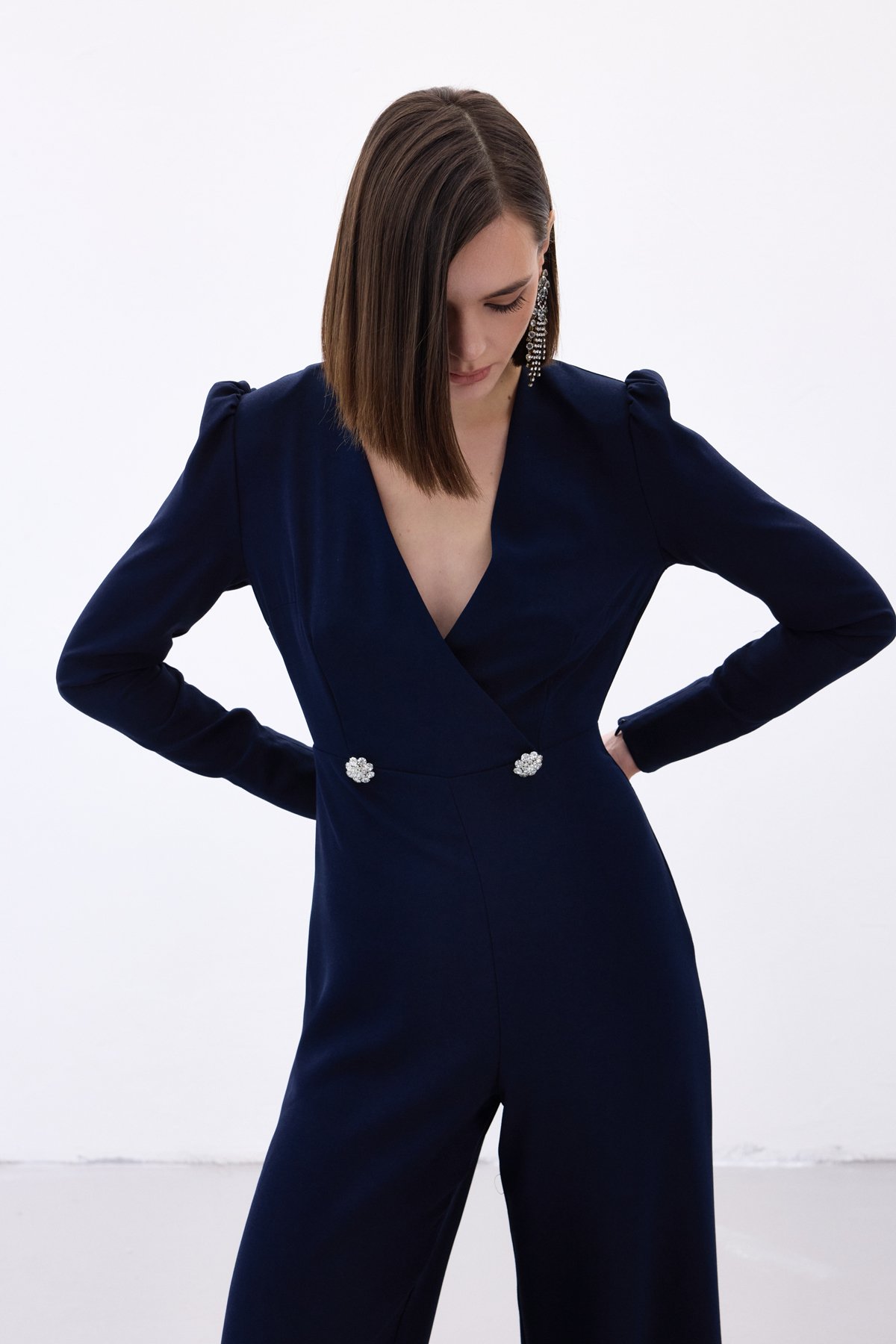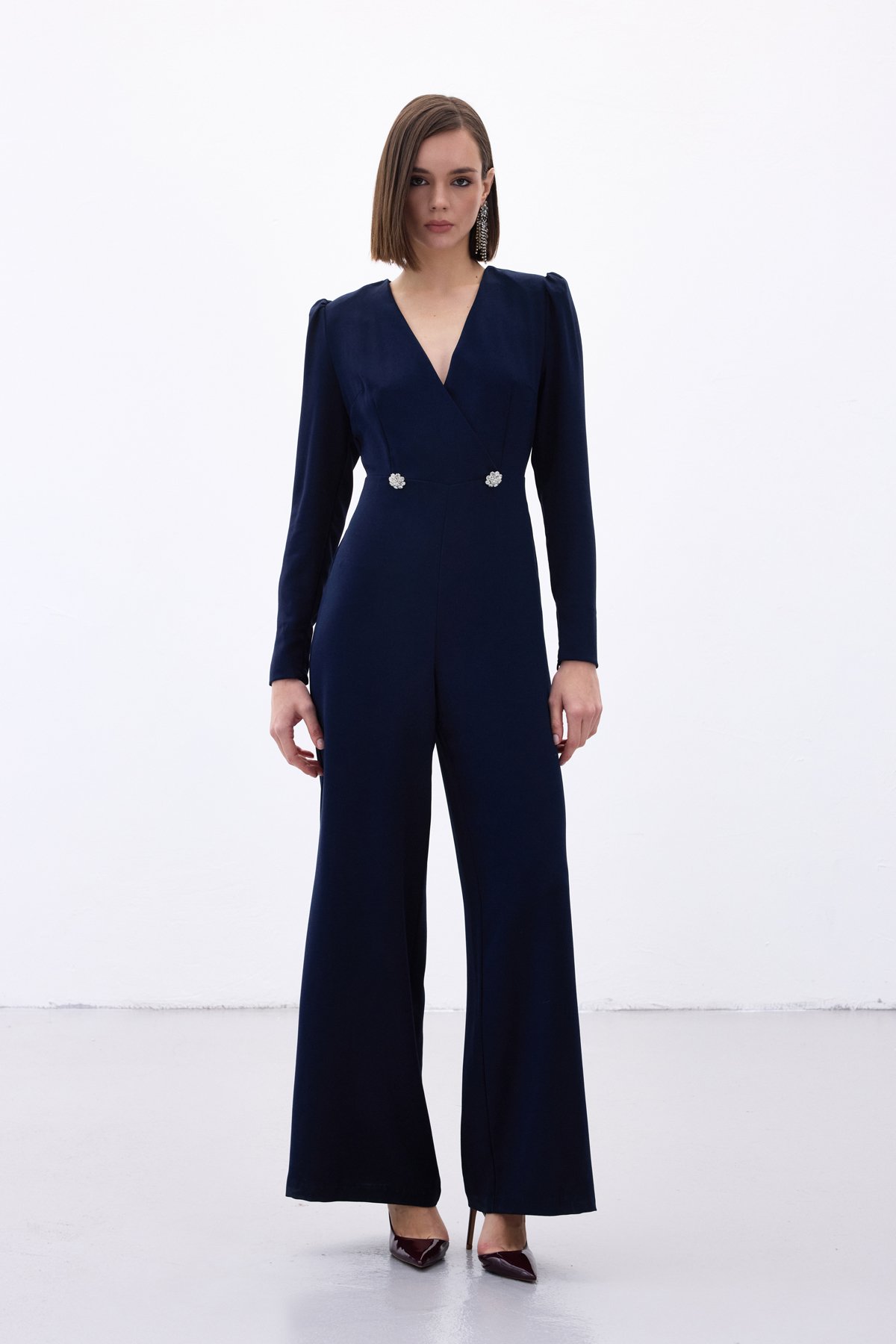 Double Breasted Crepe Jumpsuit with Ornamental Stones - Blue