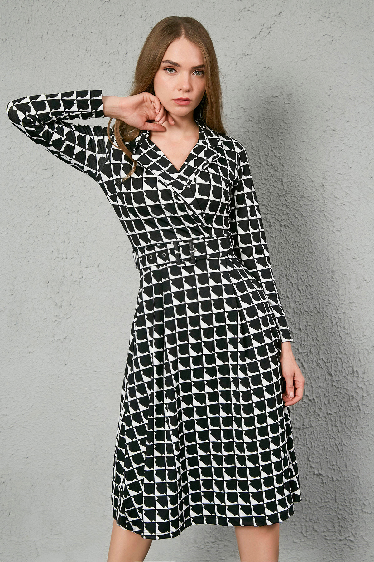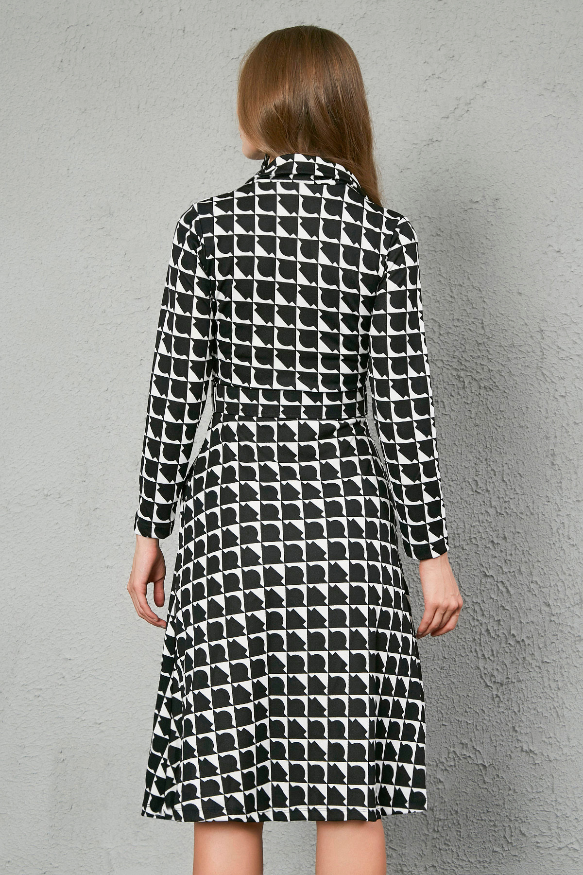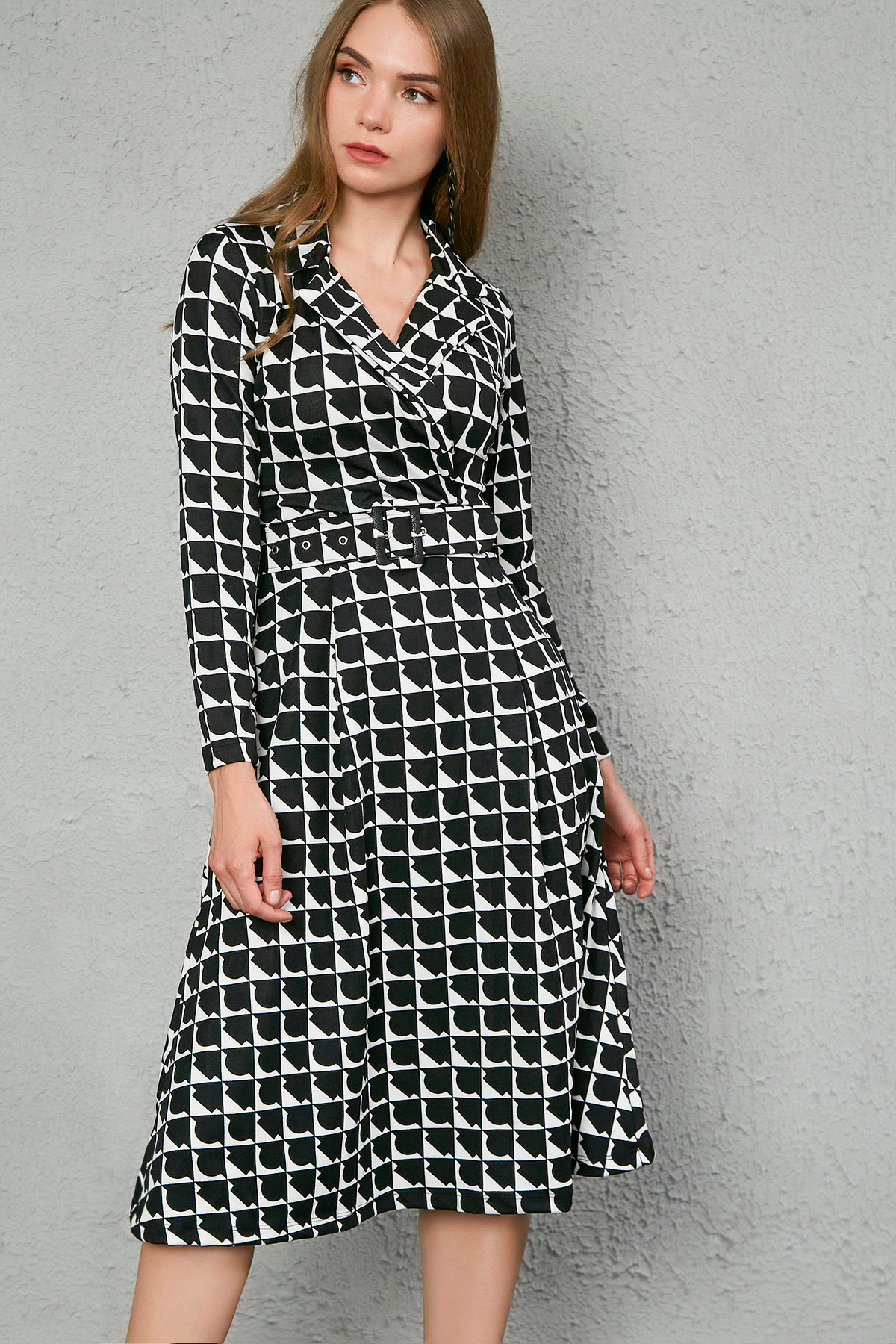 Long Sleeve Jacket Collar Belt Dress - PATTERNED BLACK