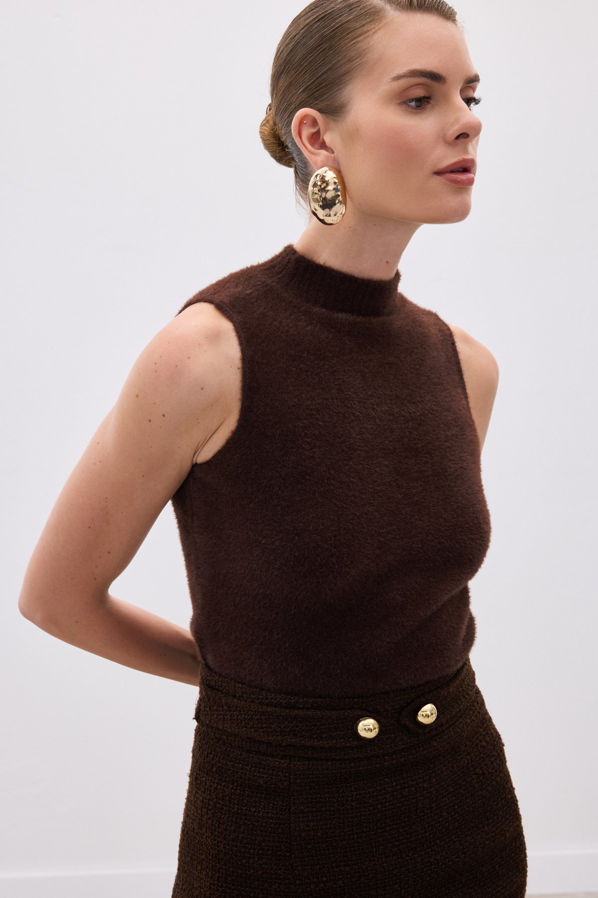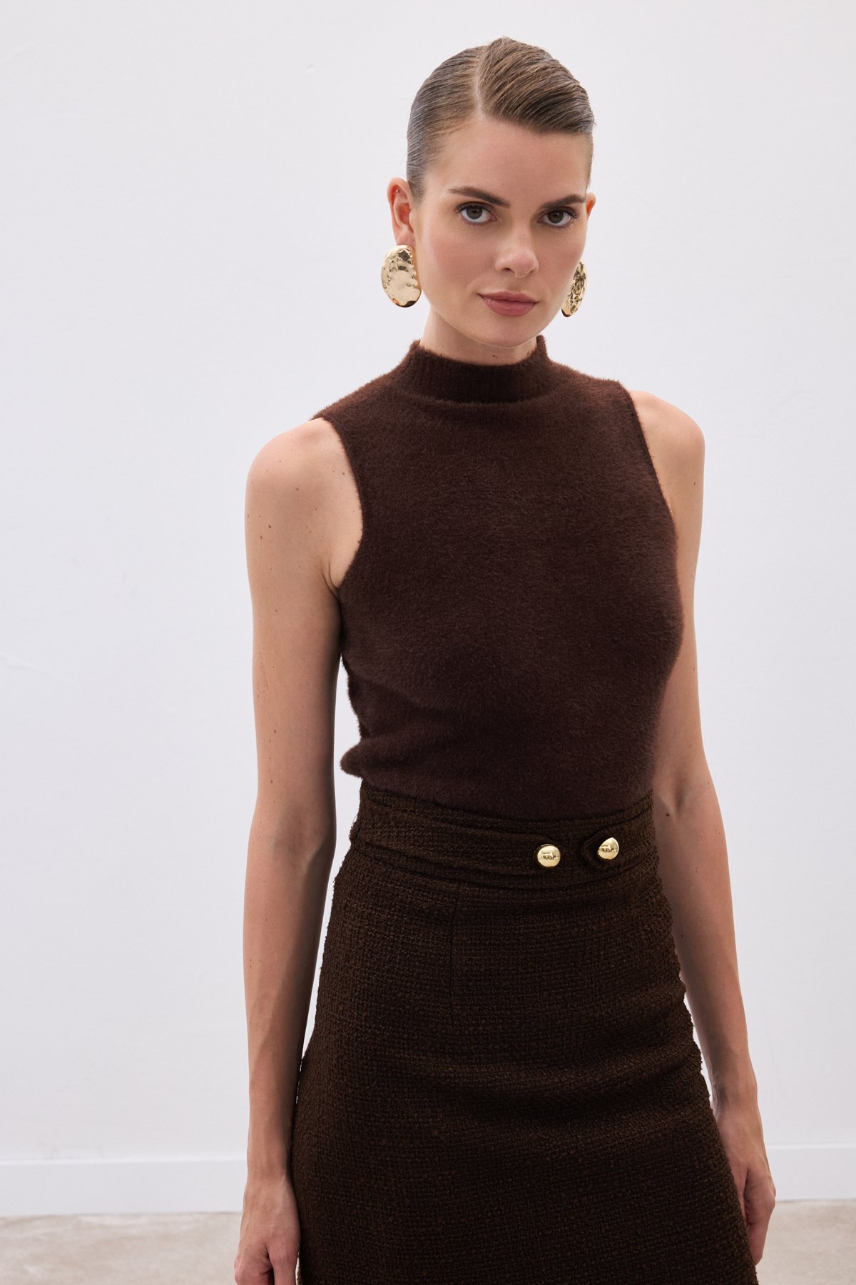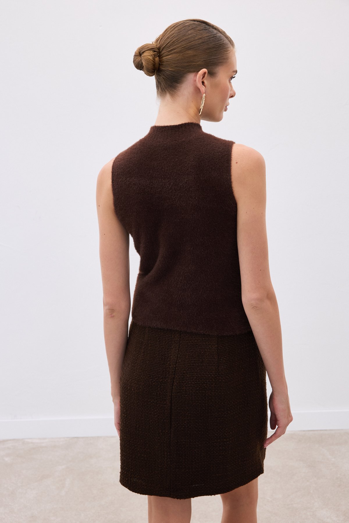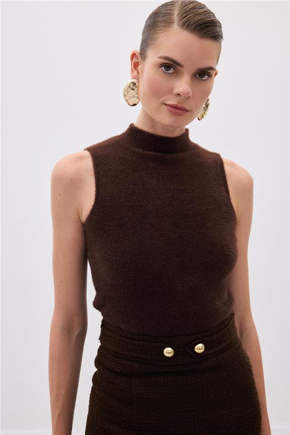 Sıfır Kol Sakallı Triko Bluz - Kahve