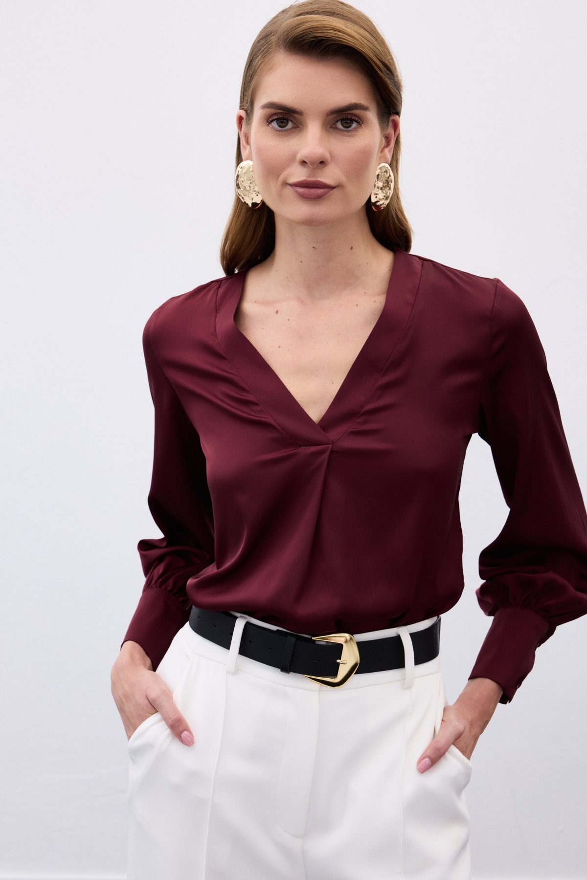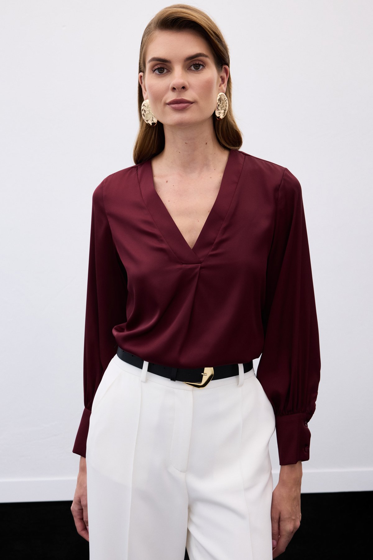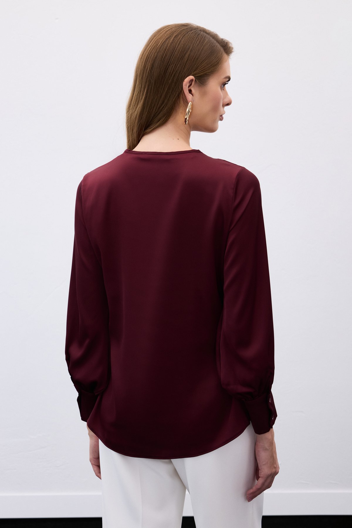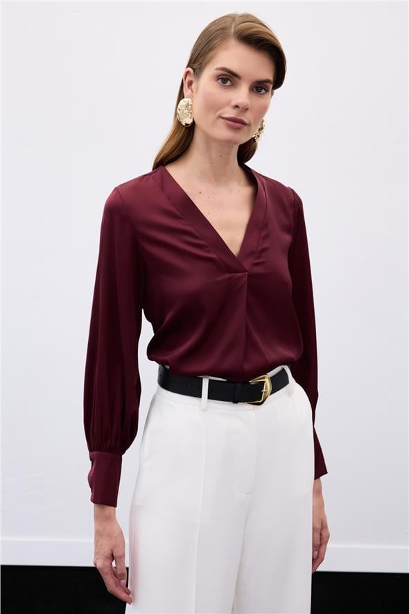 V Yaka Saten Bluz - Bordo