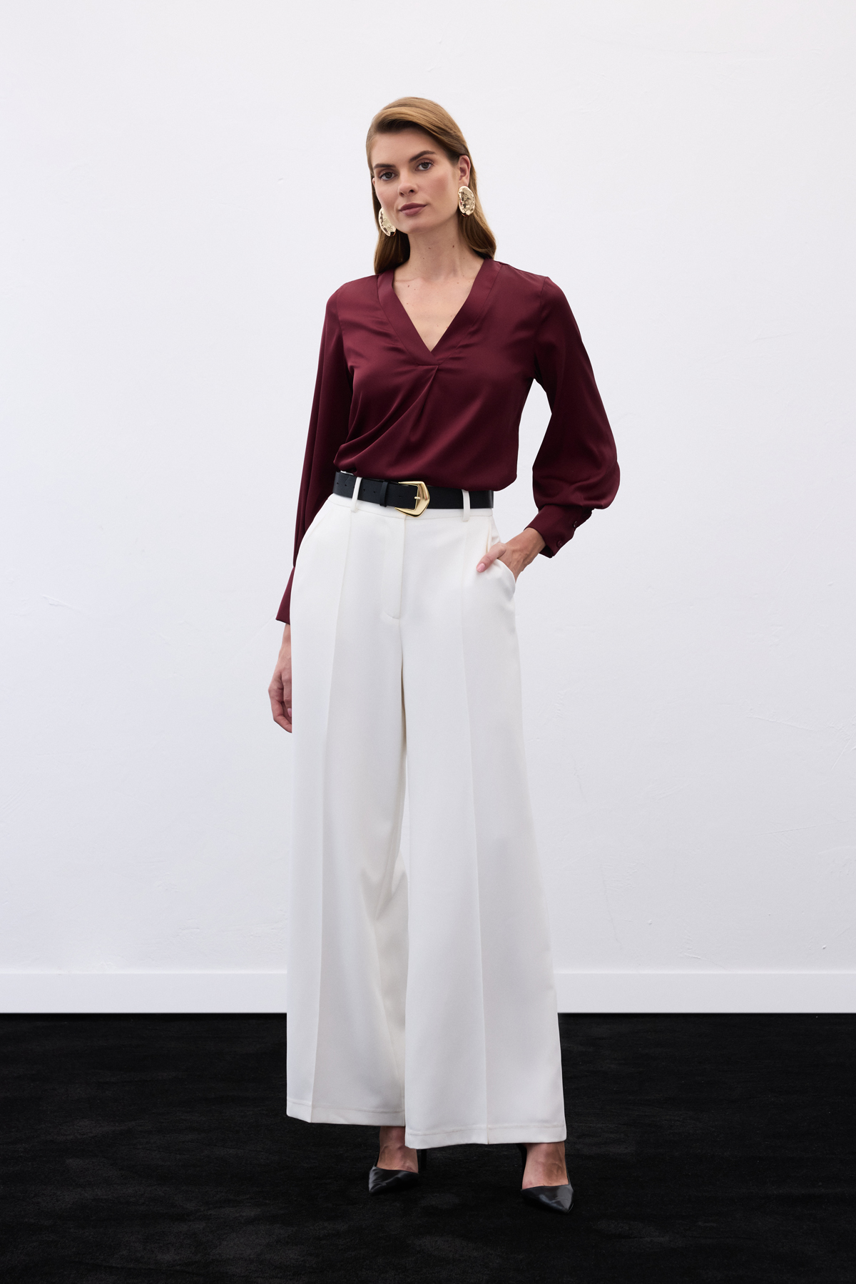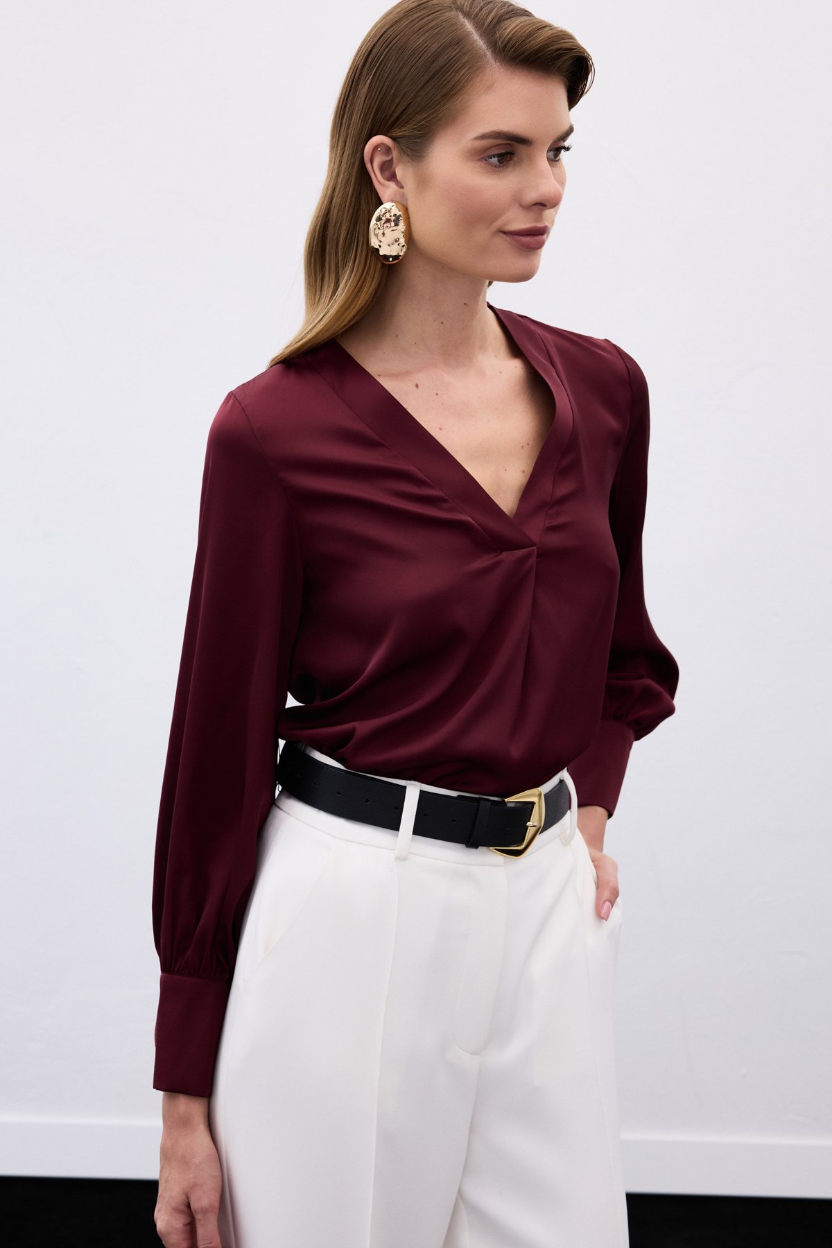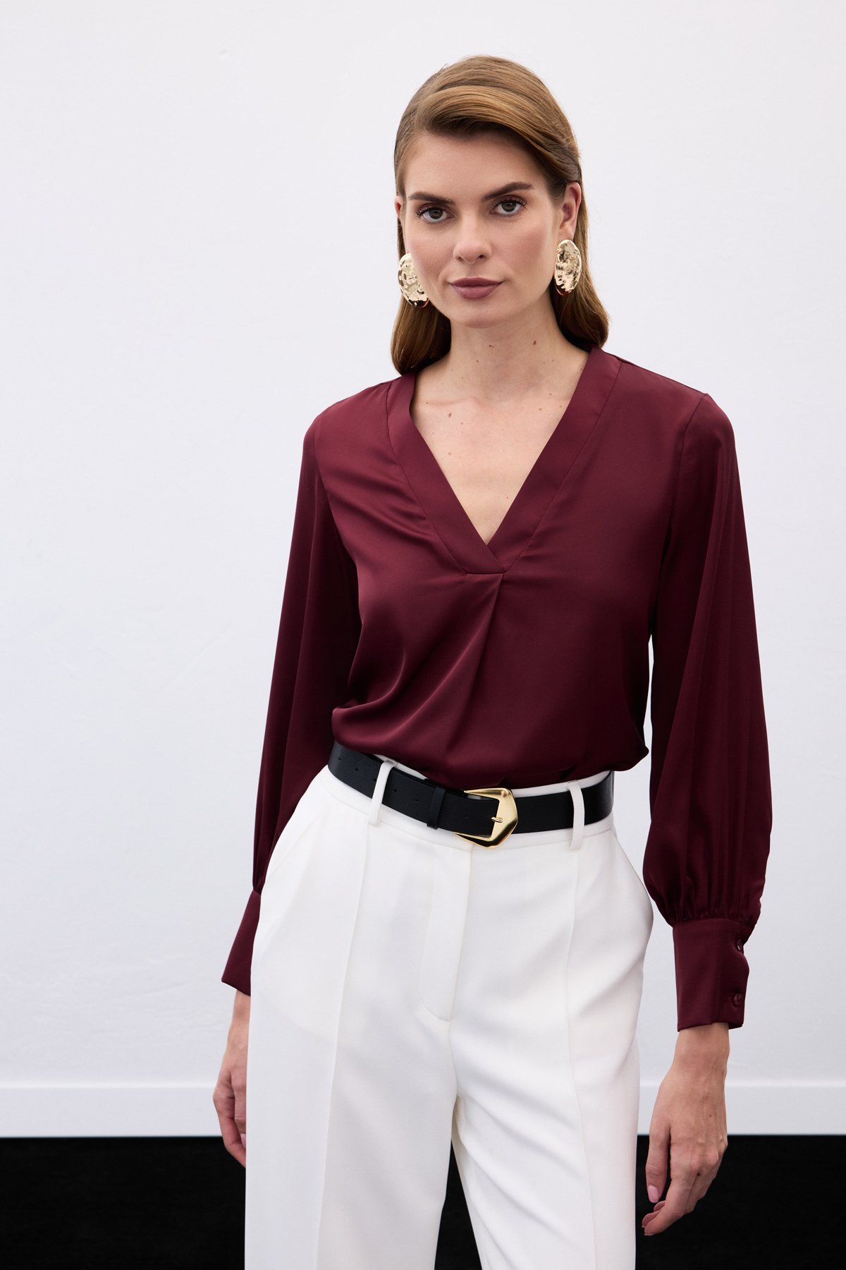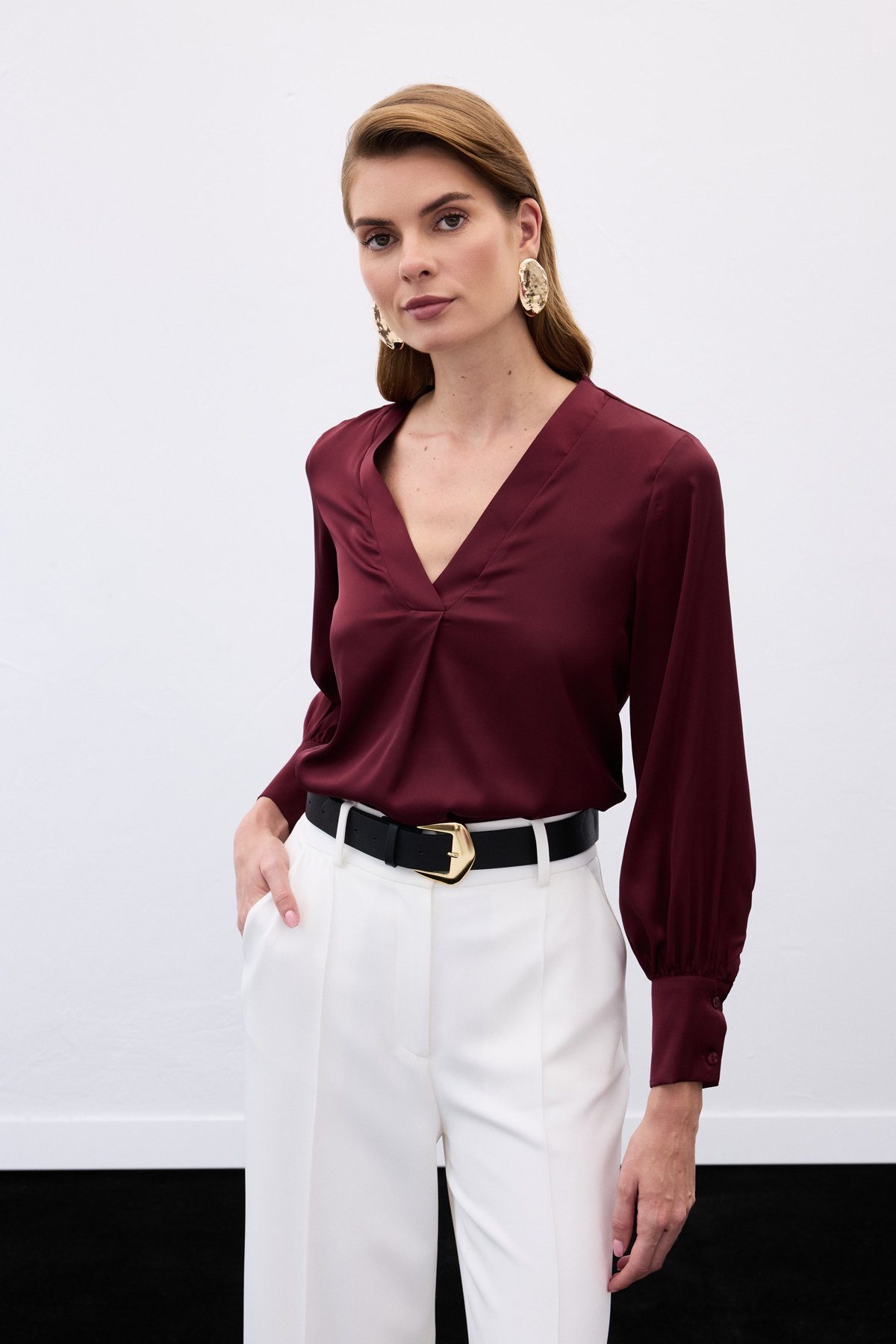 V Yaka Saten Bluz - Bordo