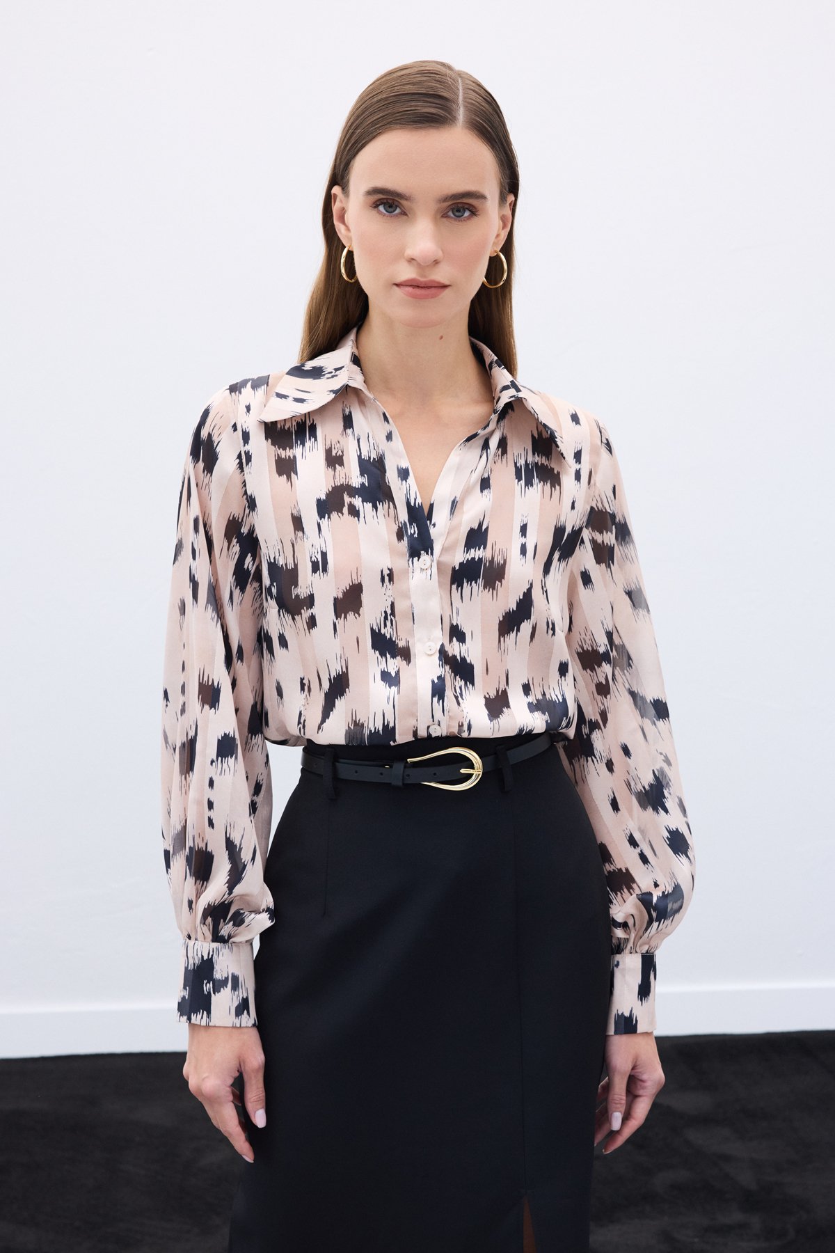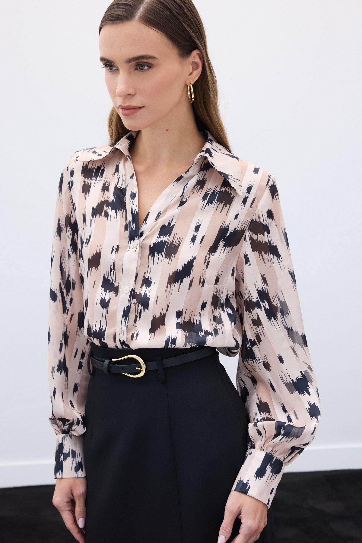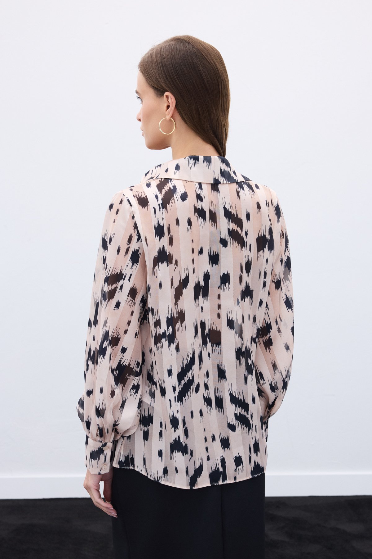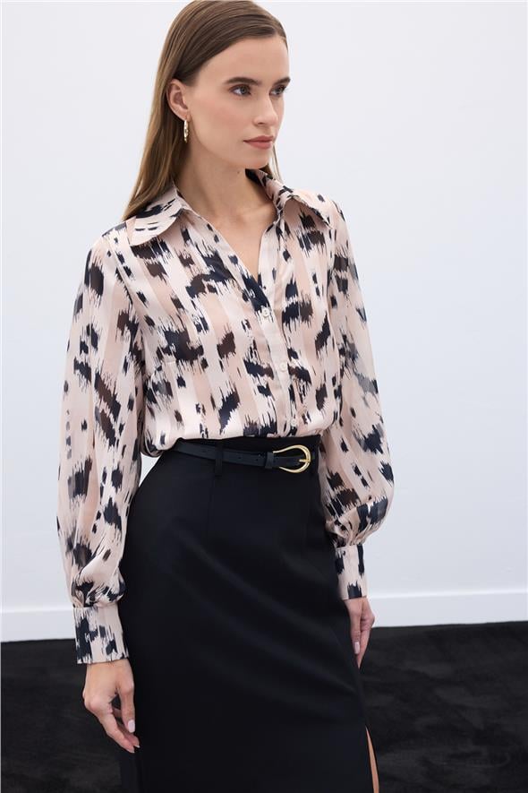 Geniş Manşetli Desenli Gömlek - Bej