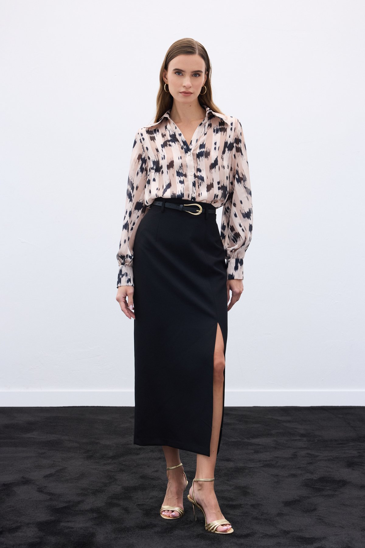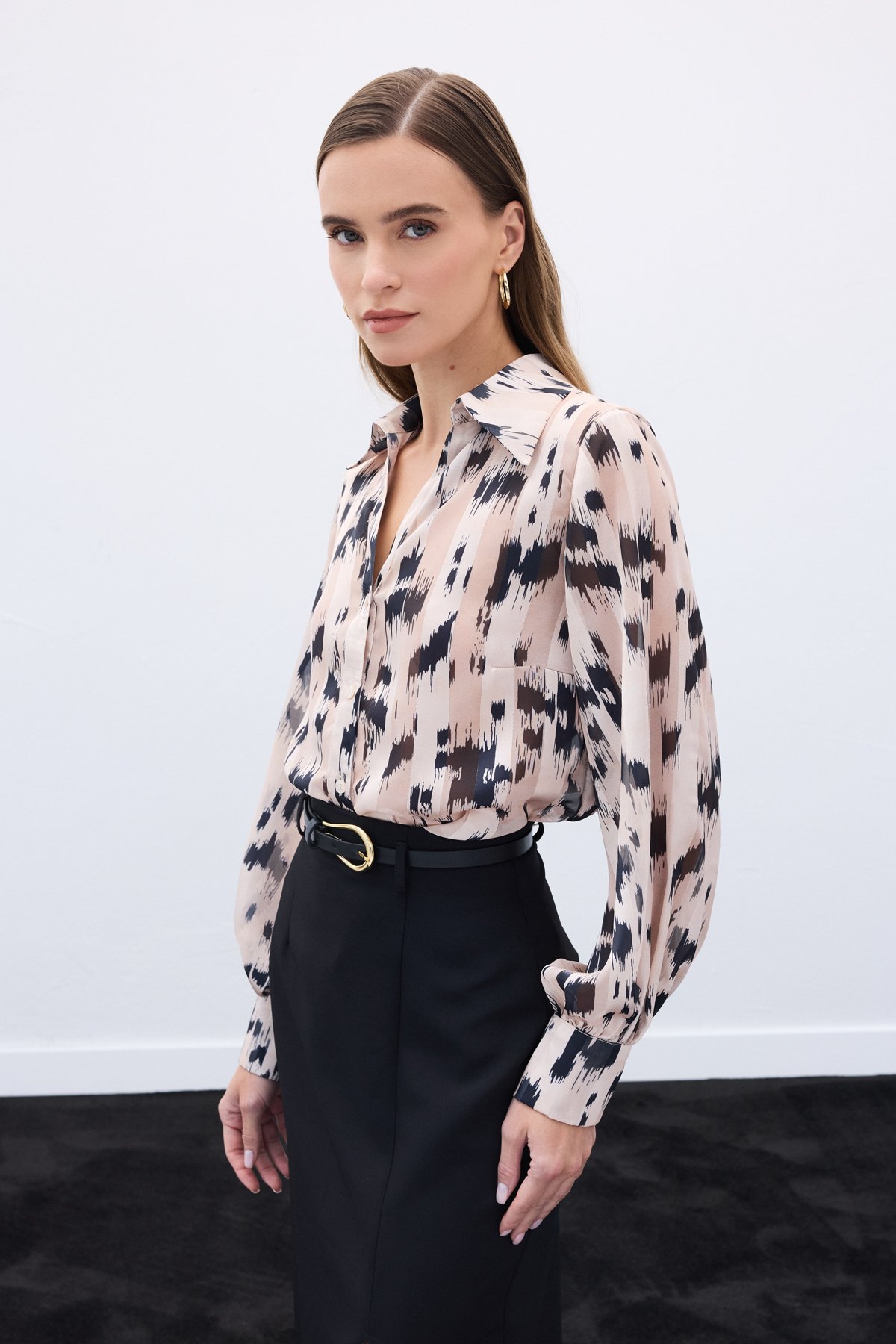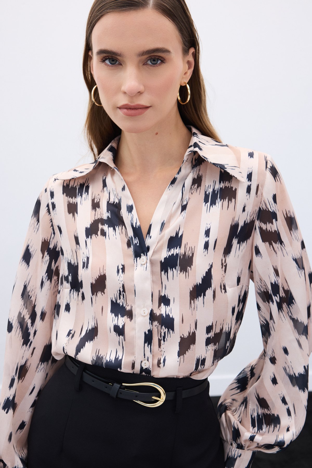 Geniş Manşetli Desenli Gömlek - Bej