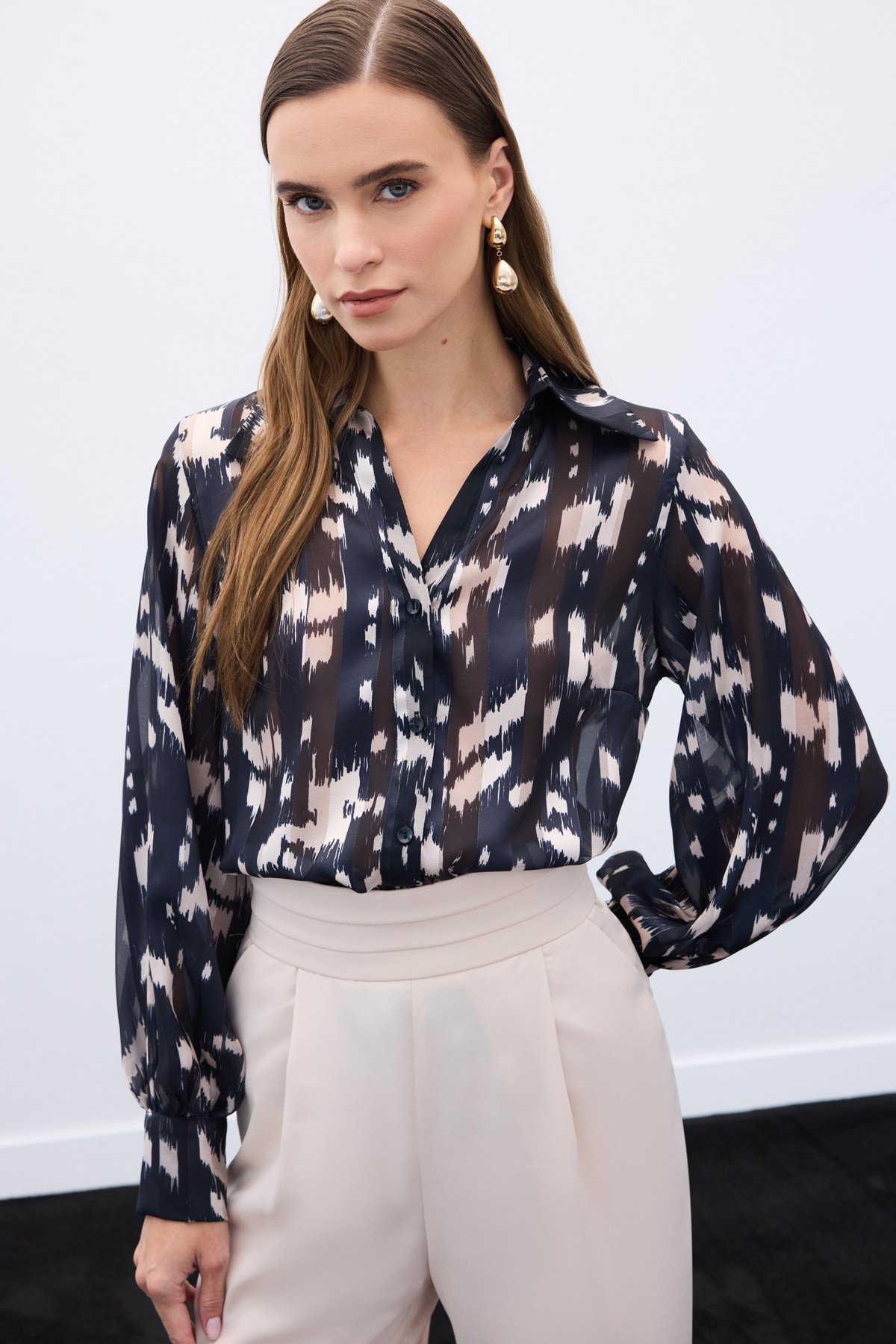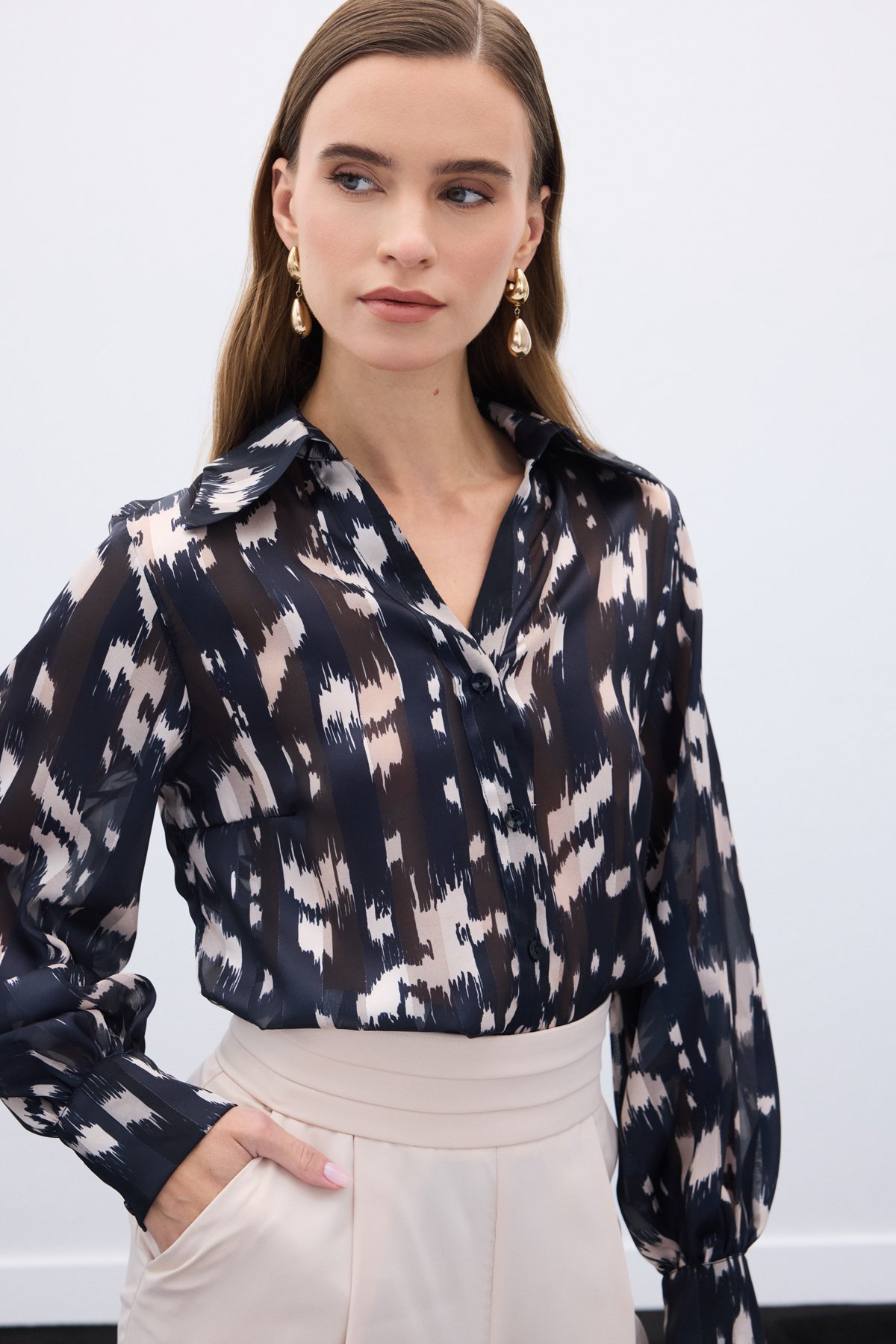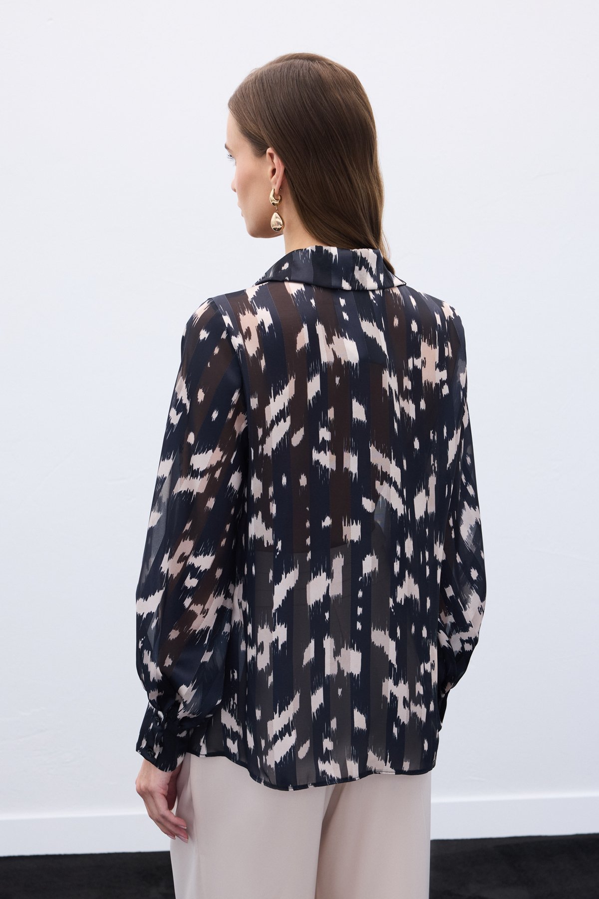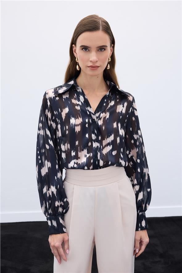 Geniş Manşetli Desenli Gömlek - Siyah