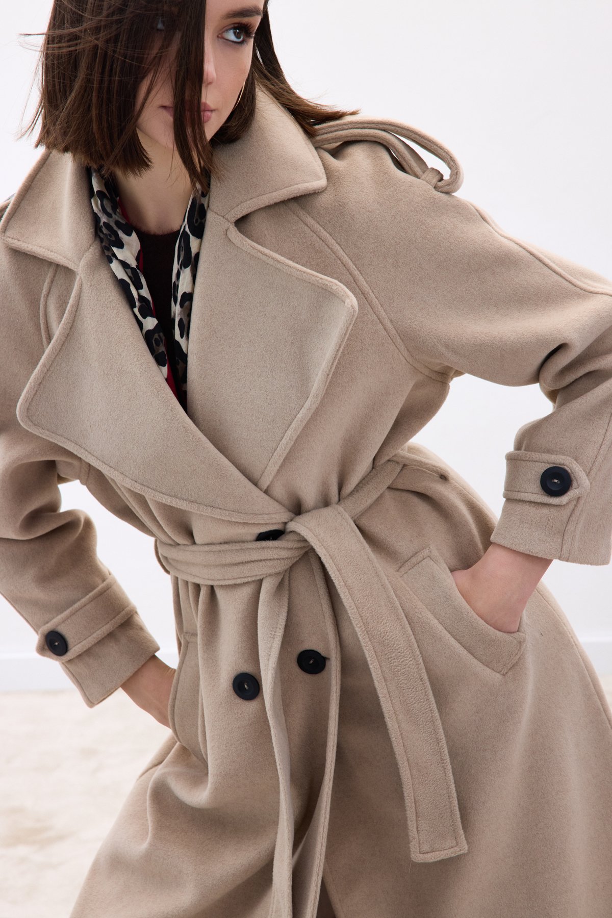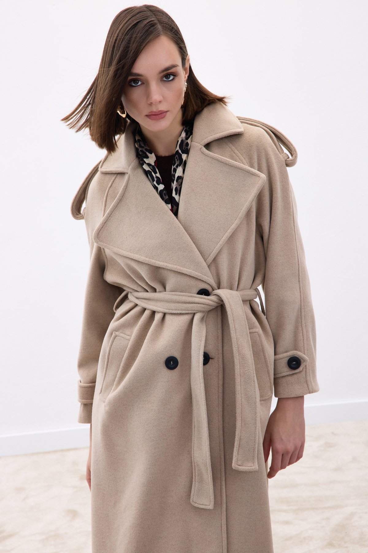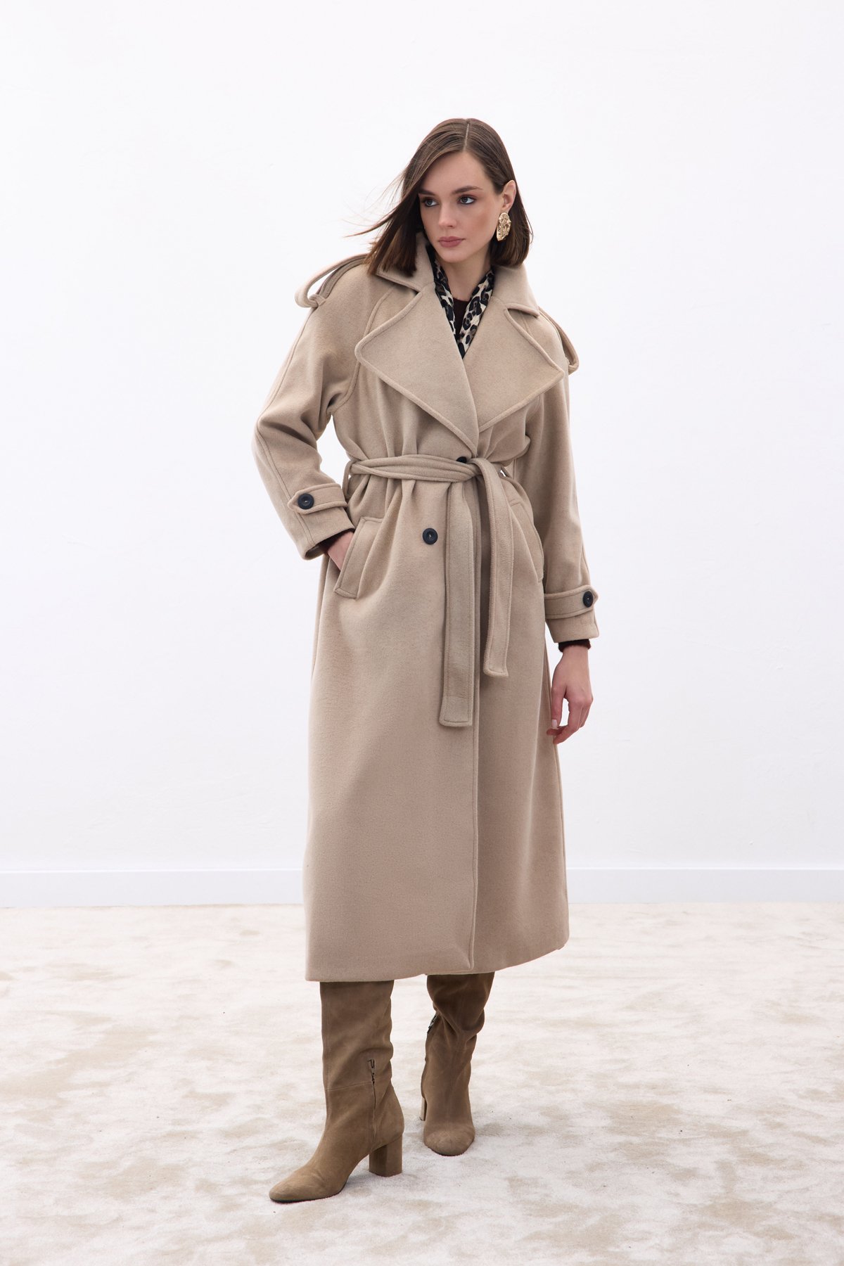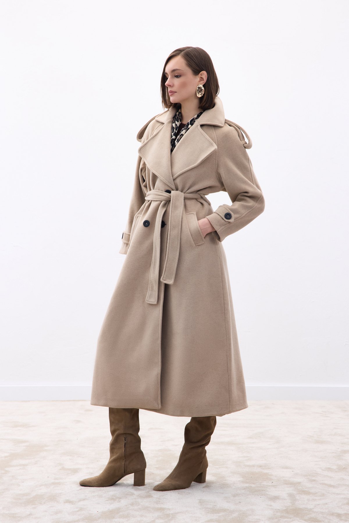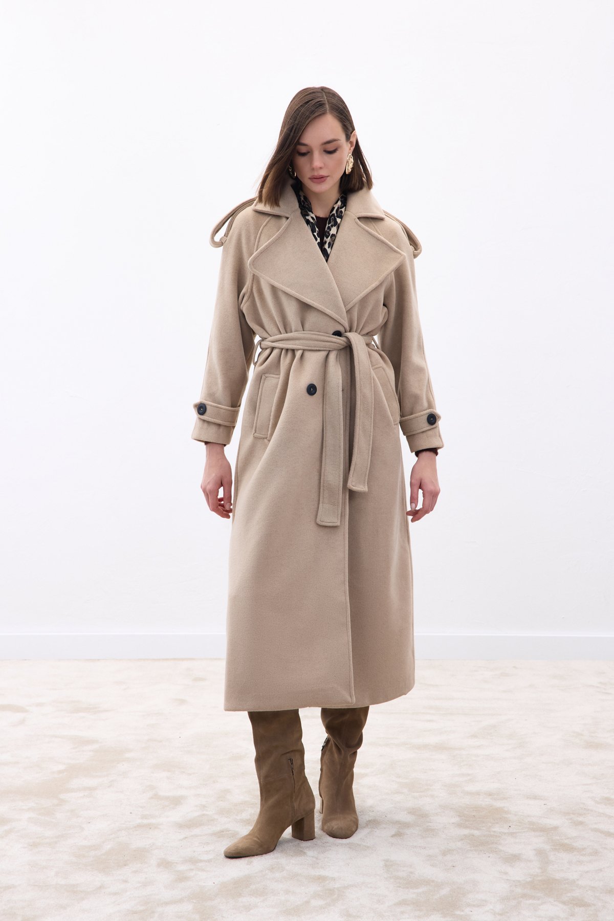 Geniş Yaka Uzun Kaban - Bej