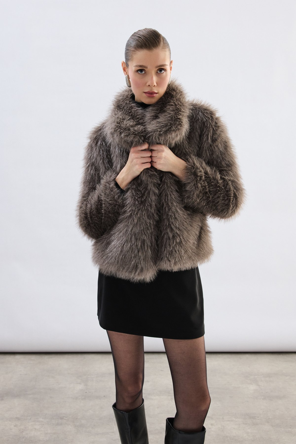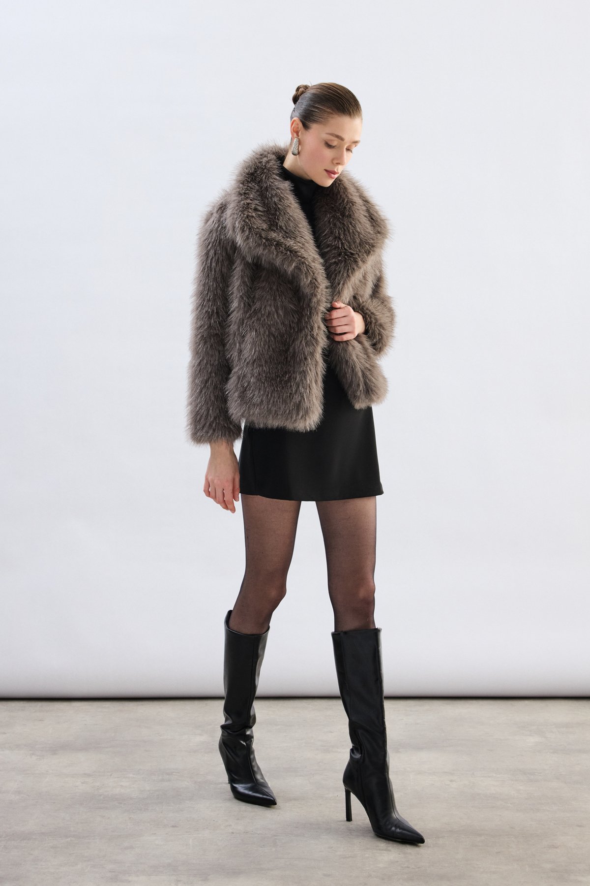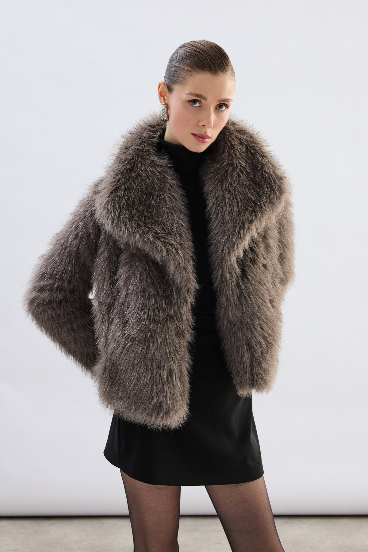 Geniş Yakalı Simli Kürk - Füme