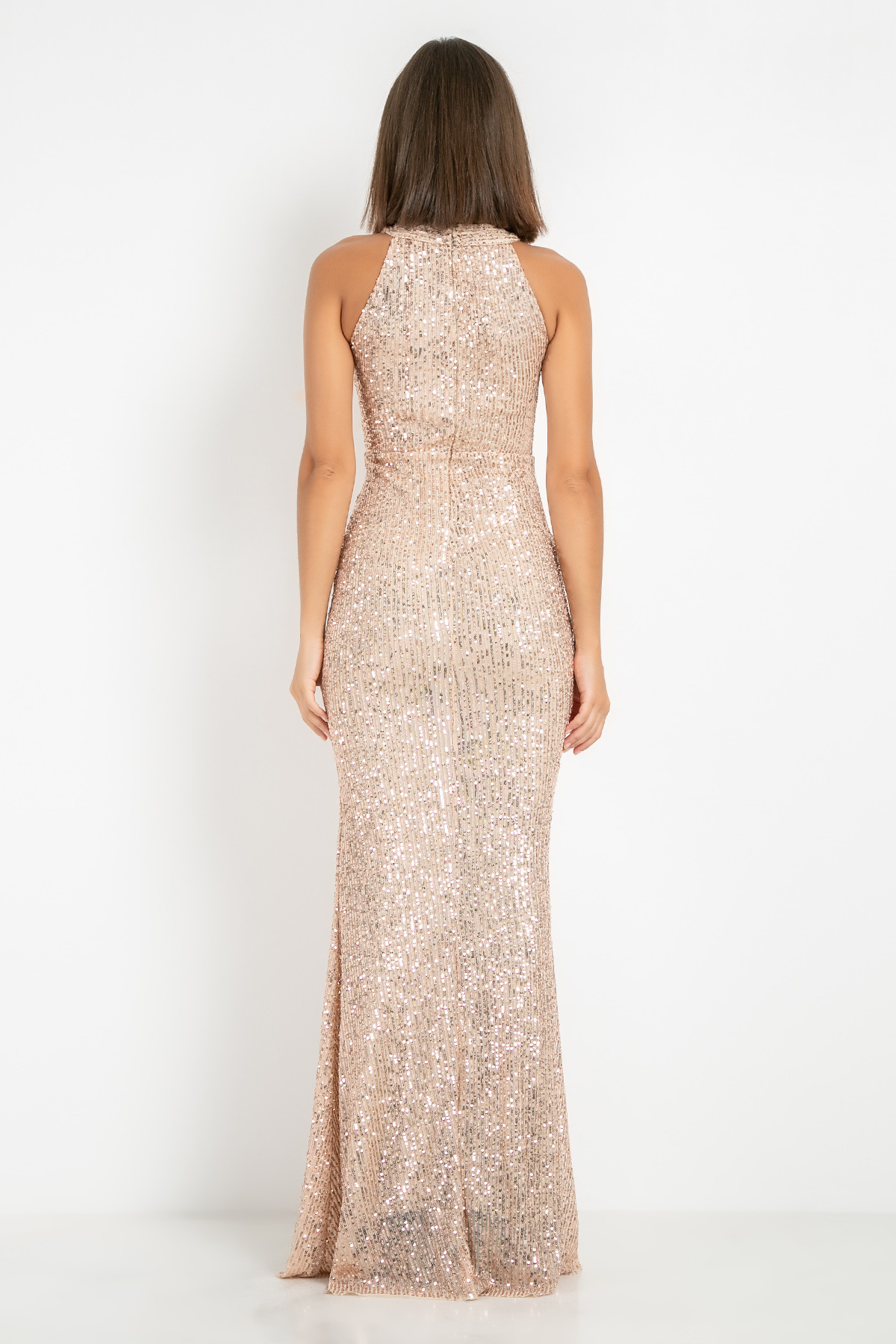 Kumaş Türü: %100 Polyester*Oyuk Kollu Halter Yaka*Pul Payetli*Arka Fermuarlı*Kaplı*Astarlı*Tam Kalıp*Boy Uzunluğu:157 cmNumune Bedeni: 36/S/1Modelin Ölçüleri : Boy:1,74, Göğüs:88, Bel:64, Kalça:94