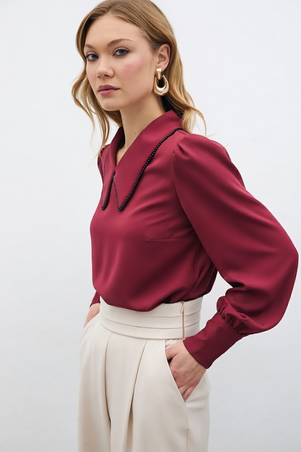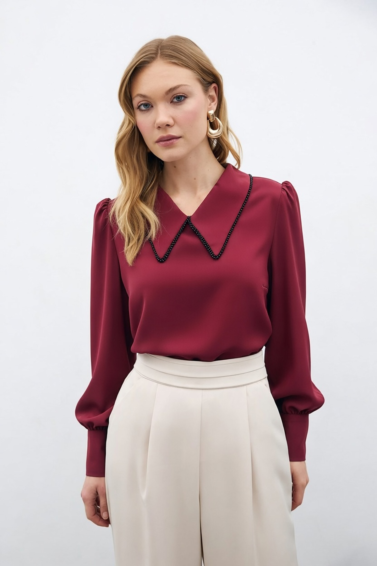 İnci Yakalı Bluz - Bordo