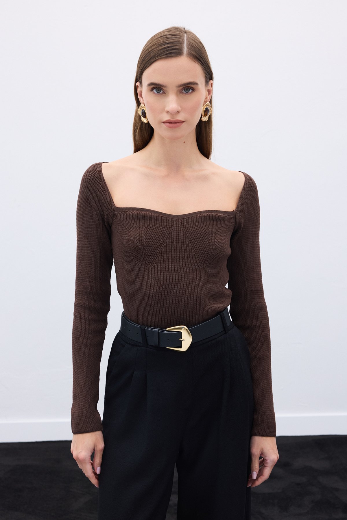 Uzun kol, esnek, kendinden desenli, kalp yaka triko bluz.
