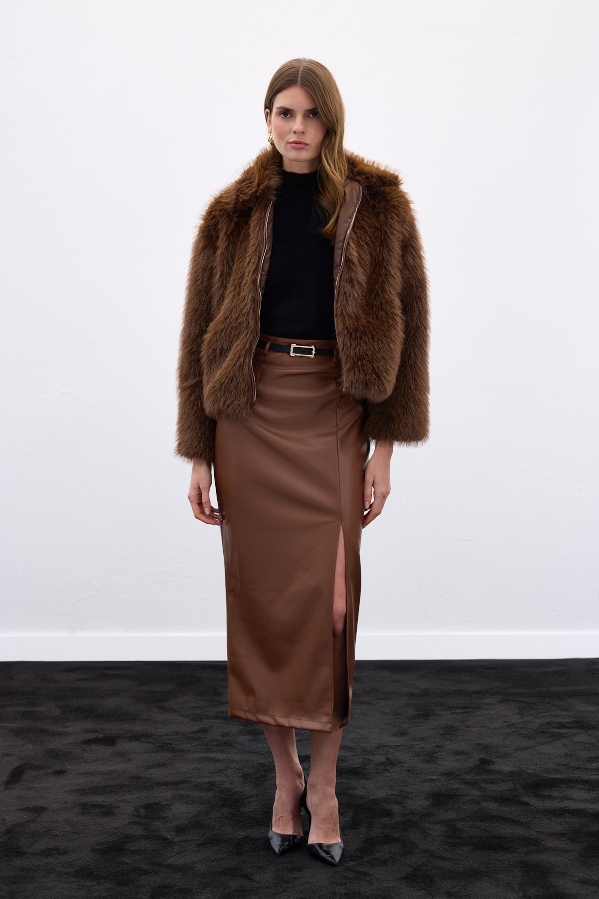 Kemerli Deri Etek - Kahve