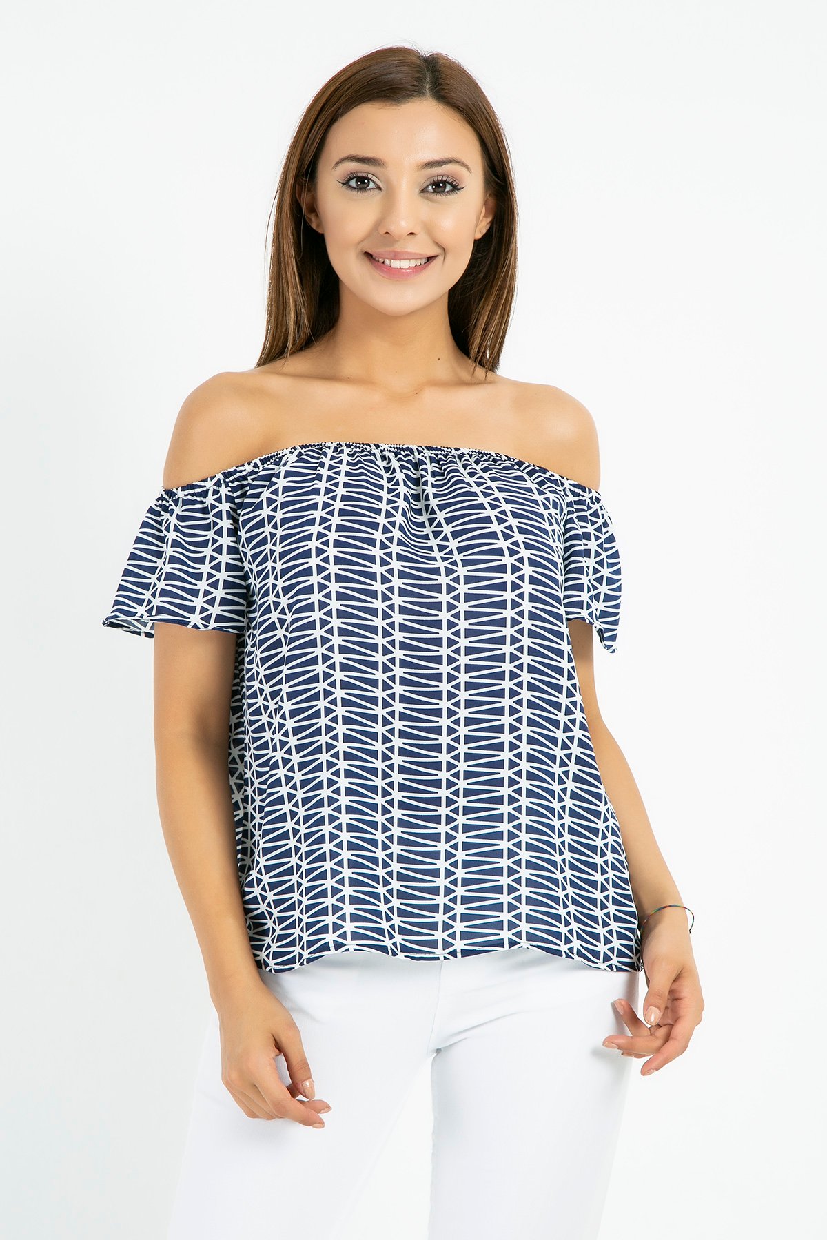 %80 Pamuk %17 Polyester %3 Likra *Volanlı-Lastikli Yaka*Volanlı Kol *Omuz Açık*Desenli*Rahat Kalıp *Boy Uzunluğu:50 cmNumune Bedeni: 36/S/1Modelin Ölçüleri :Boy:1,74, Göğüs:89, Bel:59, Kalça:93