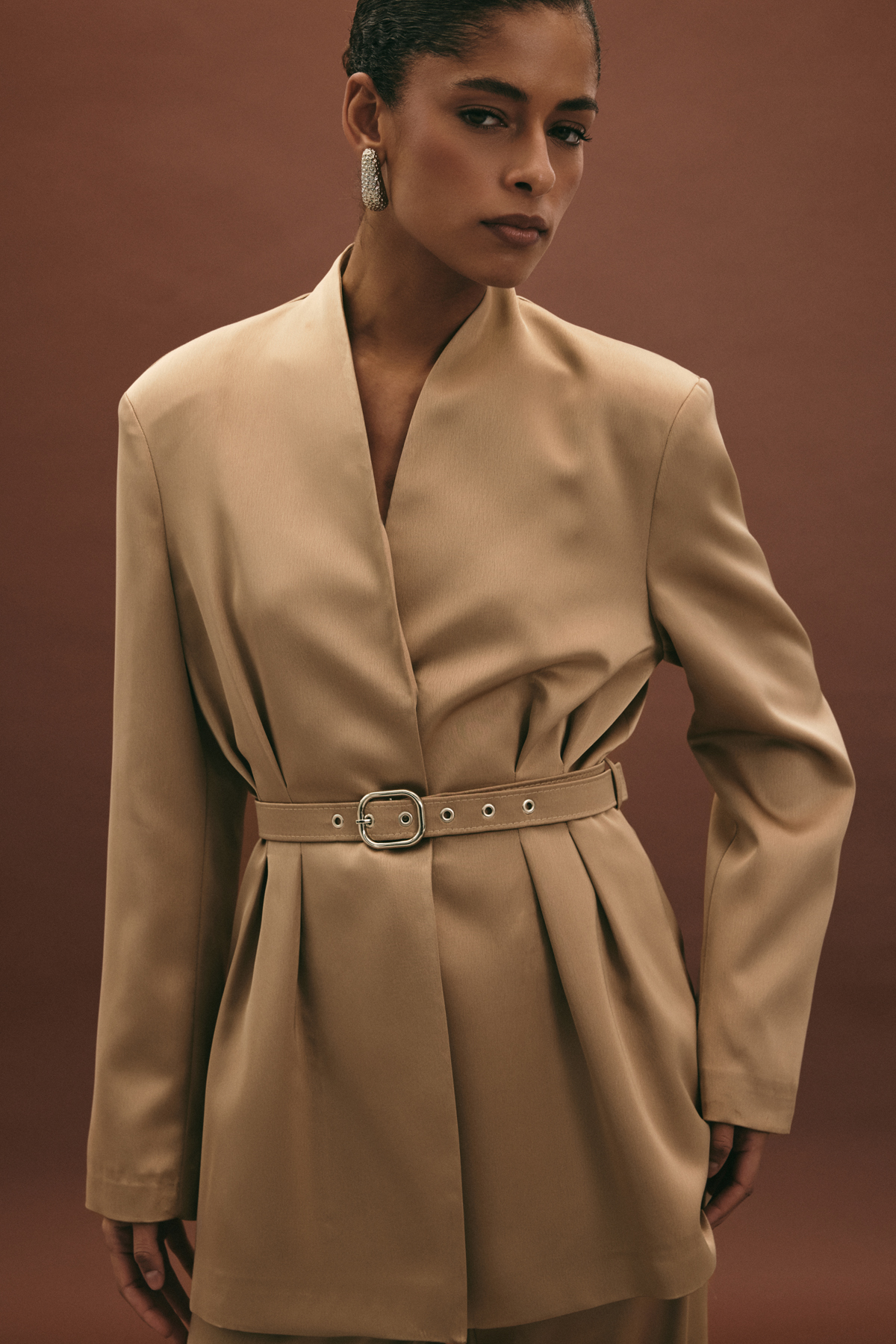 Lisa Kemerli Saten Ceket - Vizon