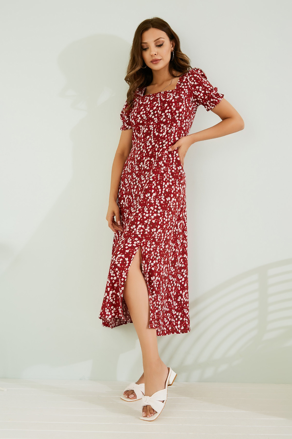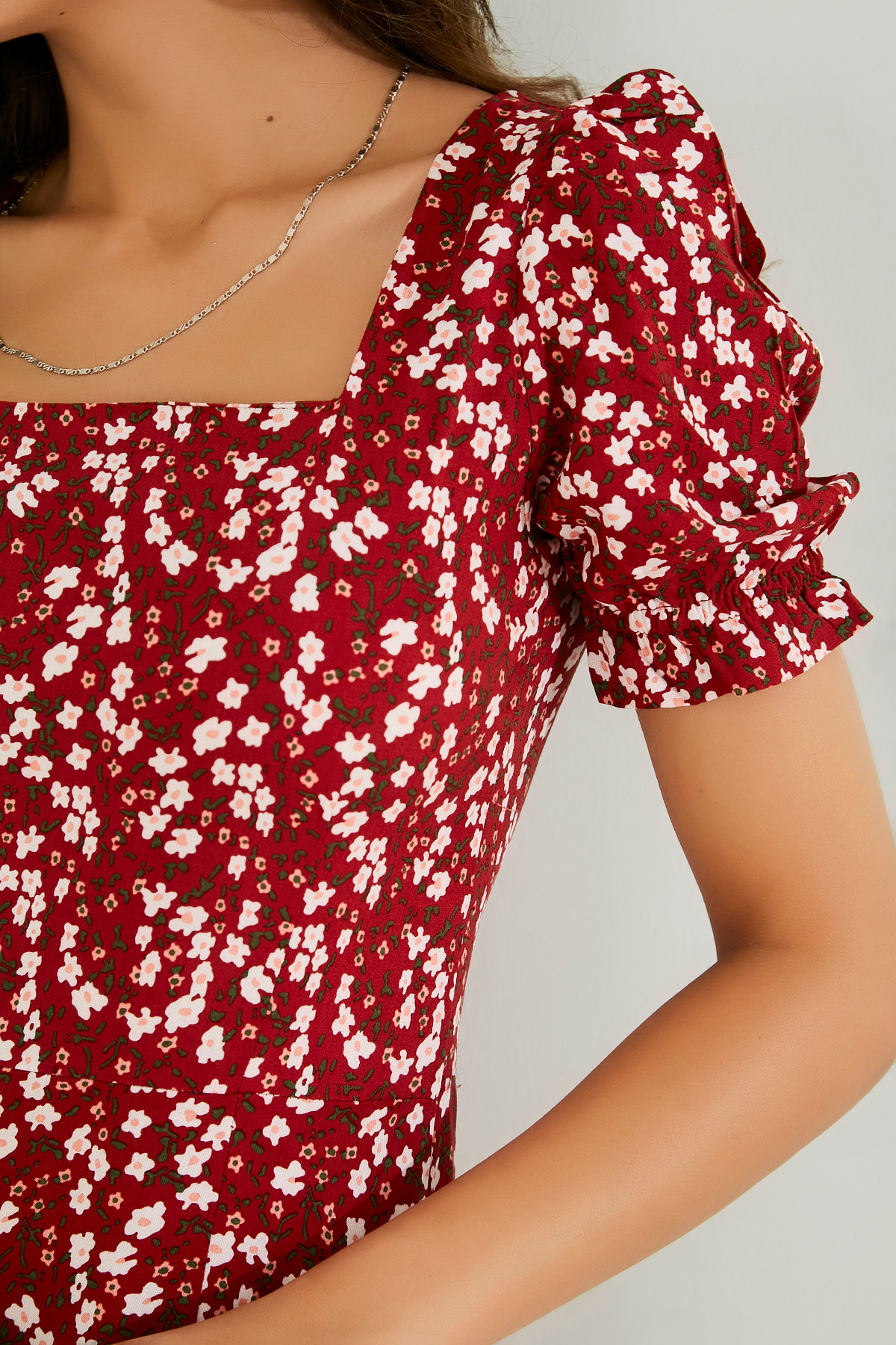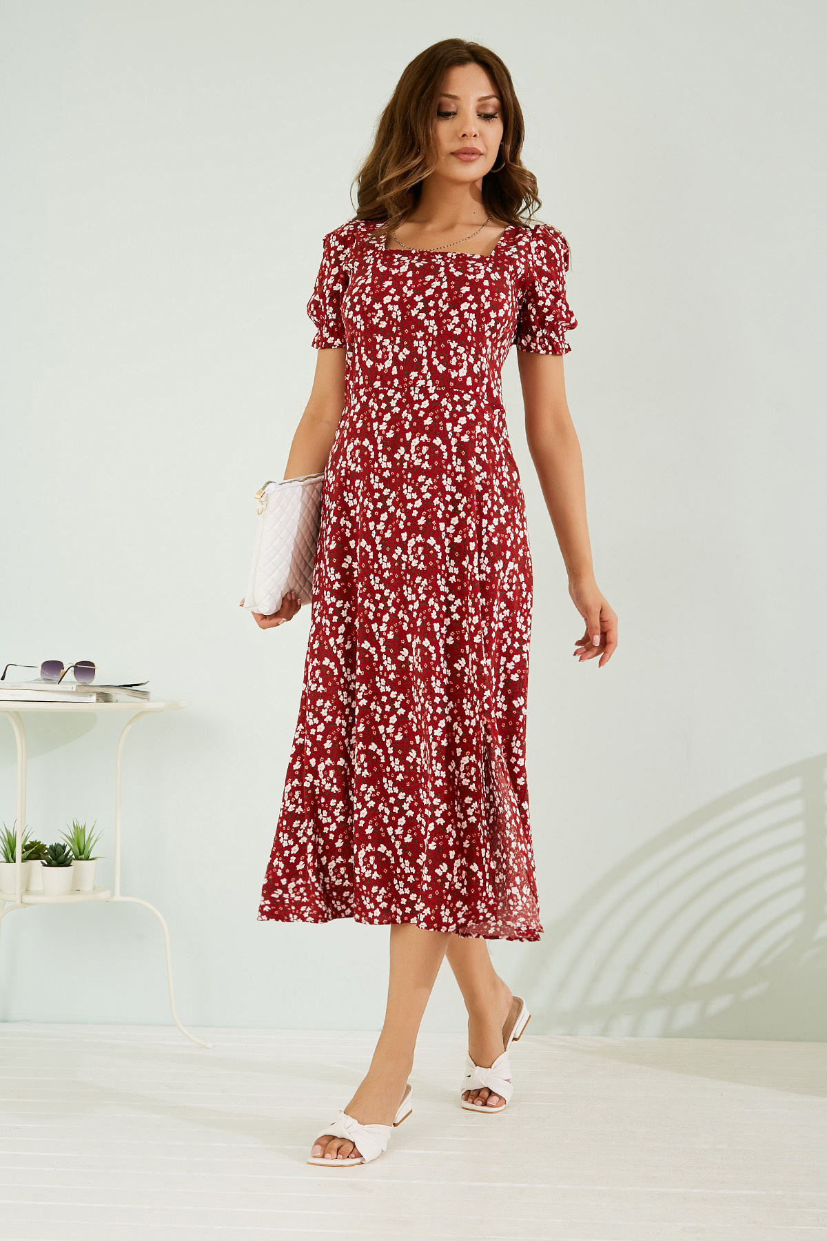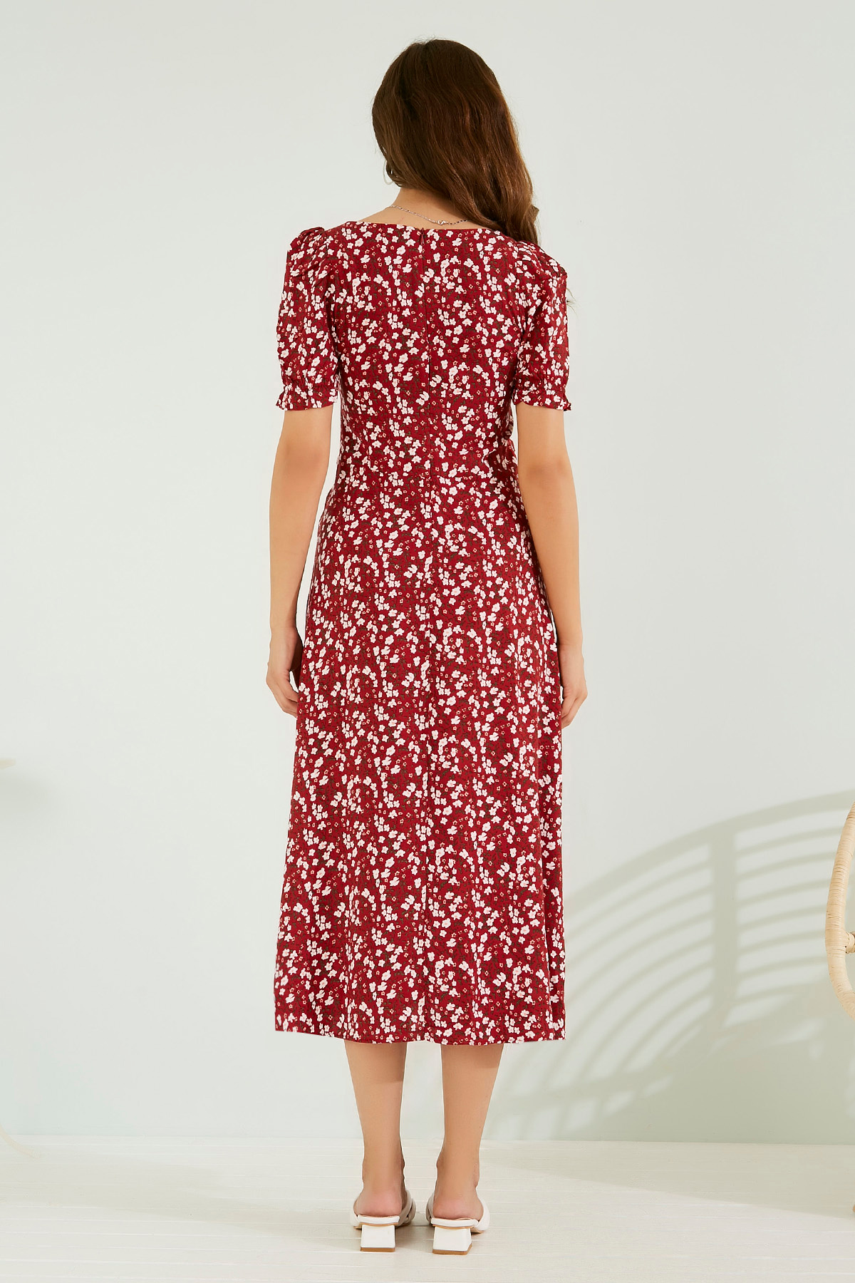 Kare yaka, lastikli kısa kol, yırtmaçlı, midi boy, tam kalıp, arka fermuarlı, desenli elbise.%100 Viskon Boy Uzunluğu: 121 cmModelin Bedeni: 36/S Bedendir.Modelin Ölçüleri : Boy:1,74, Göğüs:89, Bel:59, Kalça:93