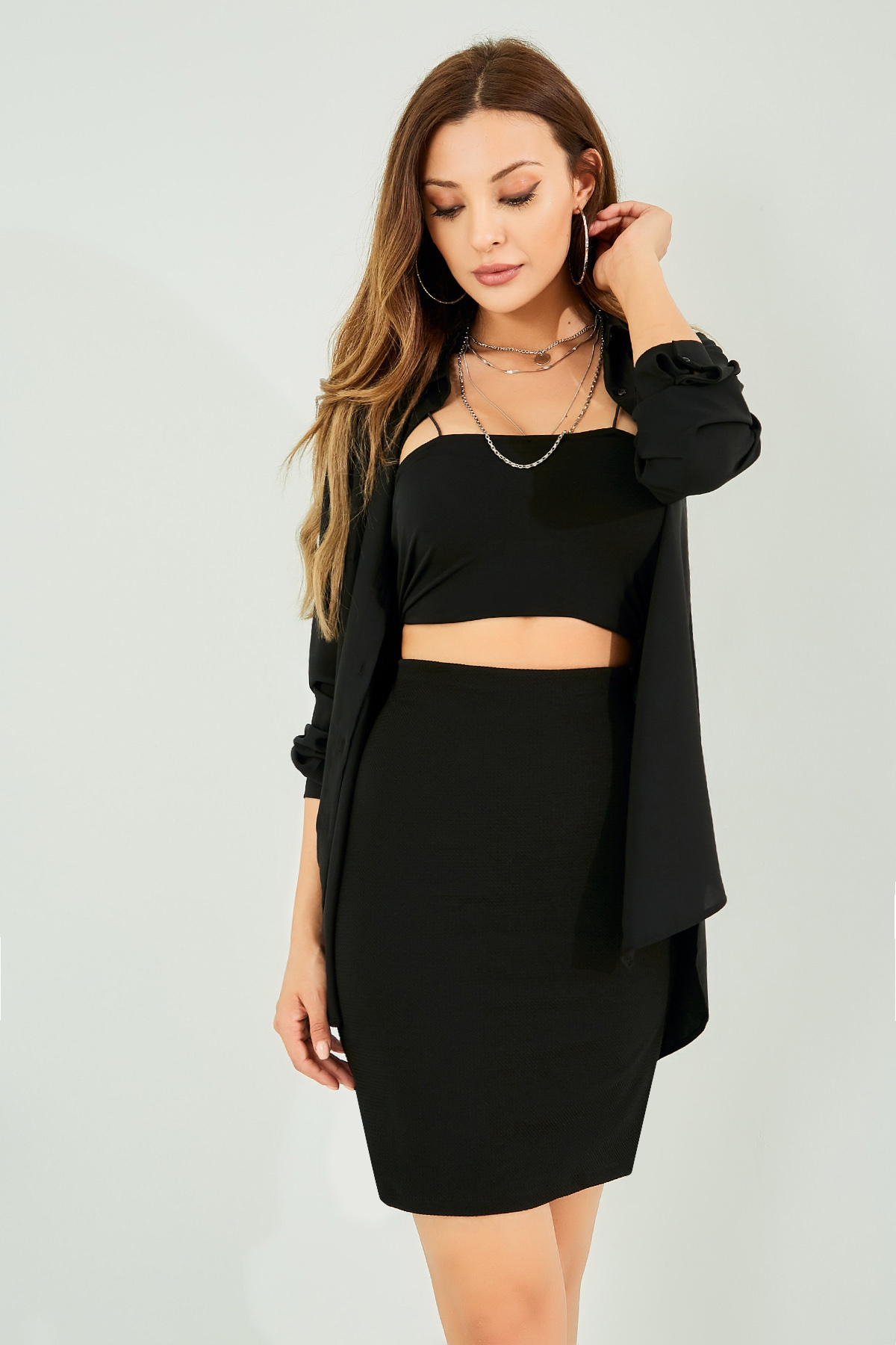 Bel lastikli, kendinden desenli, tam kalıp, mini kalem etek. Viskon-Likra Boy Uzunluğu: 48 cm Modelin Bedeni: 36/S Bedendir. Modelin Ölçüleri : Boy:1,74, Göğüs:89, Bel:59, Kalça:93 Not:Kemer ürüne ait değildir.