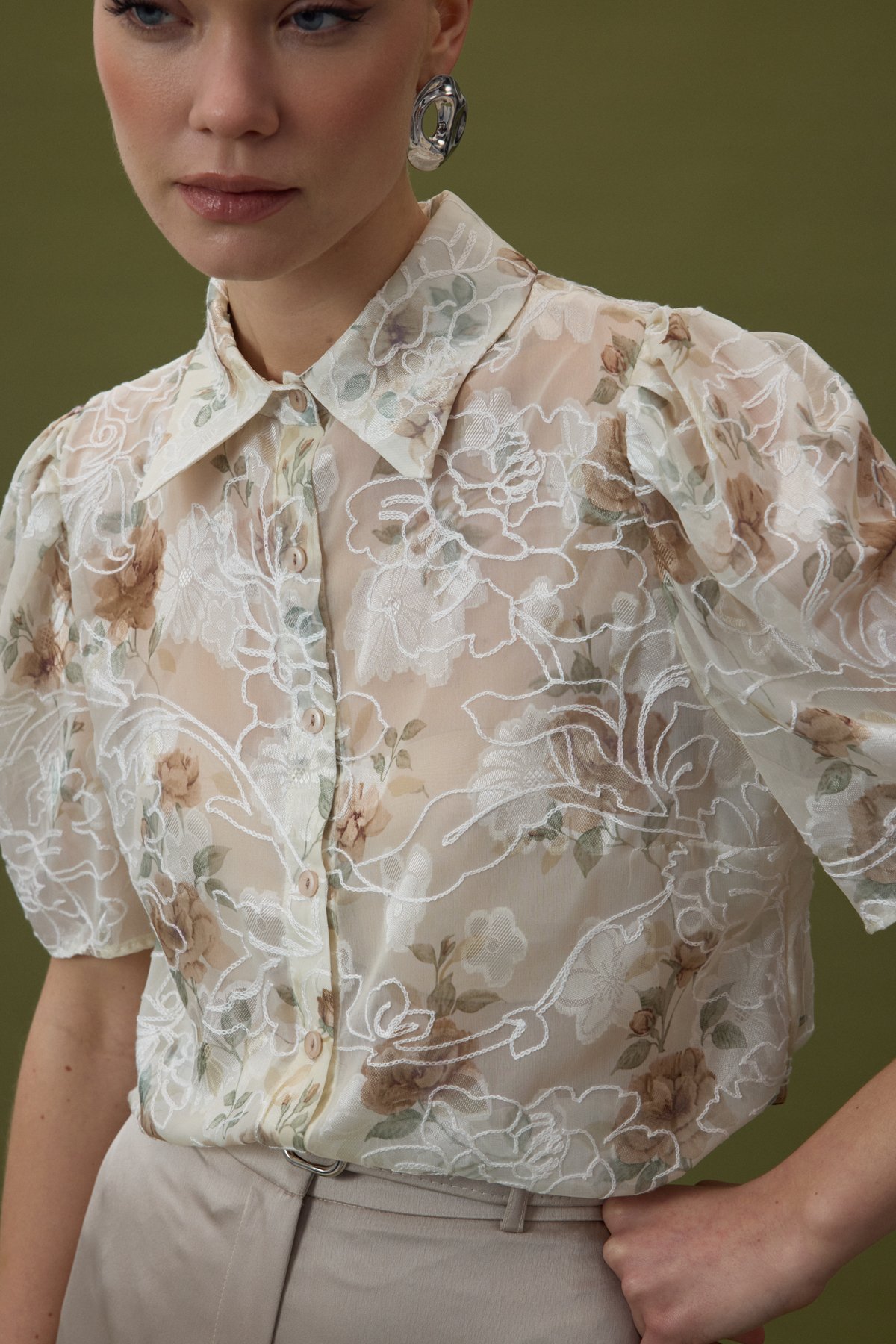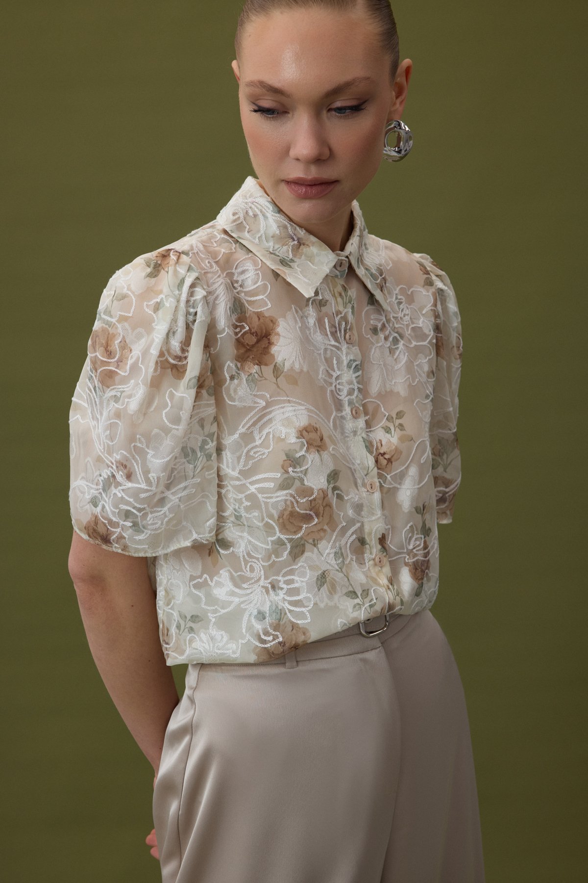 Nakışlı Kısa Kollu Gömlek - Vizon