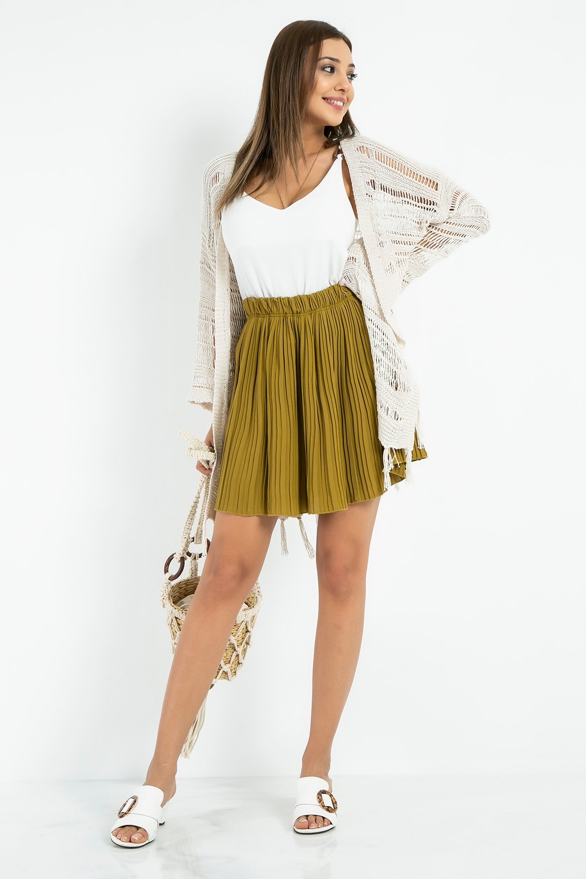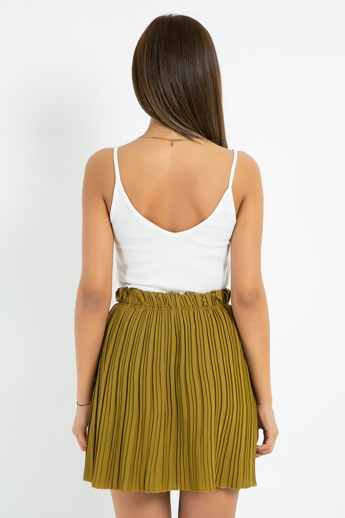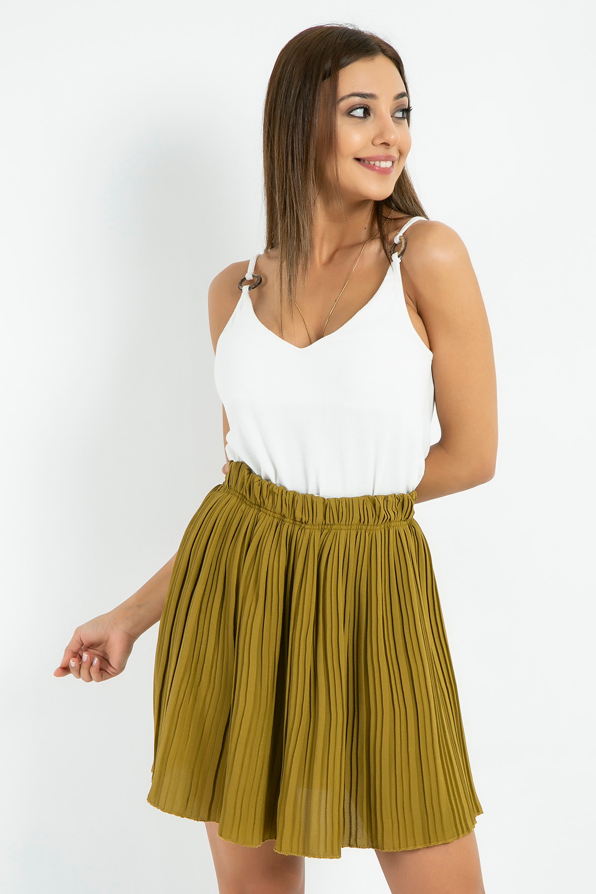 %95 Polyester %5 Likra *Beli Lastikli*Pilise*Mini Boy *Tam Kalıp*Boy Uzunluğu:46 cmNumune Bedeni: 36/S/1Modelin Ölçüleri :Boy:1,74, Göğüs:89, Bel:59, Kalça:93