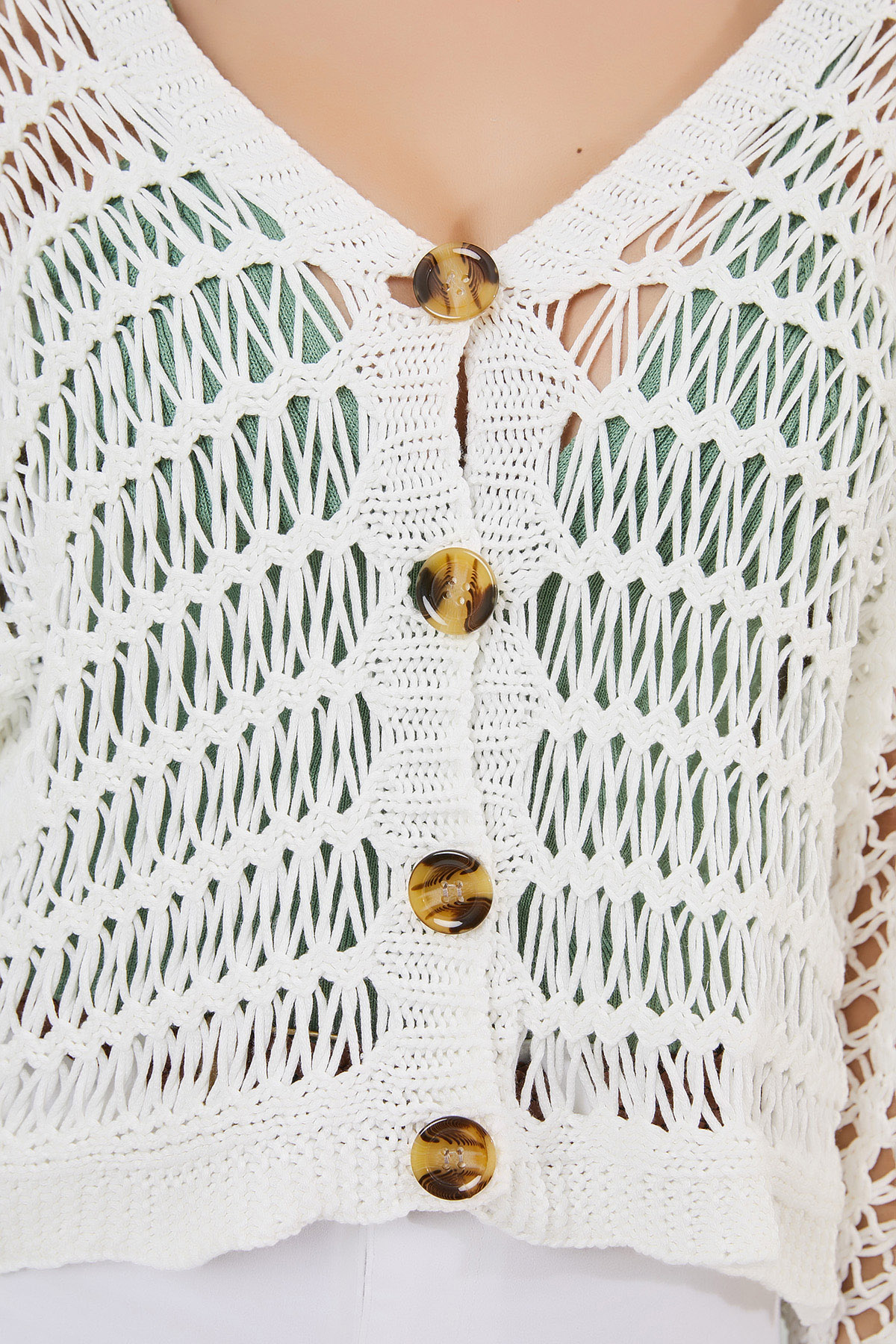 V yaka, ön düğmeli, uzun kol, salaş file hırka. %85 Akrilik %15 Likra Boy Uzunluğu: 54 cm Modelin Üzerindeki Ürün STD Bedendir. Modelin Ölçüleri:Boy:1,73, Göğüs:89, Bel:64, Kalça:92