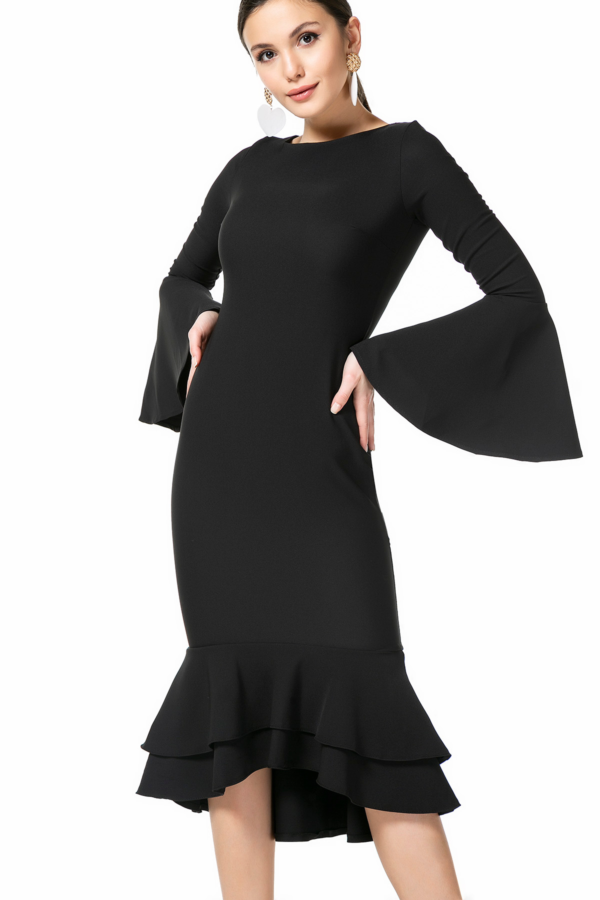 %100 Polyester *Bisiklet Yaka *Arka Fermuarlı *Uzun Volanlı Kol *Etek Ucu Volanlı *Tam Kalıp *Arkası Uzun *Boy Uzunluğu:Ön:105 cm Arka:117 cmNumune Bedeni: 36/S/1Modelin Ölçüleri : Boy:1,74, Göğüs:88, Bel:64, Kalça:94