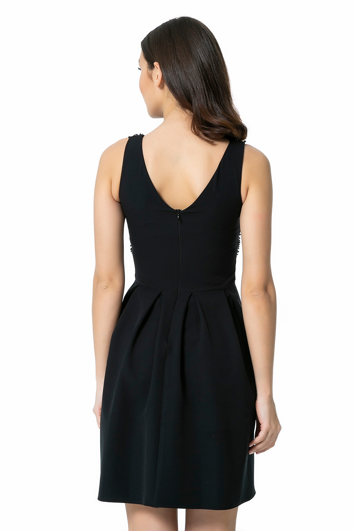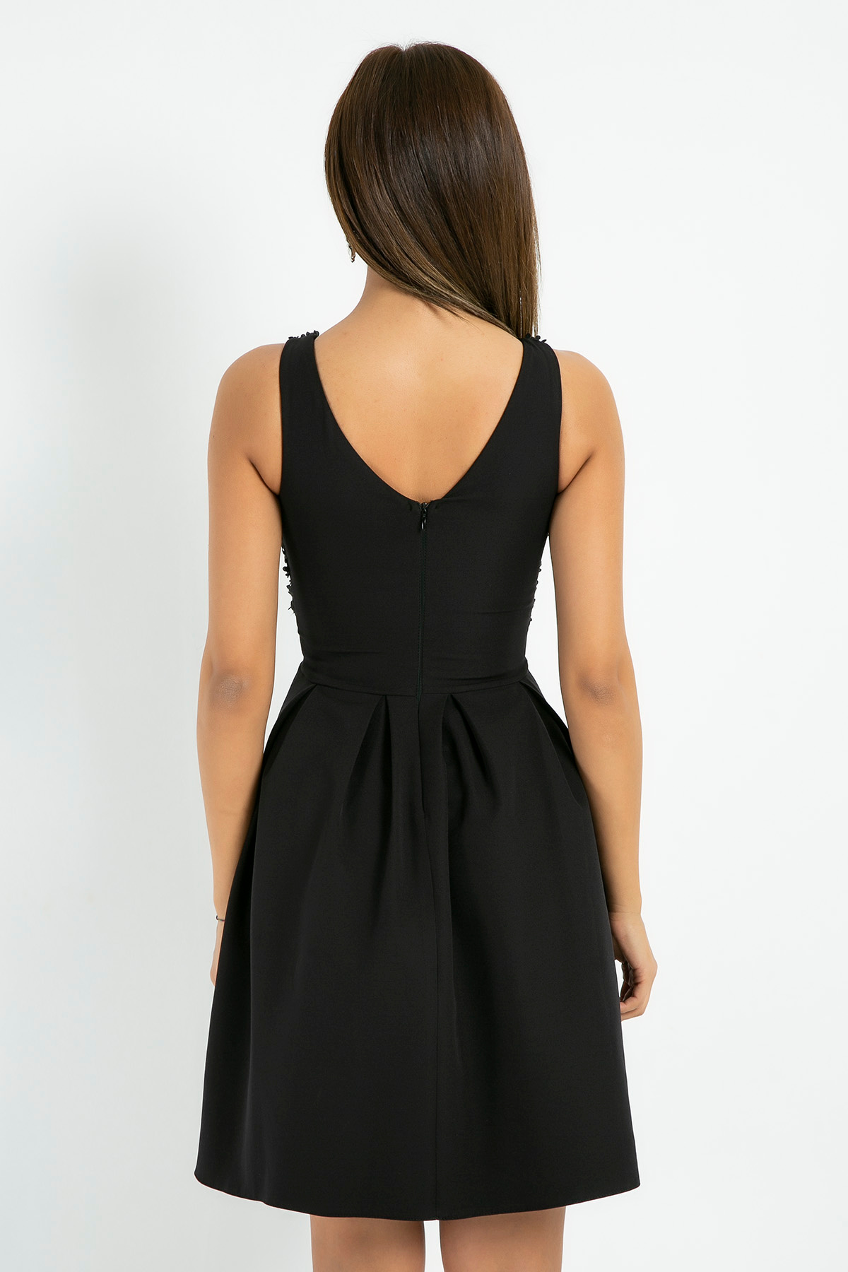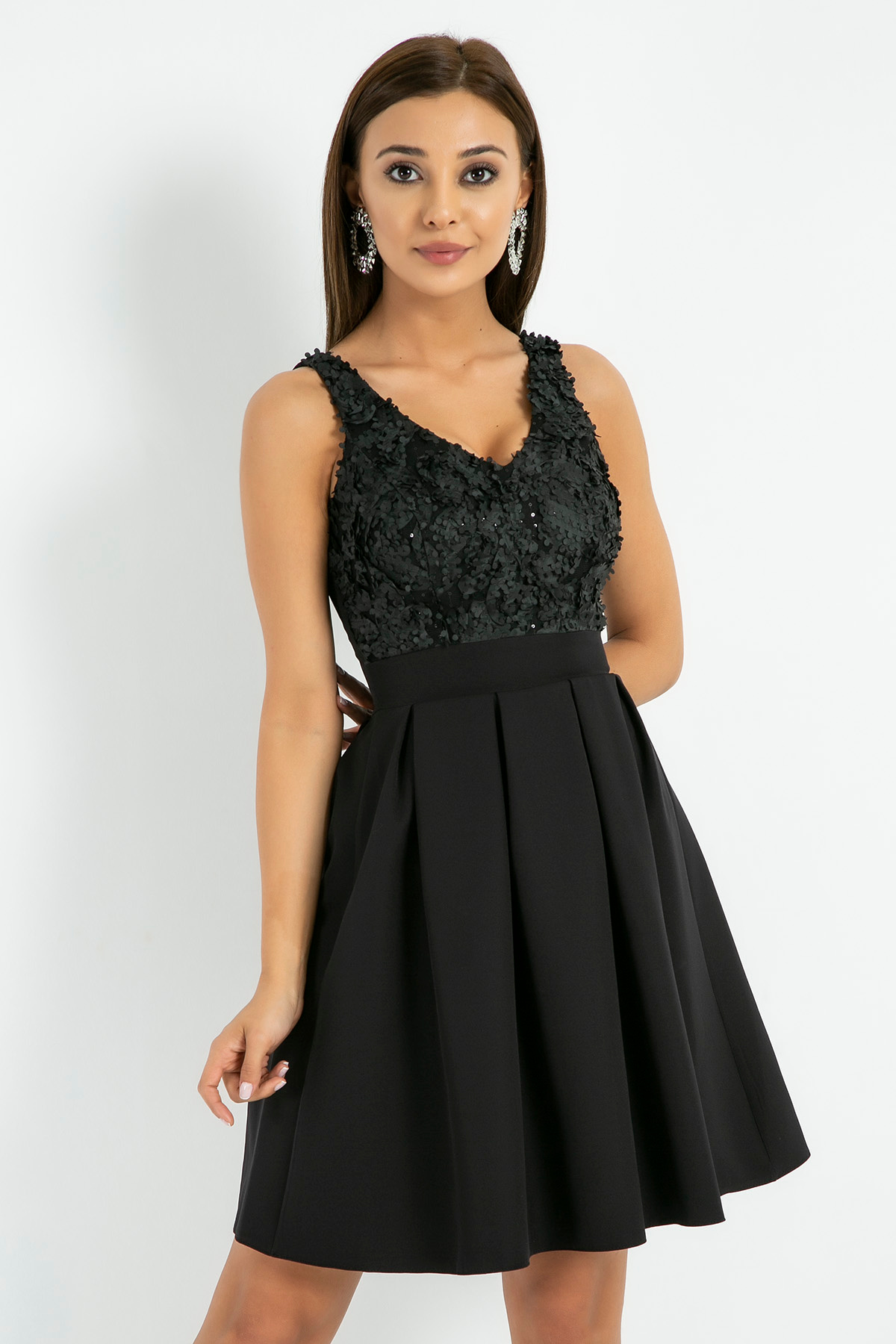 %100 Polyester *Ön-Arka V Yaka *Kalın Askılı *Çiçek Detay *Göğüs Kaplı*Etek Pileli*Mini Boy *Arka Fermuarlı *Tam Kalıp *Boy Uzunluğu:90 cm Numune Bedeni: 36/S/1Modelin Ölçüleri : Boy:1,74, Göğüs:89, Bel:59, Kalça:93