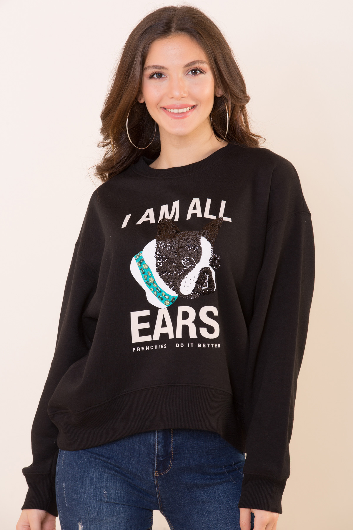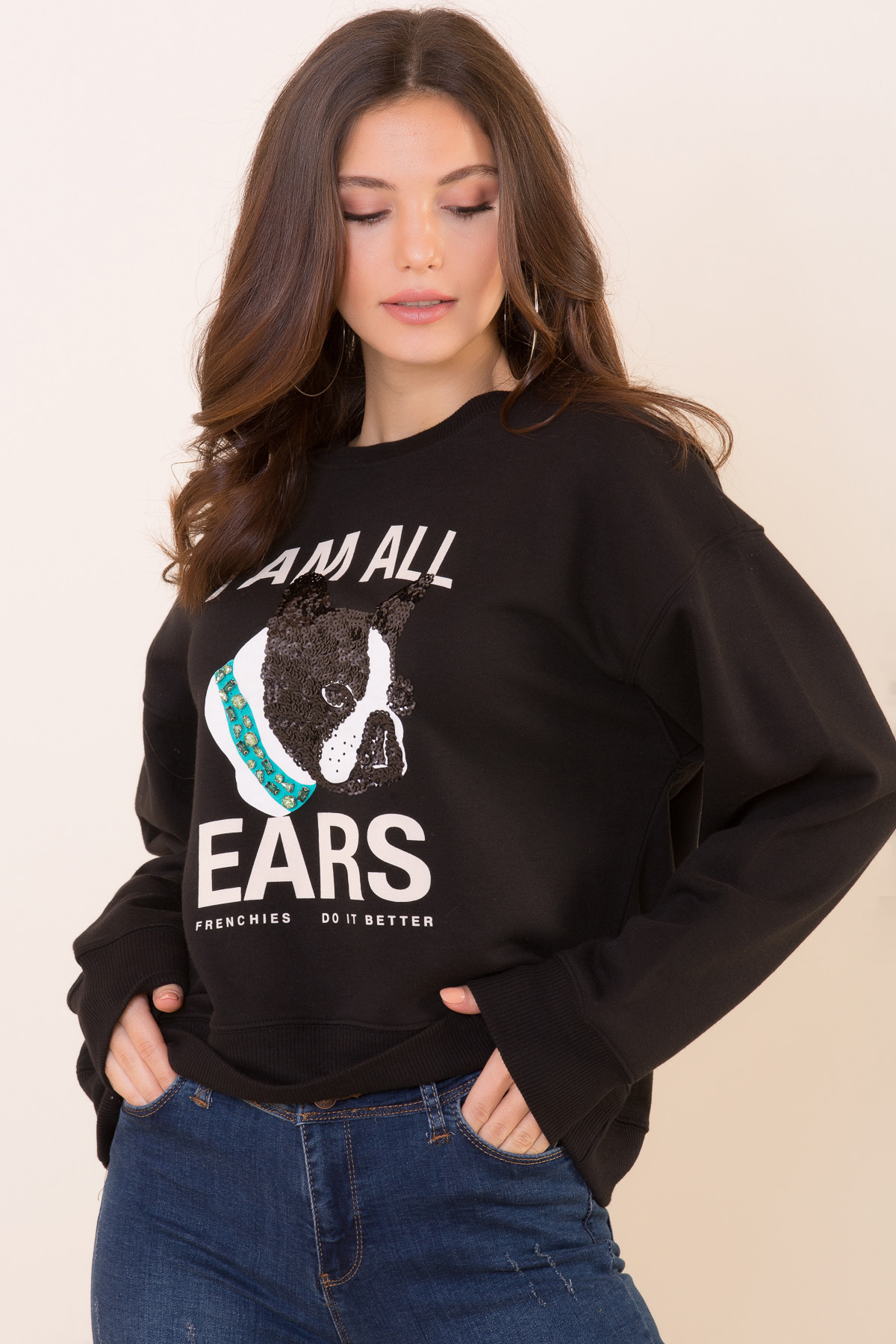 %65 Polyester %35 Viskon *Bisiklet Yaka *Uzun Kol *Payet-Taş-Yazı Detaylı*Geniş Kalıp*Boy Uzunluğu:61 cm Numune Bedeni: 36/S/1Modelin Ölçüleri : Boy:1,74, Göğüs:88, Bel:64, Kalça:94