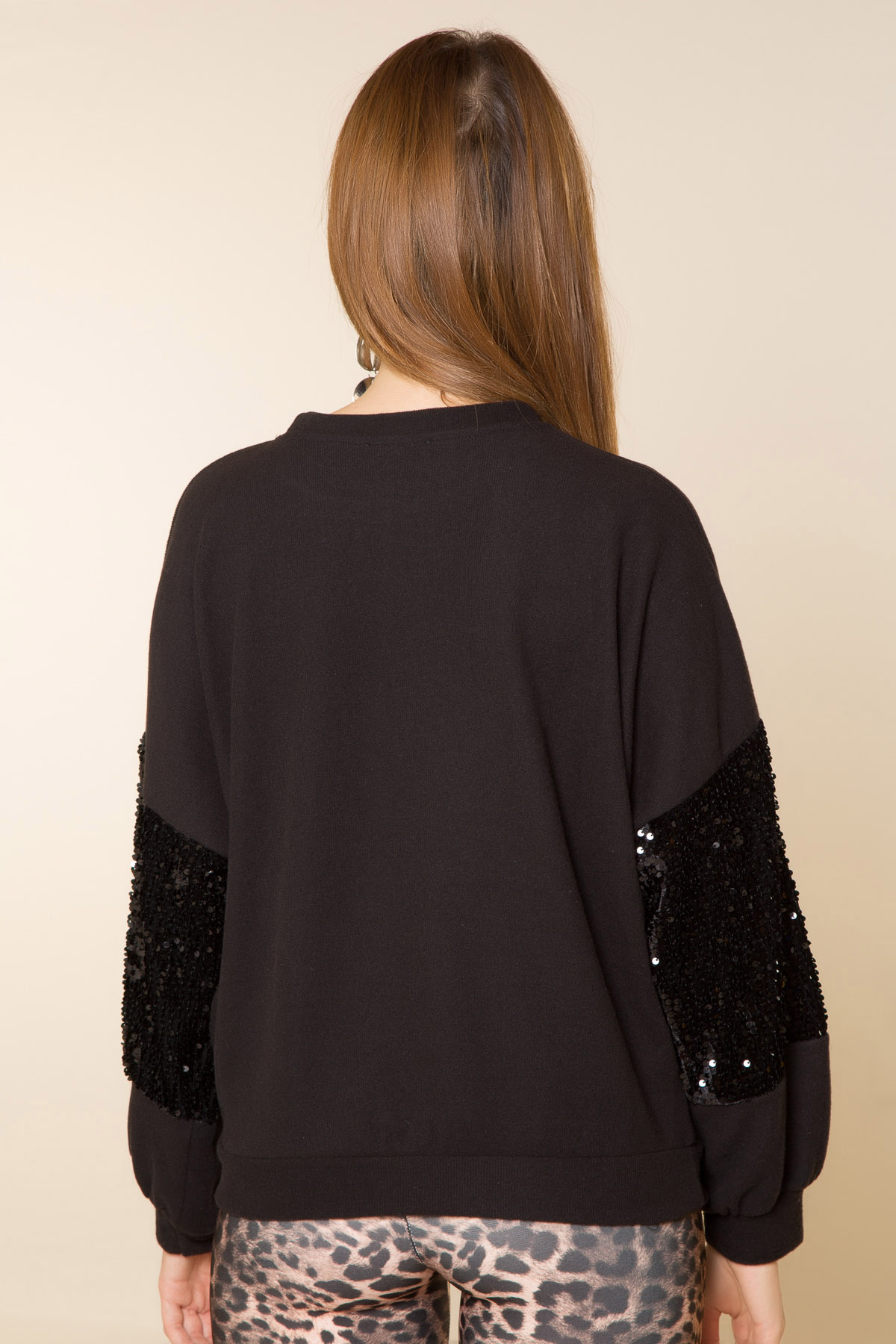 %75 Pamuk %25 Polyester *Bisiklet Yaka *Geniş-Uzun Kol *Payetli*Geniş Kalıp*Boy Uzunluğu: 59 cm Numune Bedeni: STDModelin Ölçüleri : Boy:1,77, Göğüs:88, Bel:64, Kalça:89
