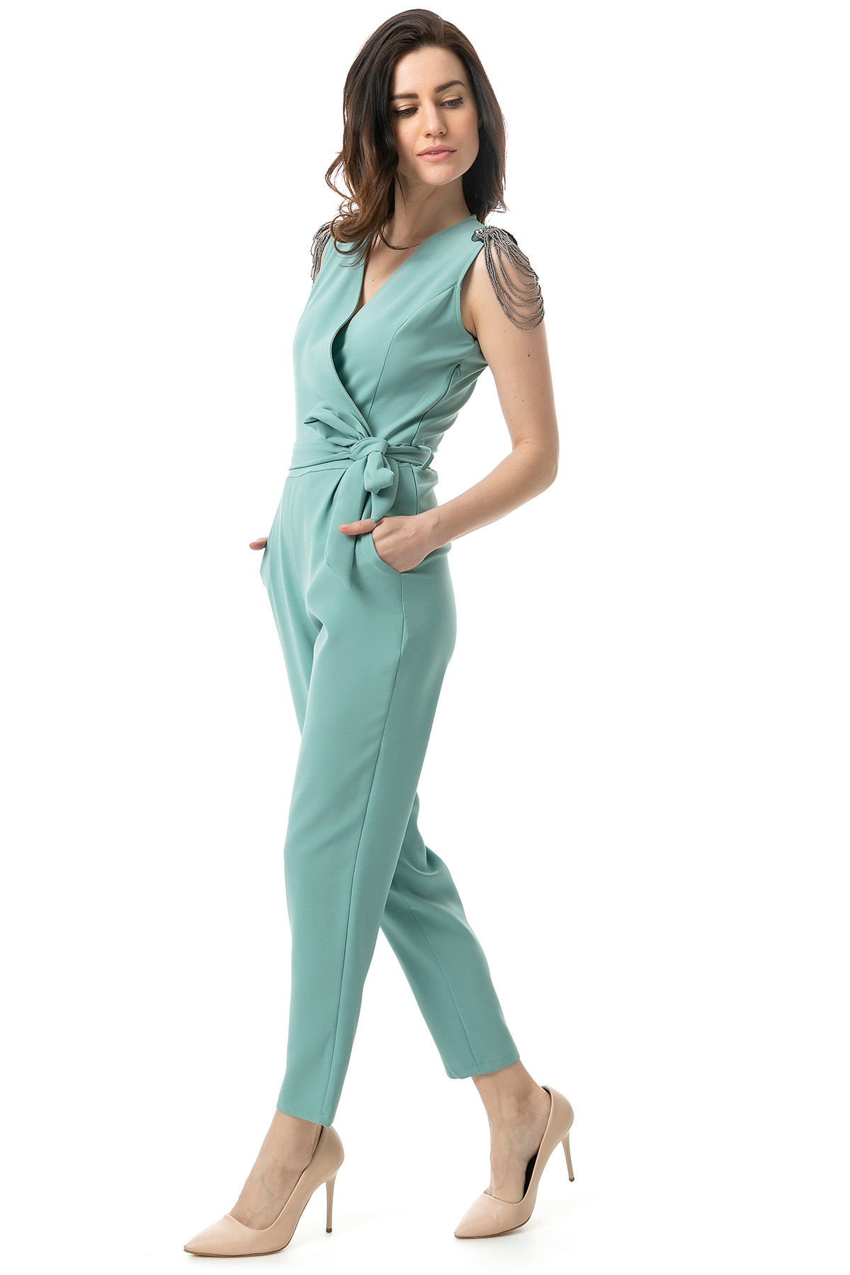 %100 Polyester*Kruvaze*Beli Kuşaklı*Sıfır Kol*Omuzları Aksesuarlı*Yan Fermuarlı*Cepli*Boru Paça*Boy Uzunluğu:137 cm Numune Bedeni: 36/S/1Modelin Ölçüleri : Boy:1,72, Göğüs:84, Bel:60, Kalça:90