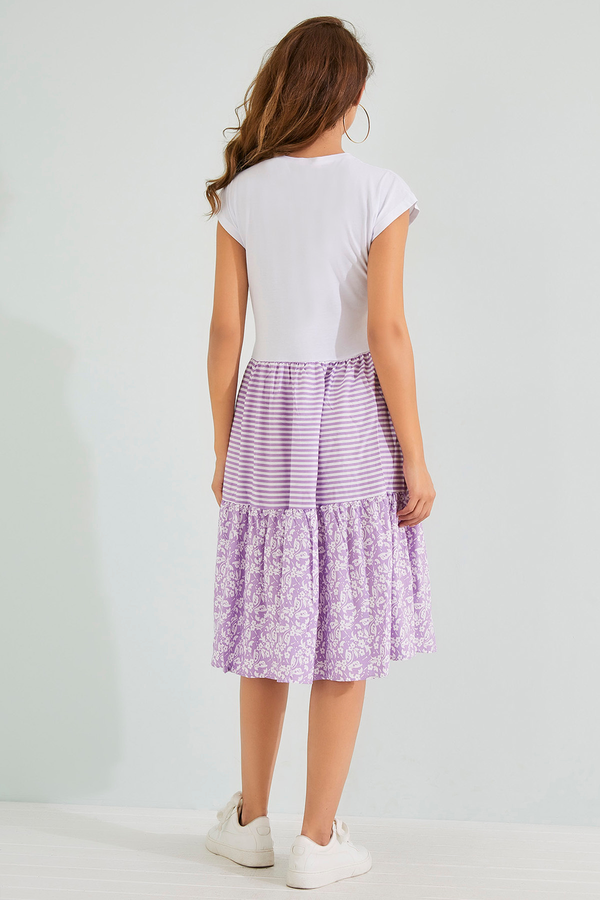 Üstü Penye Altı Poplin Elbise - LİLA-BEYAZ