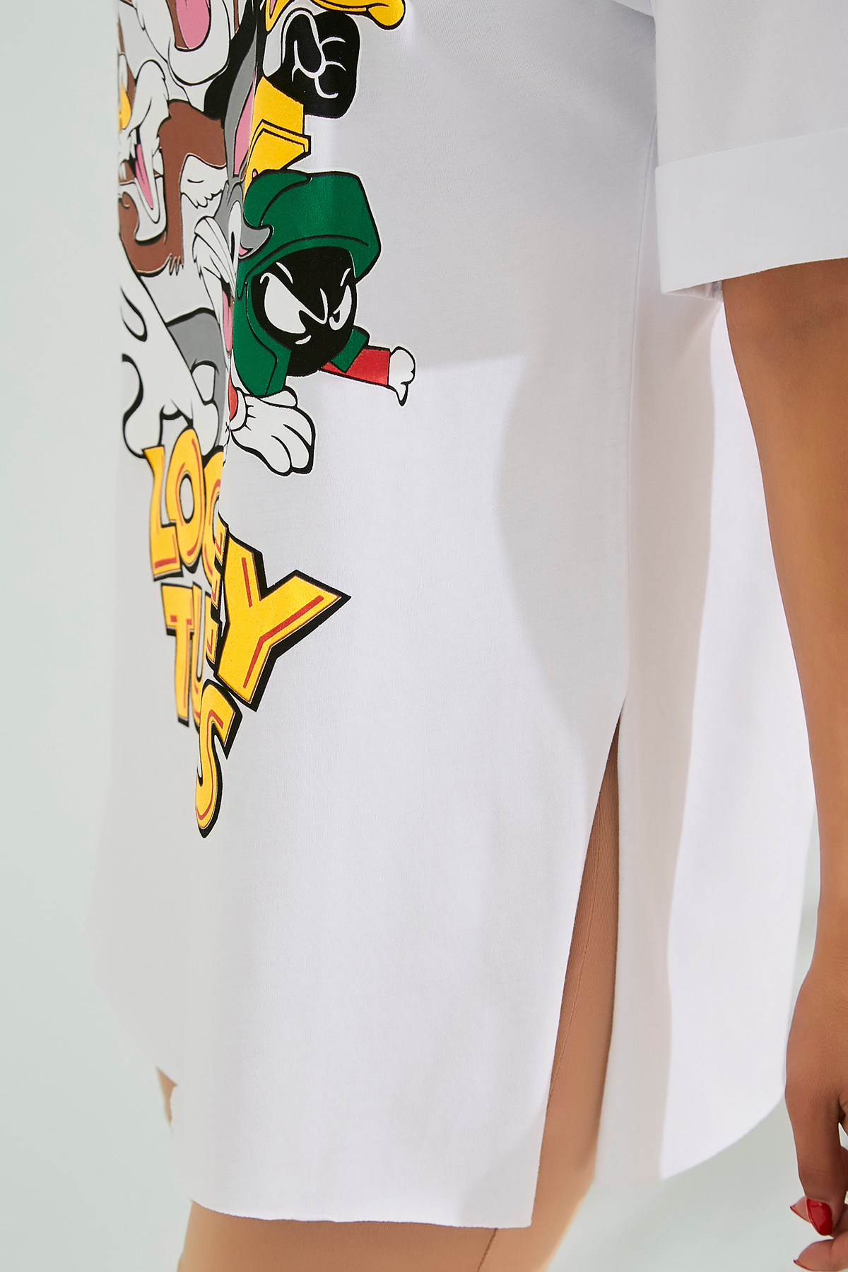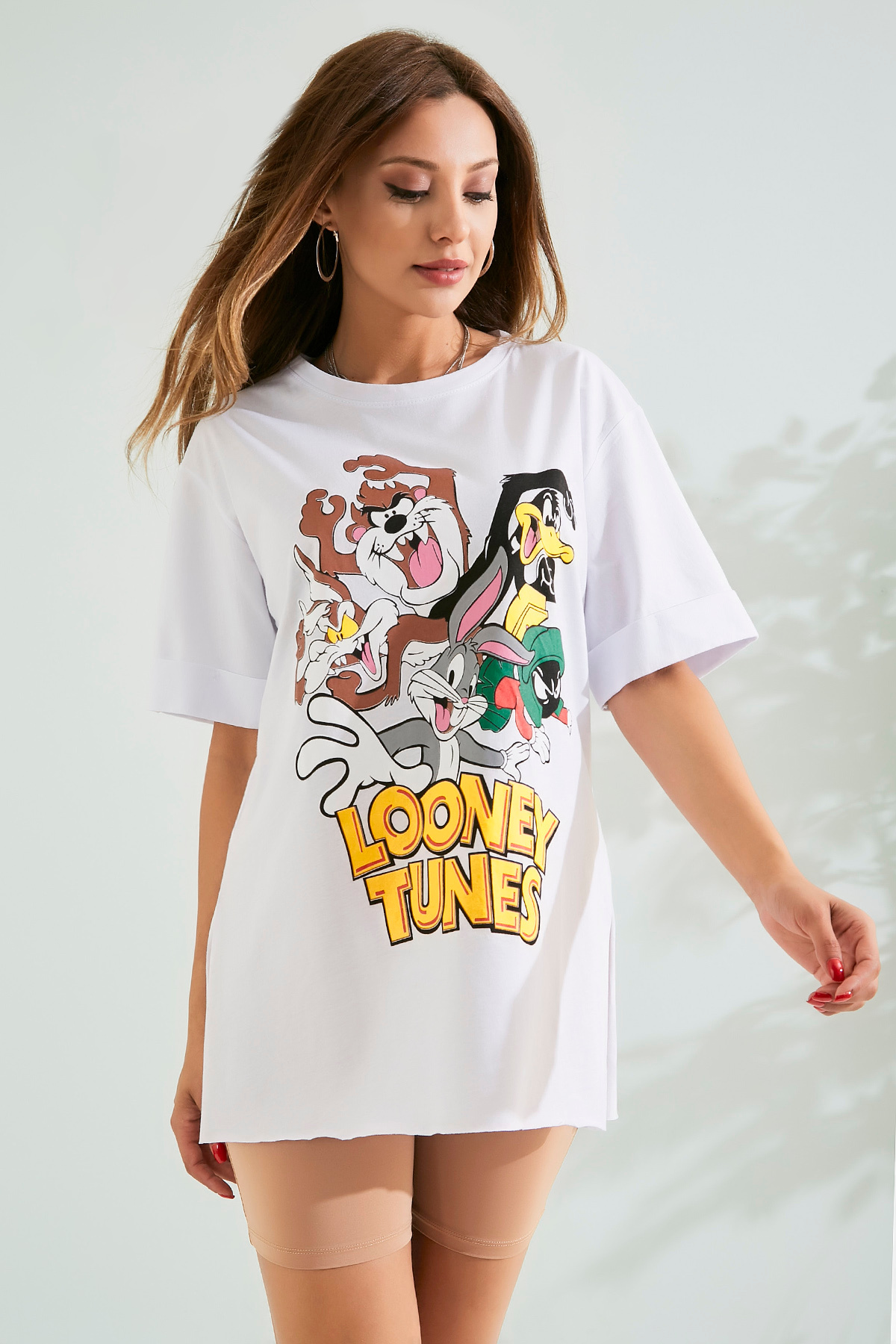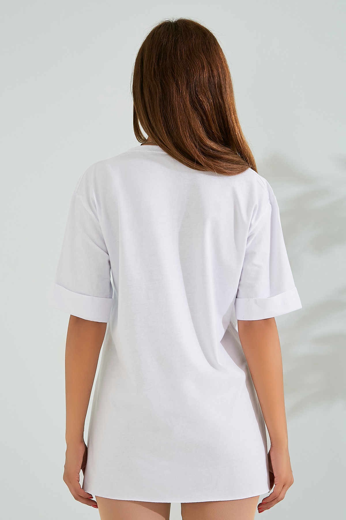Bisiklet yaka, katlı geniş kol, yanlar yırtmaçlı, ön baskılı, uzun tshirt. Pamuk Boy Uzunluğu: 74 cm Modelin Üzerindeki Ürün 36/S Bedendir Modelin Ölçüleri : Boy:1,74, Göğüs:89, Bel:59, Kalça:93