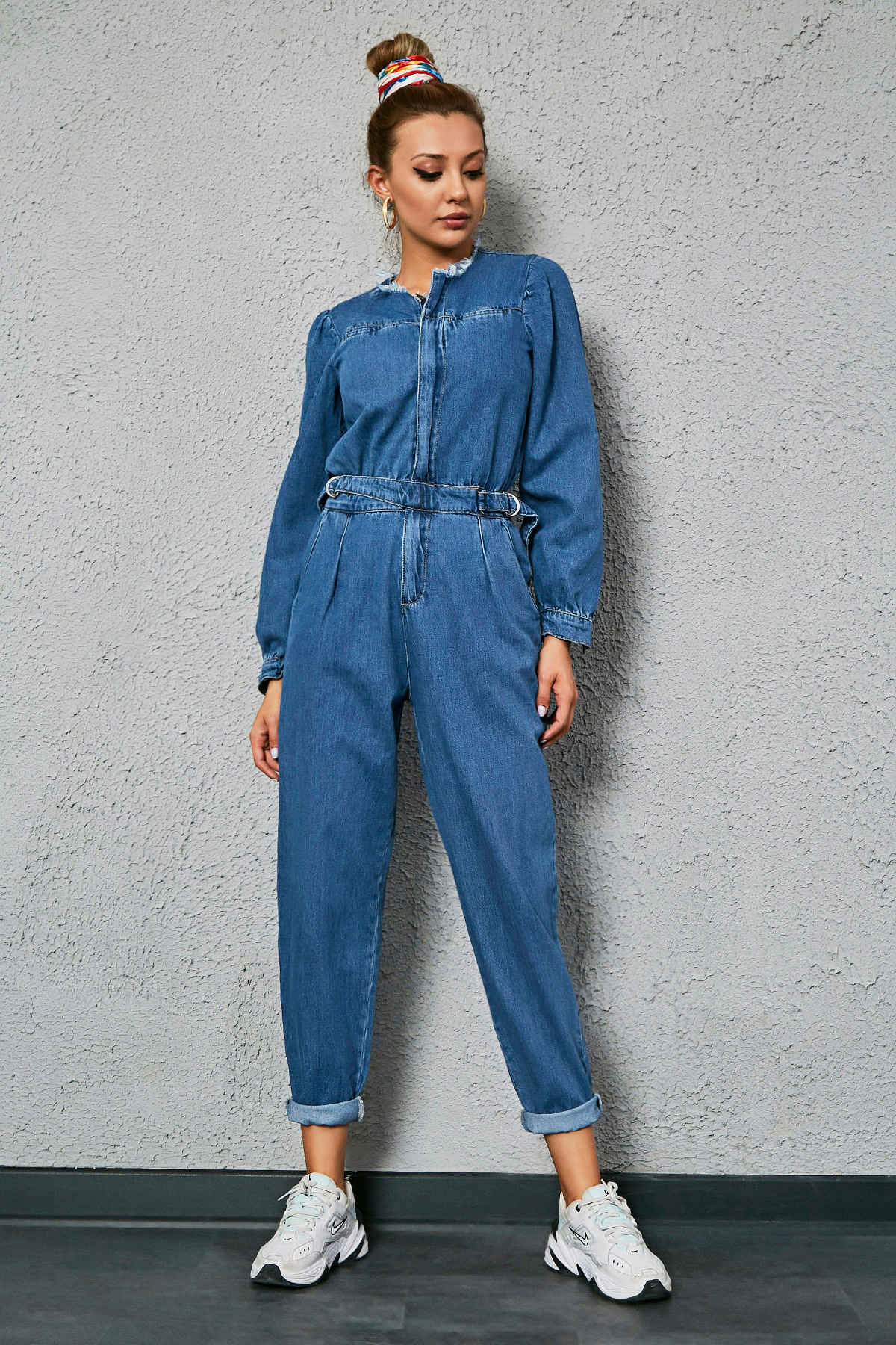 Püsküllü bisiklet yaka, uzun-balon-çıtçıtlı kol, cepli, düz paça, ön yarım fermuarlı, geniş kalıp jean tulum. %100 Pamuk Boy Uzunluğu: 135 cm Modelin Üzerindeki Ürün 36/S Bedendir. Modelin Ölçüleri : Boy:1,74, Göğüs:89, Bel:59, Kalça:93