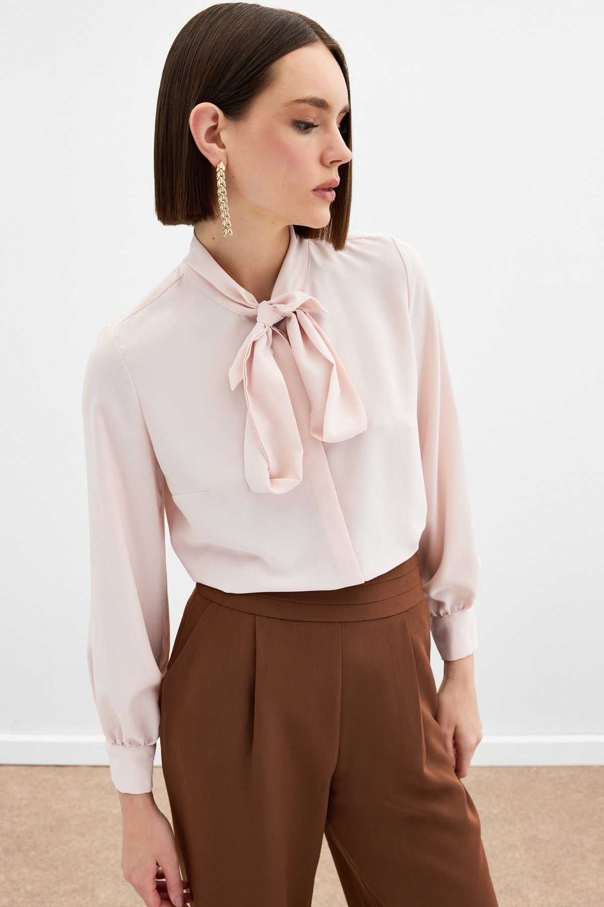 Yakası Bağlamalı Düz Gömlek - Pudra