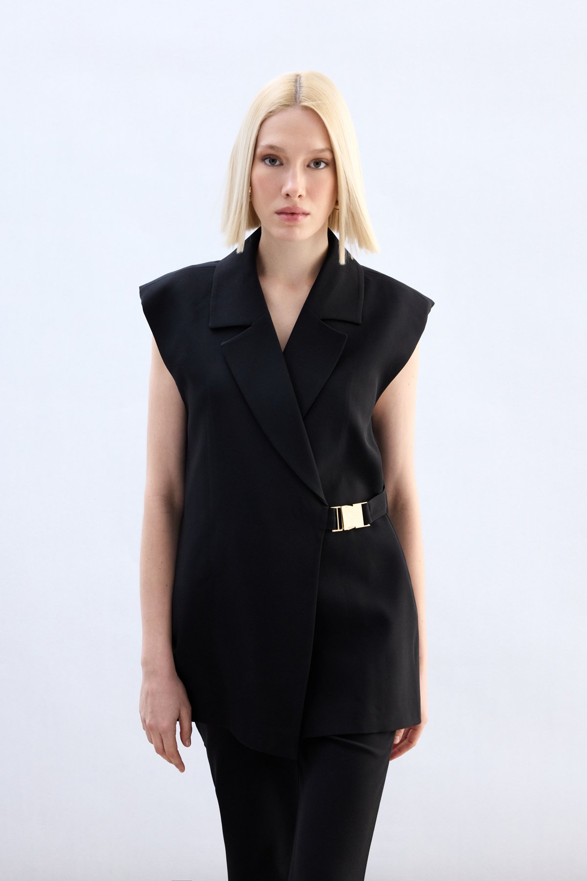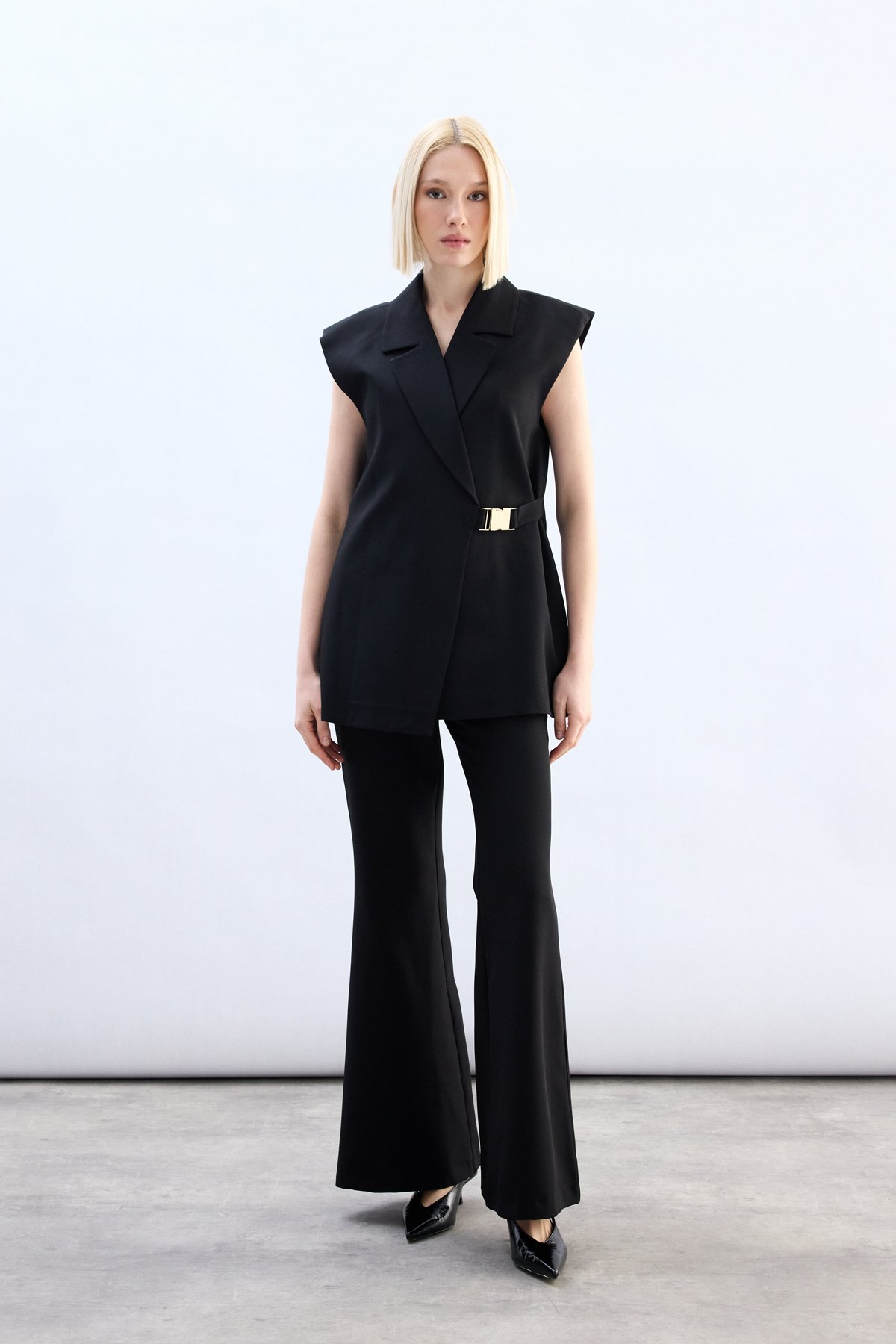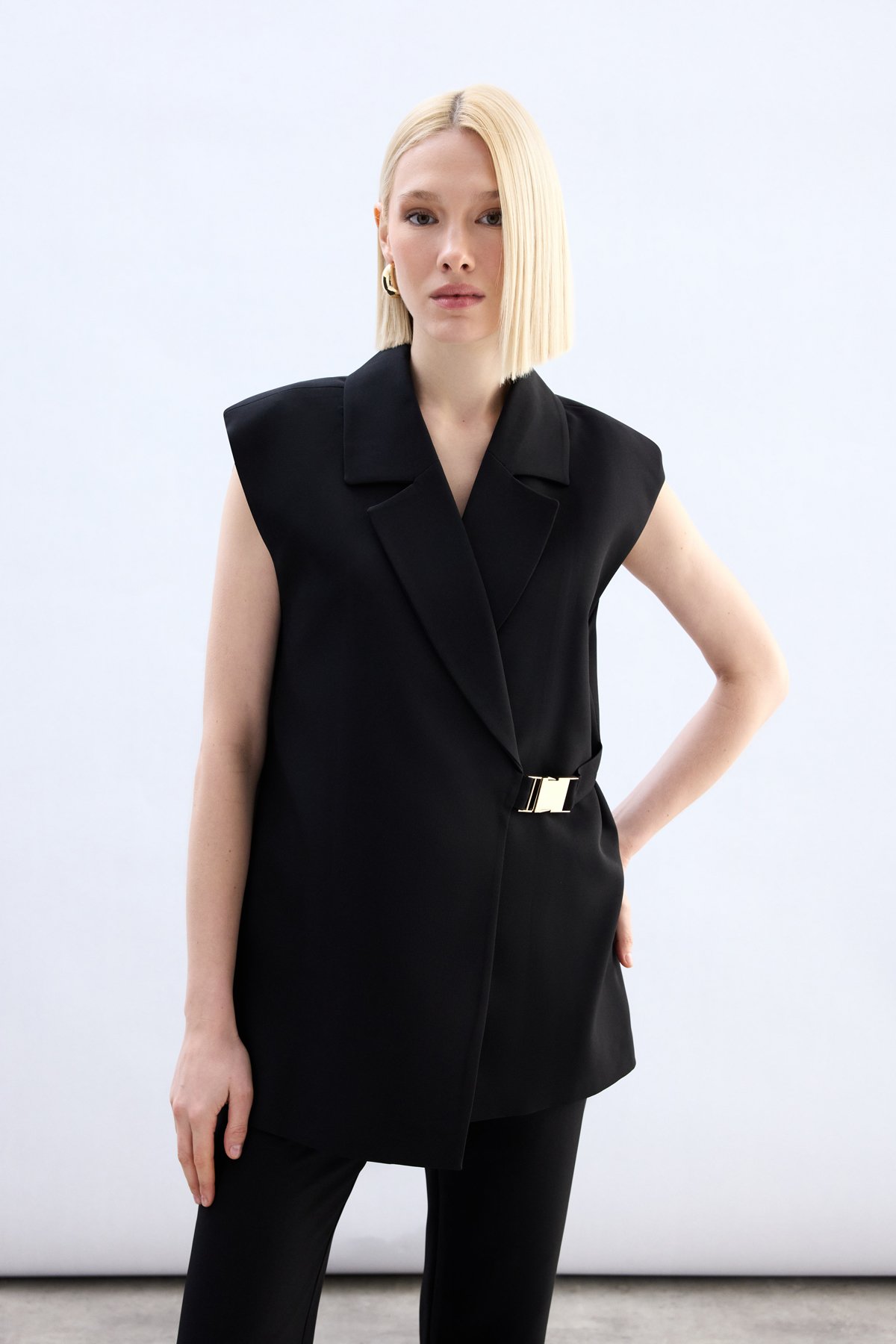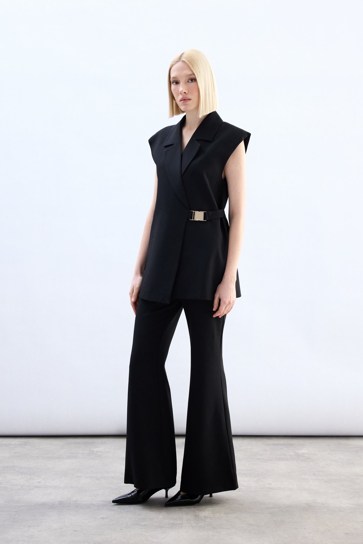 Yan Kemerli Uzun Yelek - Siyah
