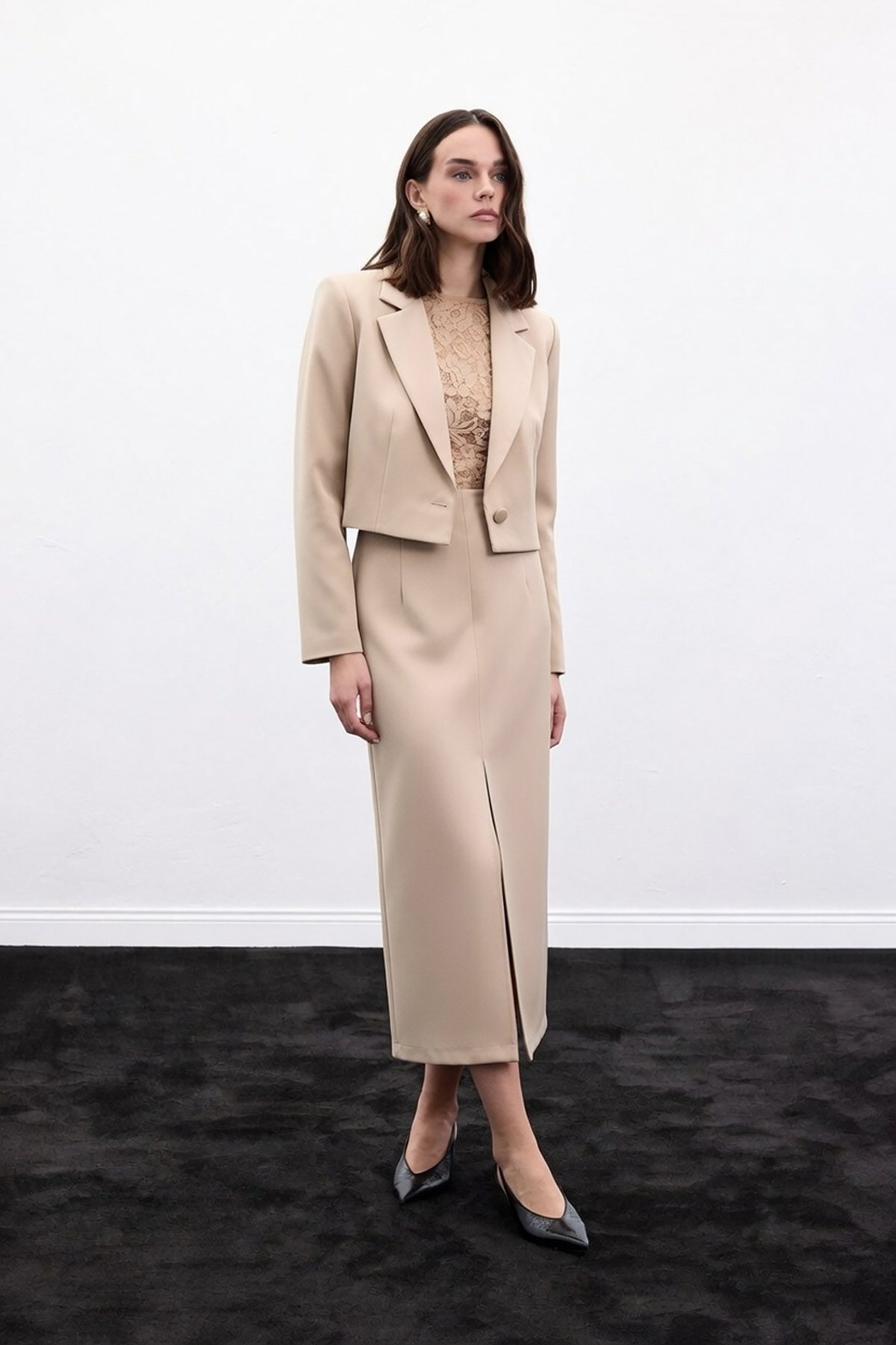Yırtmaçlı Midi Etek - Bej