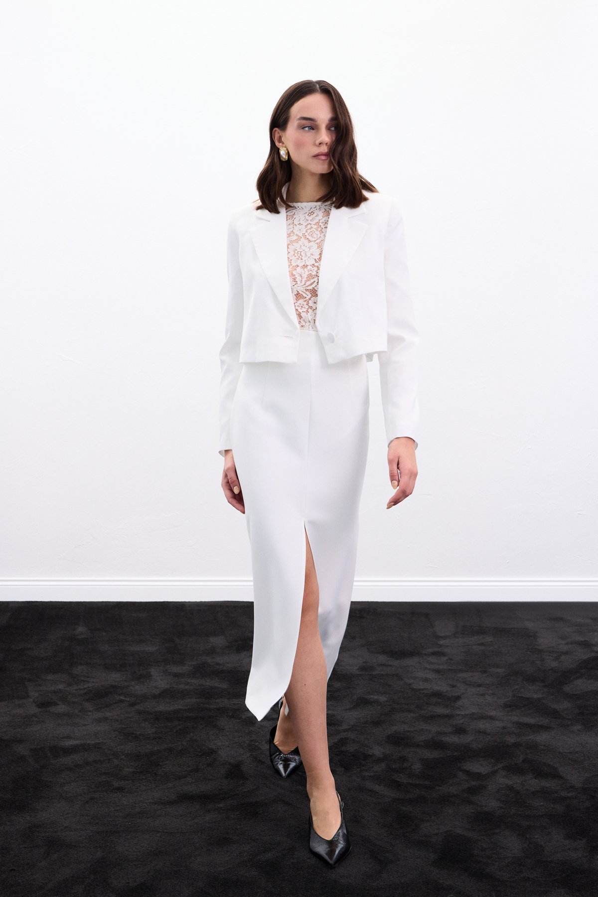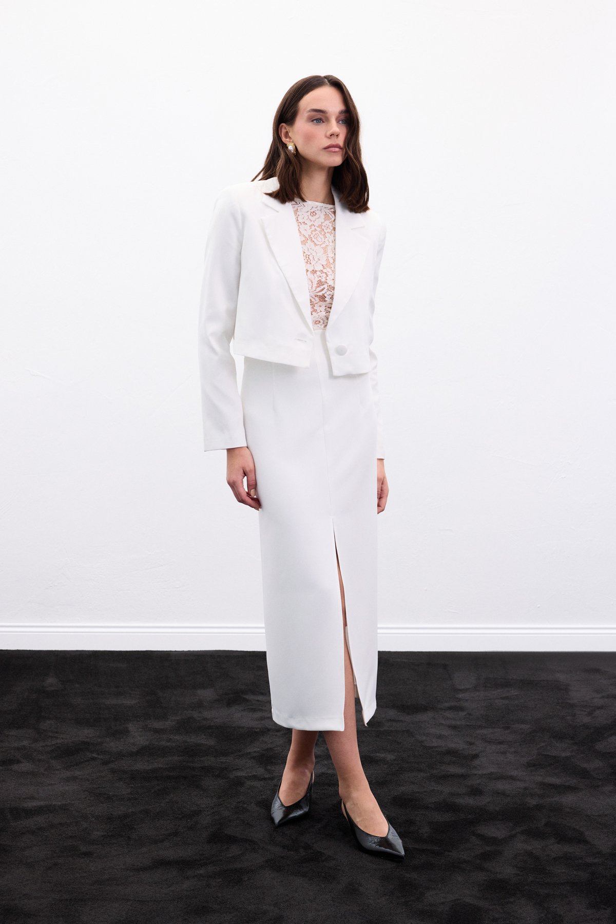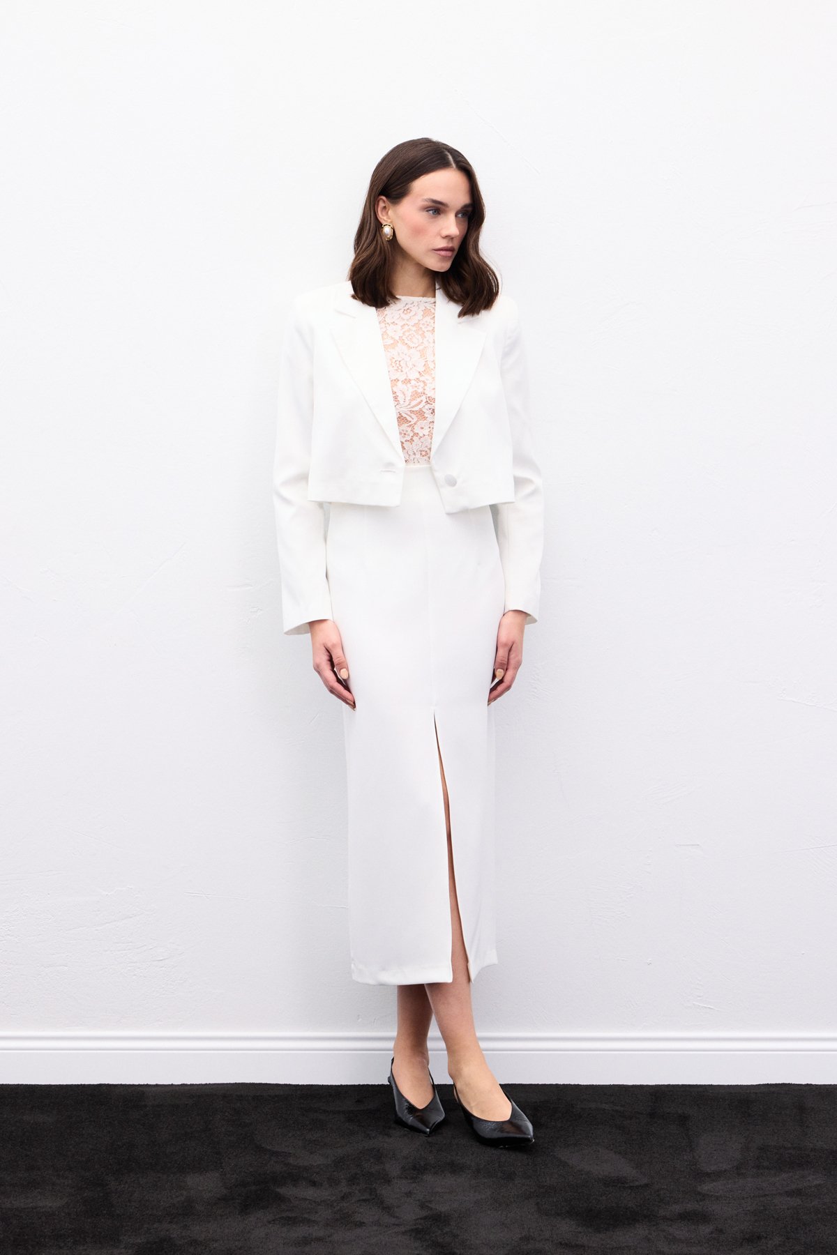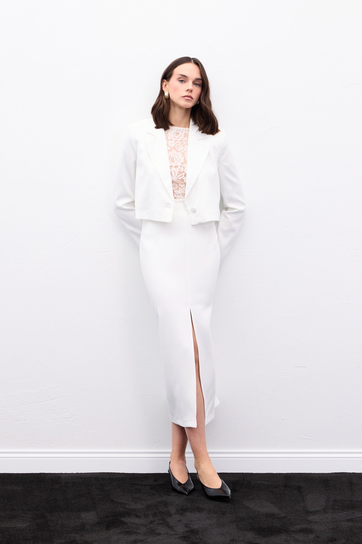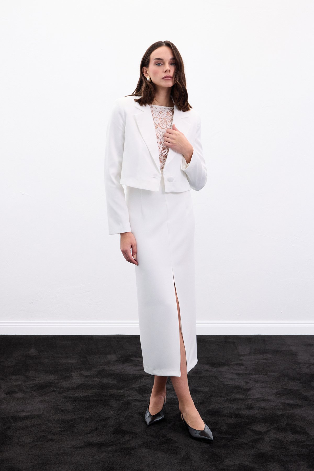 Yırtmaçlı Midi Etek - Ekru