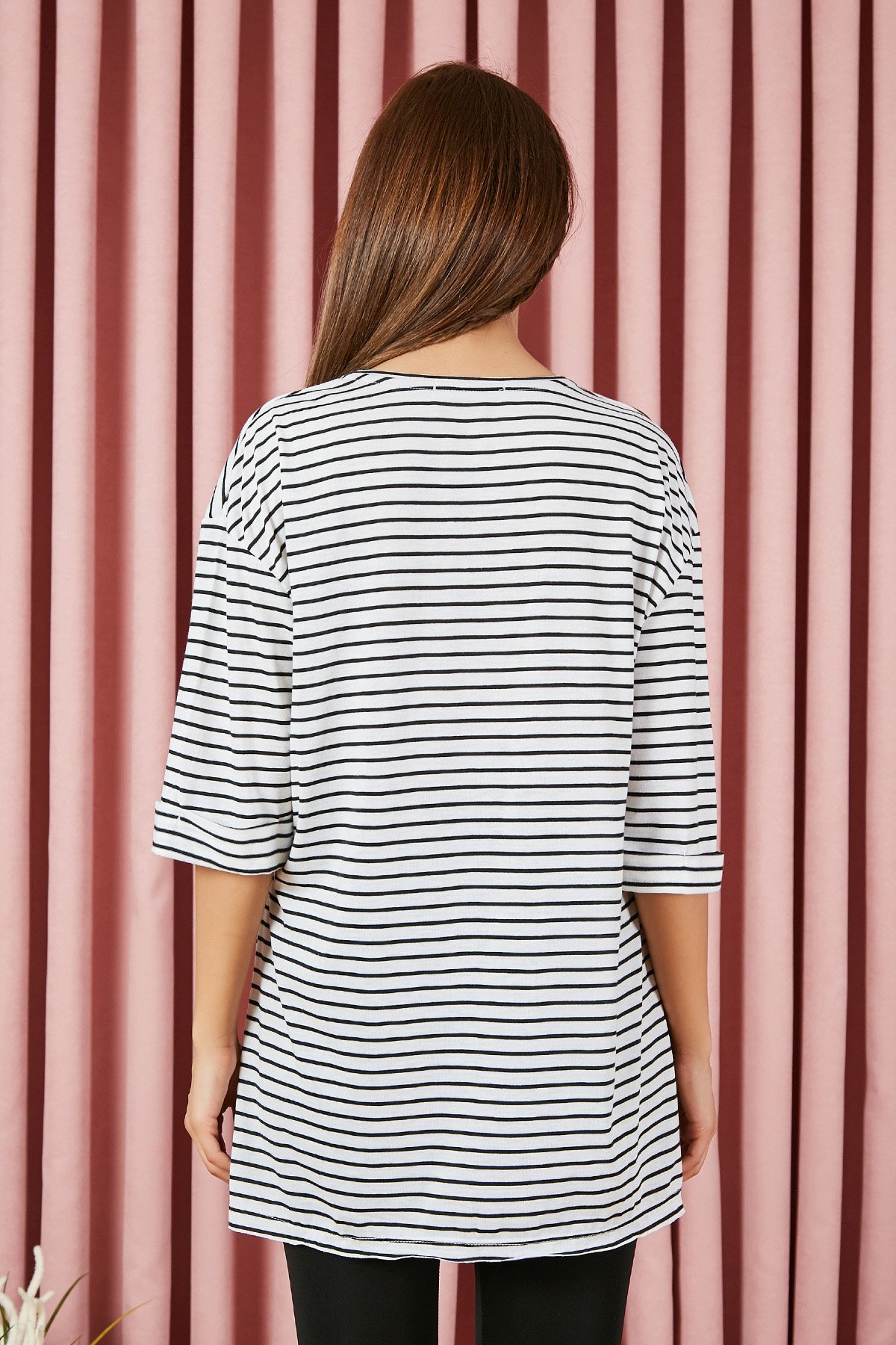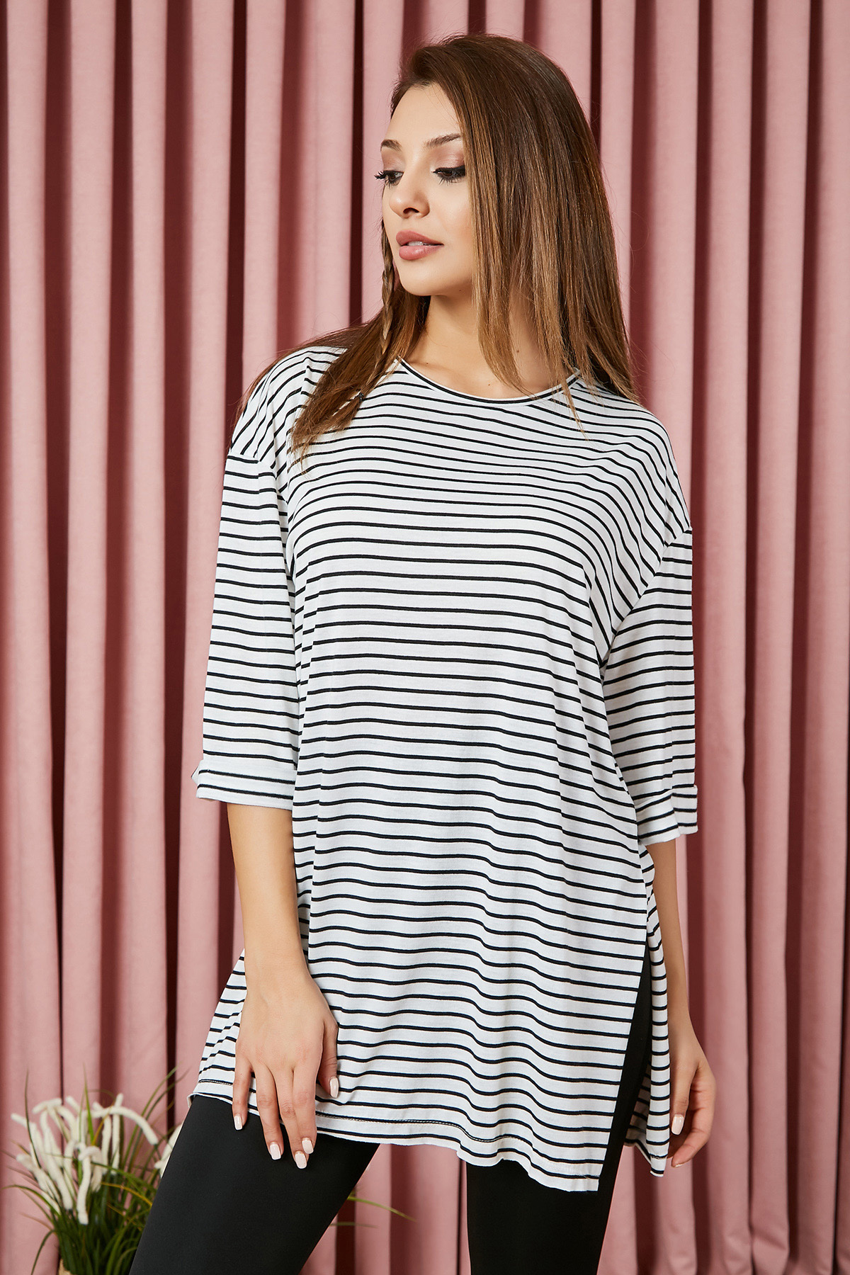 Bisiklet yaka, kısa kol, yanları yırtmaçlı, esnek, geniş kalıp t-shirt. %90 Pamuk %10 Elestan Boy Uzunluğu: 83 cm Modelin Üzerindeki Ürün S/M Modelin Ölçüleri :Boy:1,74, Göğüs:89, Bel:59, Kalça:93