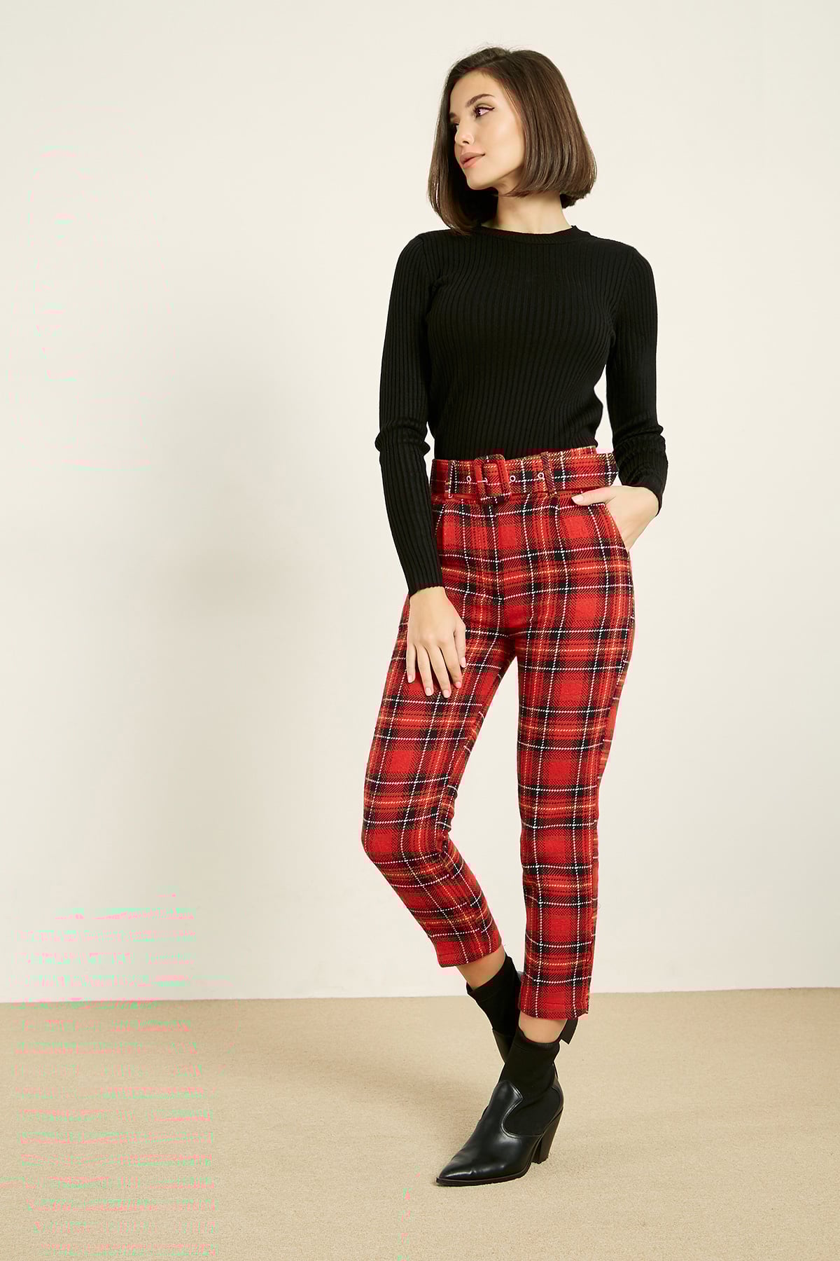 *Desenli Cigarette Pantolon *Ekose Desenli *Fermuar Kapama *Düğme İliklemeli *Kemer Detaylı *Yan Cepli *Pens Detaylı *Tam Kalıp %80 Pamuk %20 Polyester *Boy Uzunluğu: 89 cm Numune Bedeni: S/M Modelin Ölçüleri :Boy:1,74, Göğüs:88, Bel:64, Kalça:94