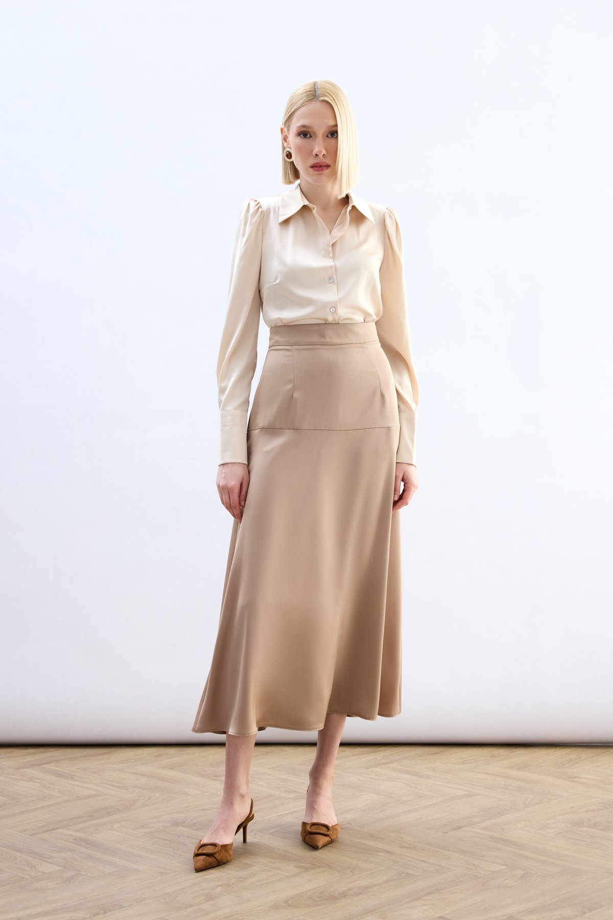 Yüksek Bel Saten Etek - Bej