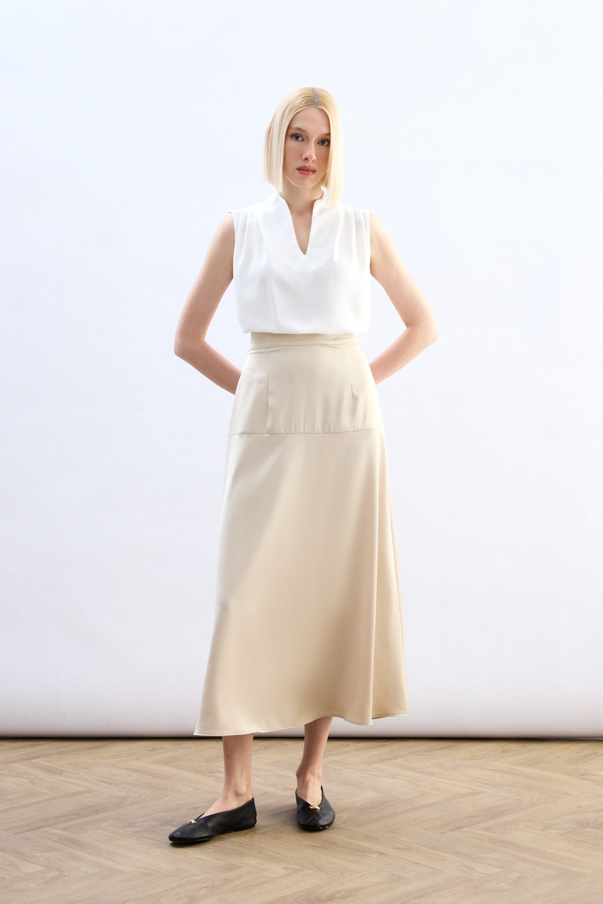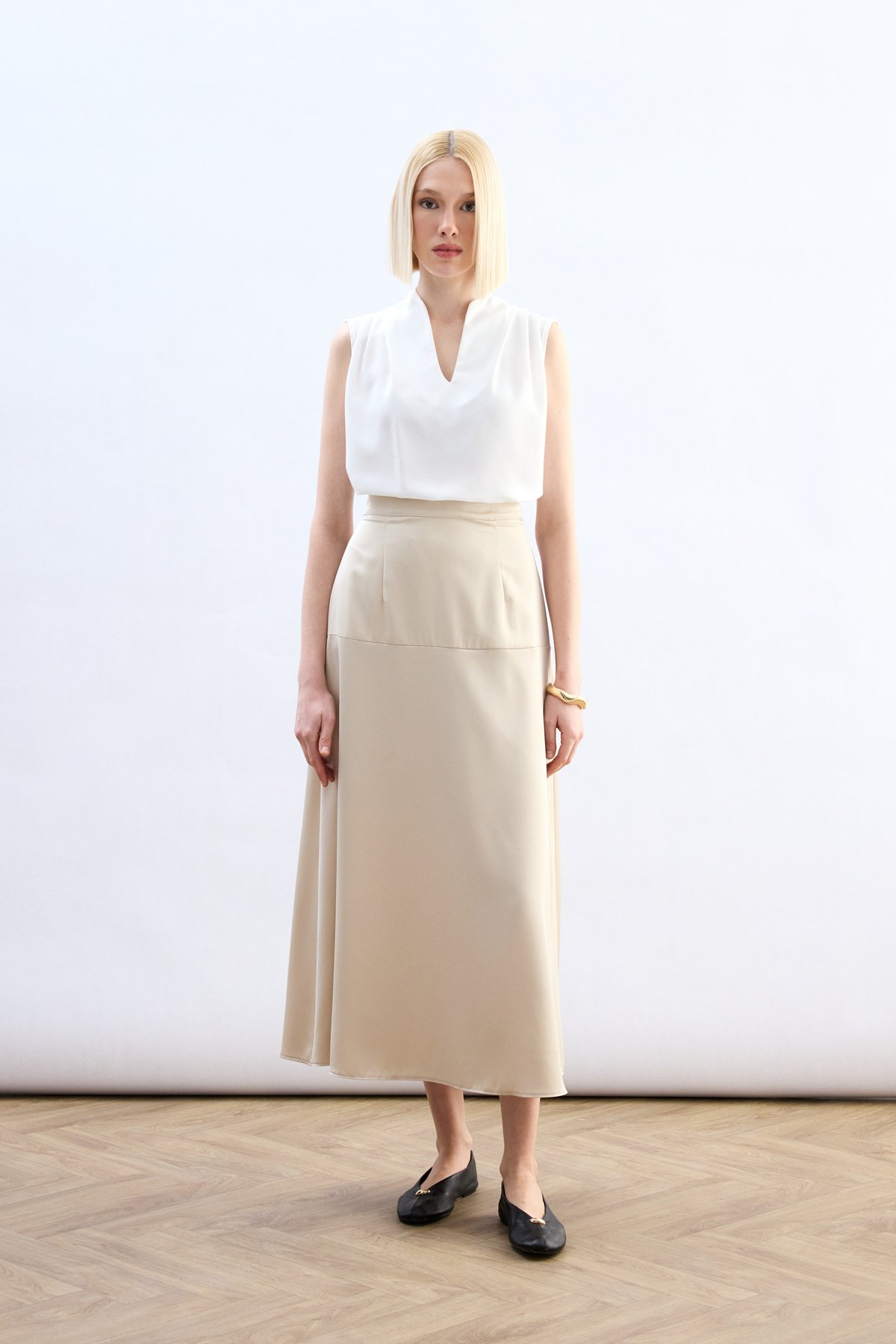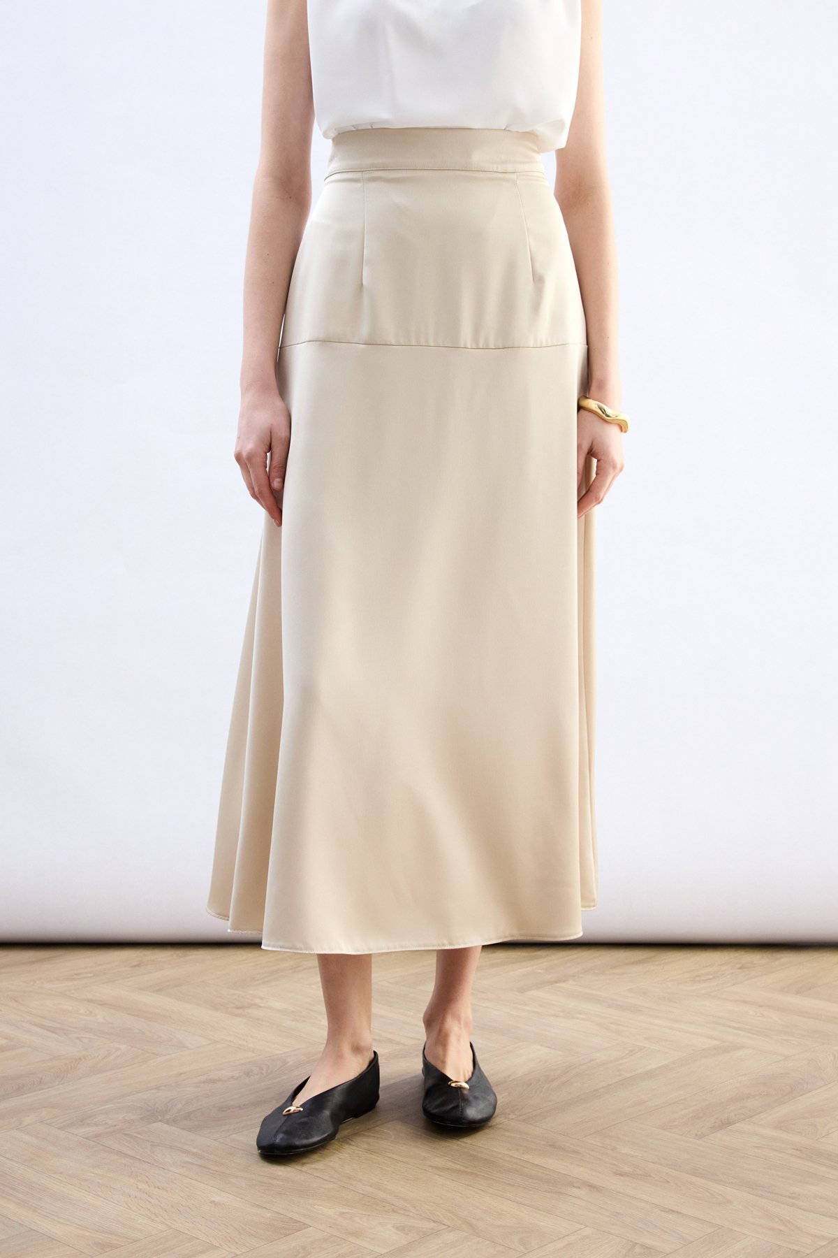 Yüksek Bel Saten Etek - Taş